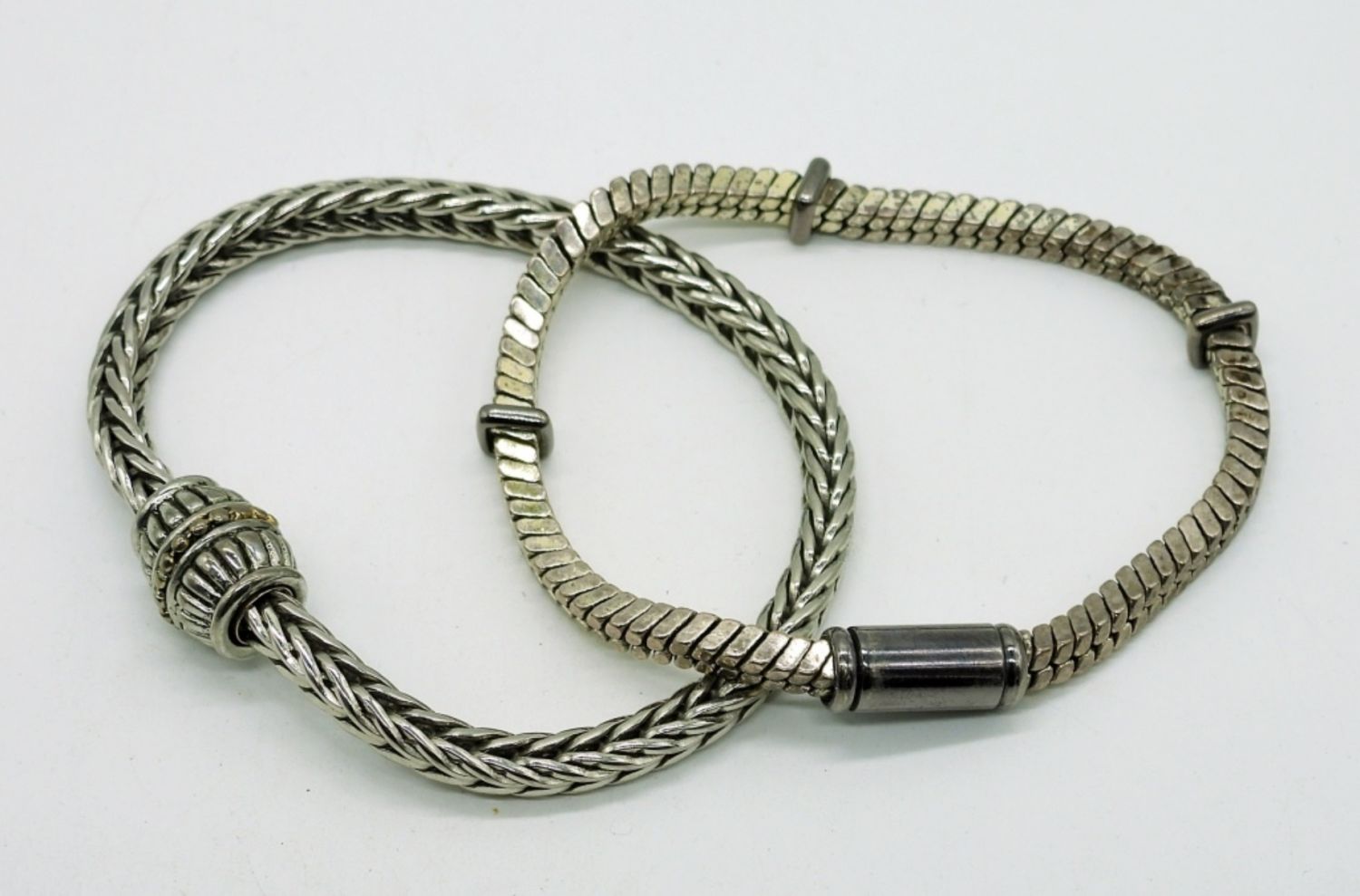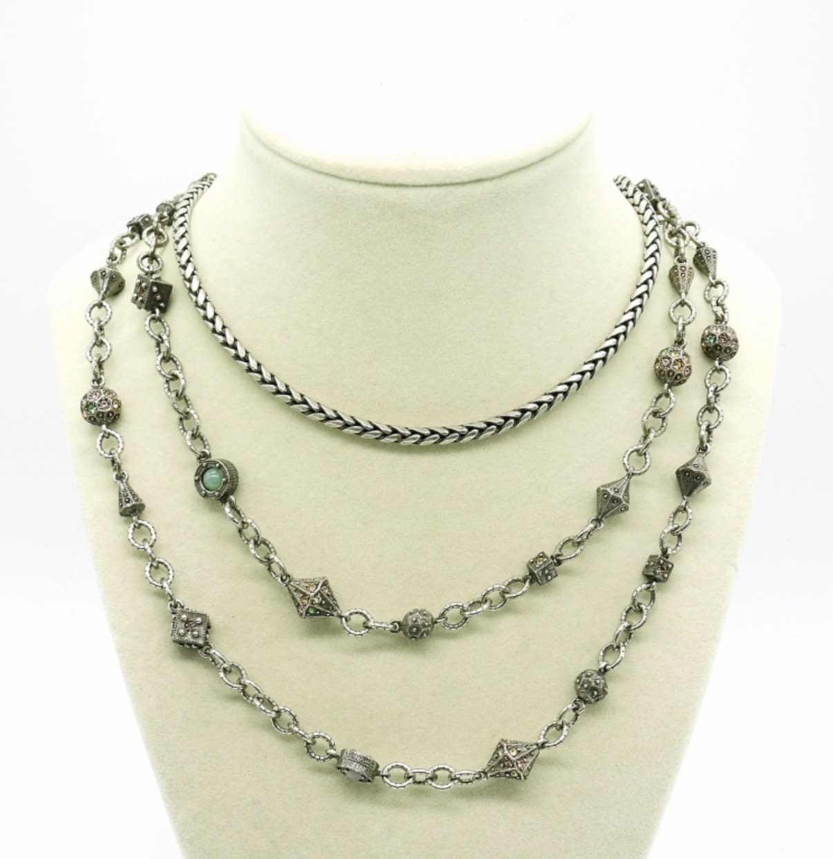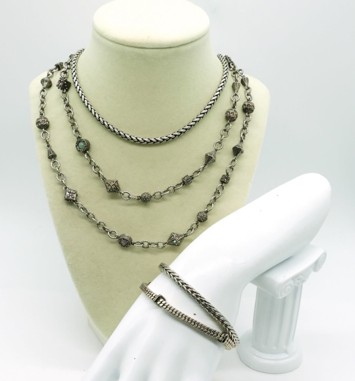 Two silver tone chunky necklaces, 18″ & 36″. Two chunky silver tone bracelets with magnetic clasps, 7″.