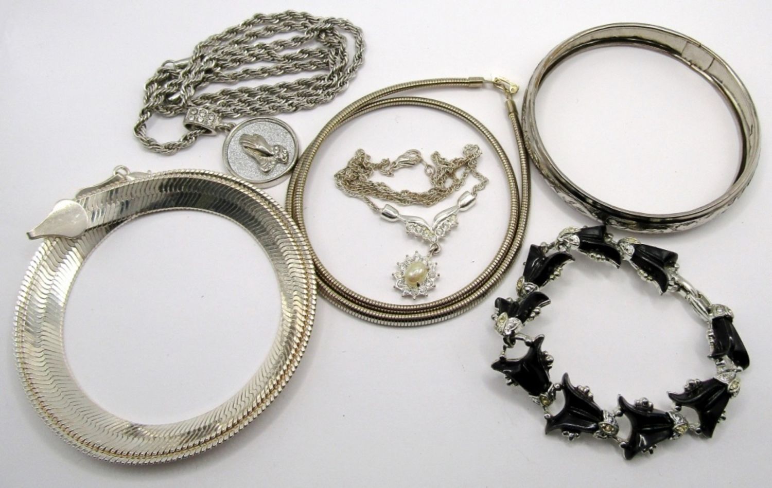Various style necklaces in various lengths (4). One bangle bracelet, one 7 inch clasp bracelet.
