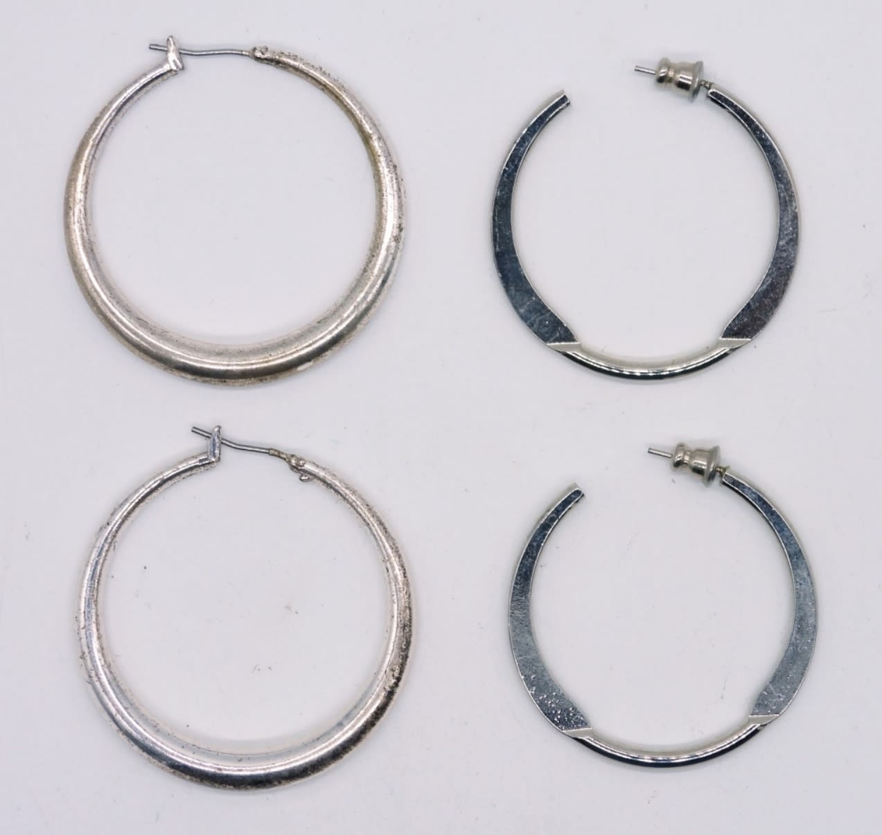 This features one silver tone closed hoop pair, one silver tone open hoop pair, and two pair of gold tone open hoop stud back earrings (one is missing the backs).