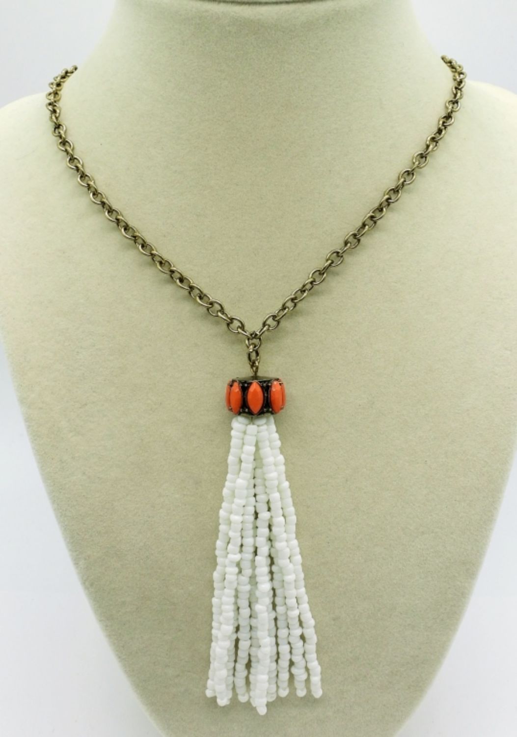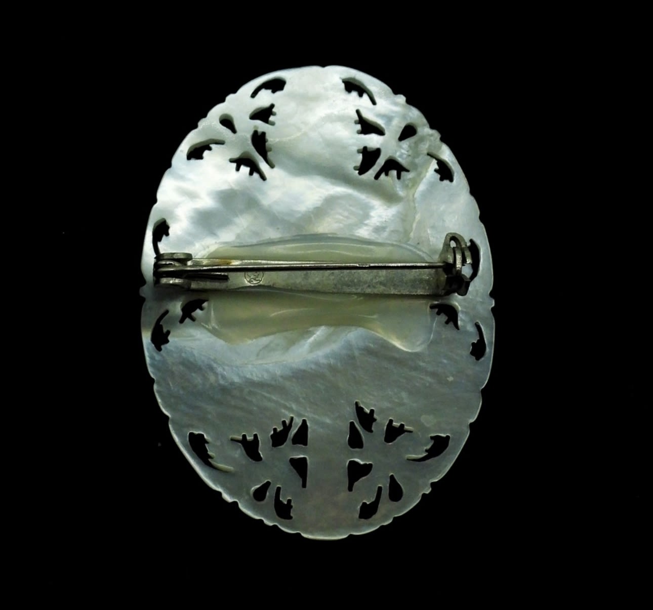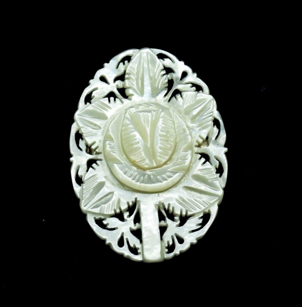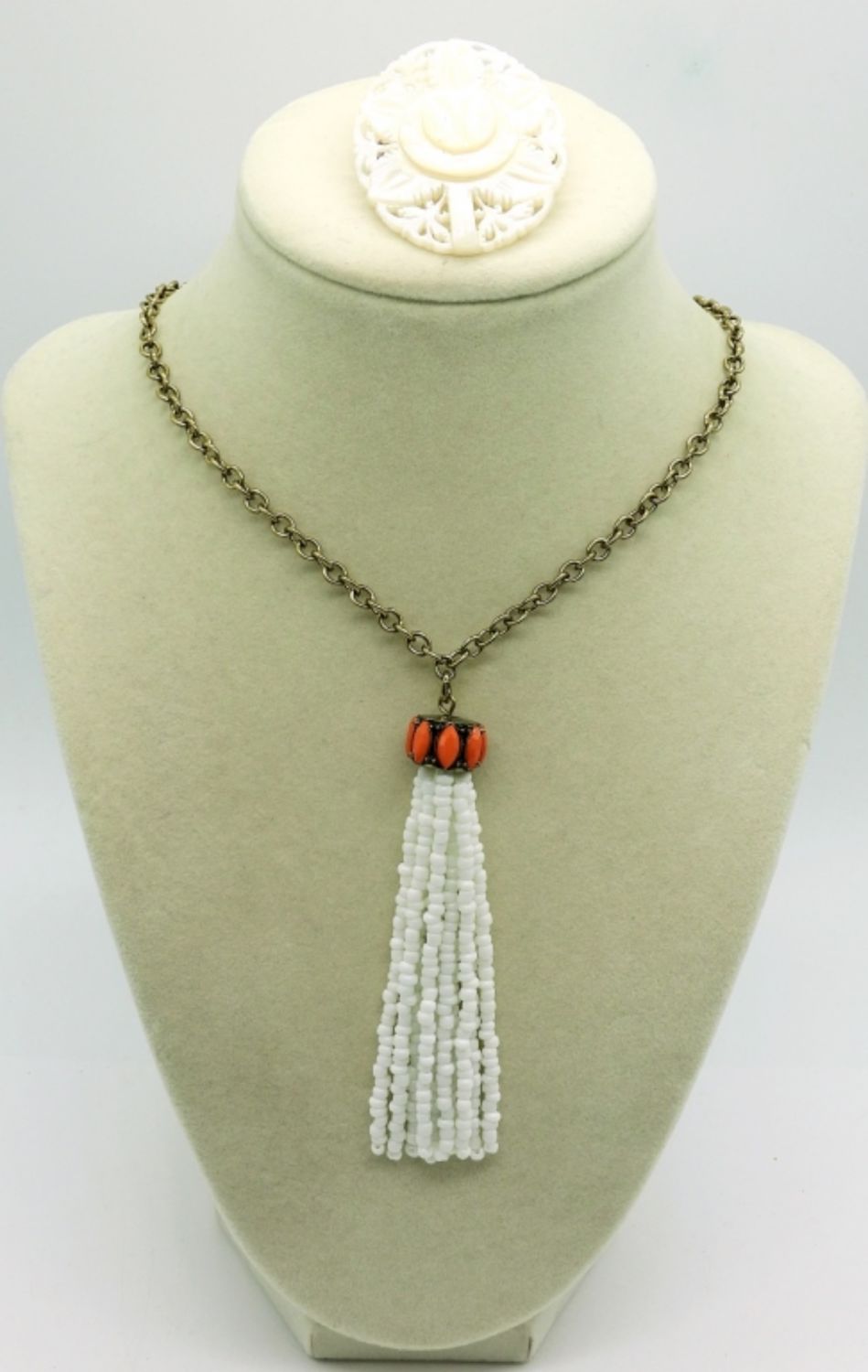 Vintage Carved Mother of Pearl Brooch and a Gold tone white beaded necklace. Brooch is 2″ x 1.5″. Necklace is 36″.