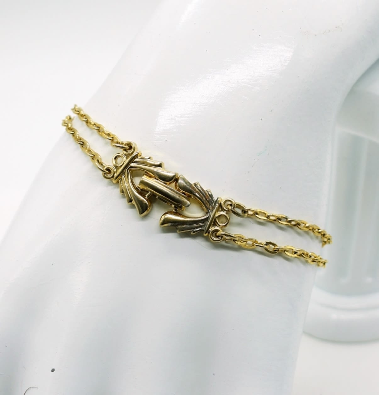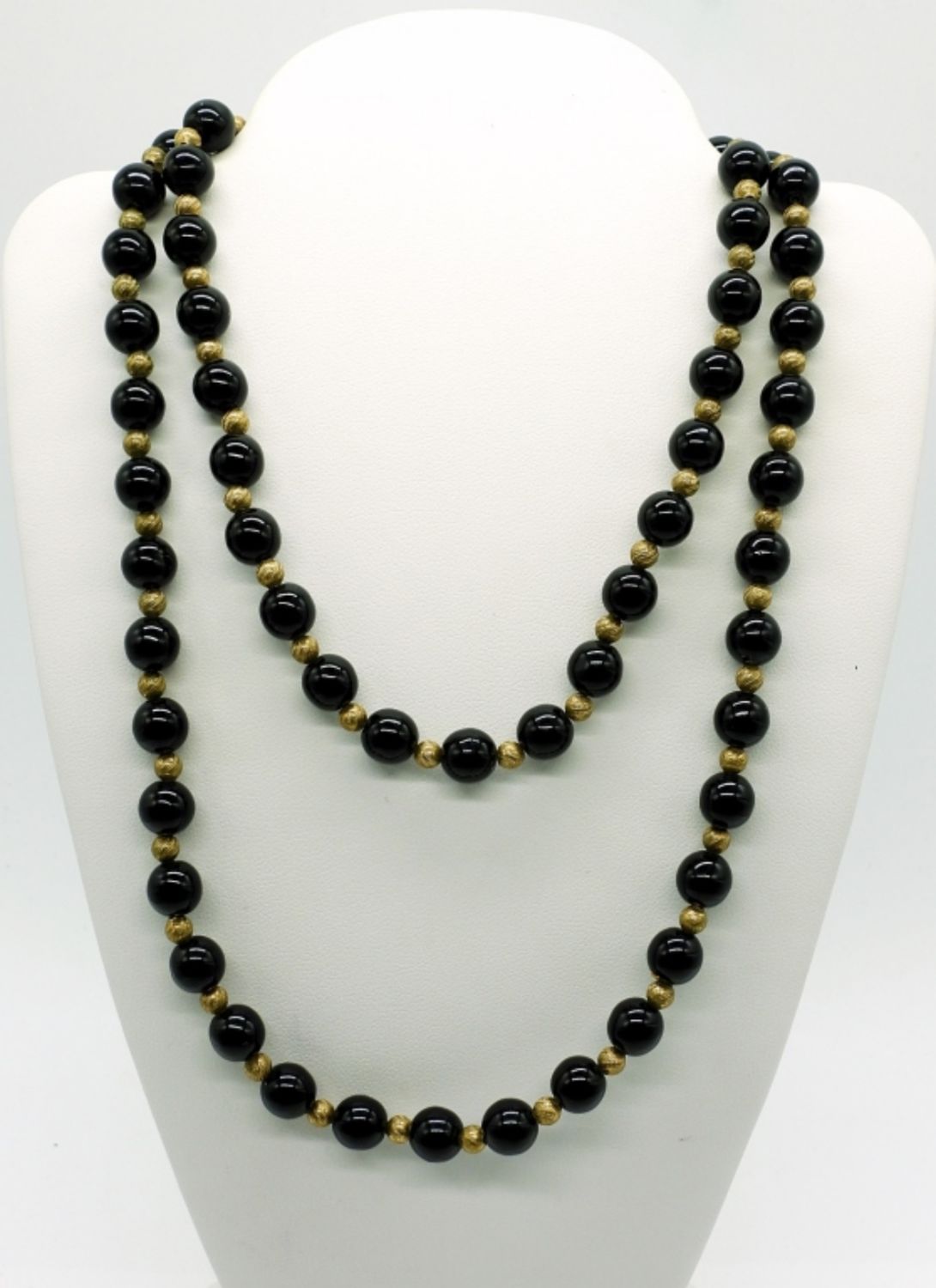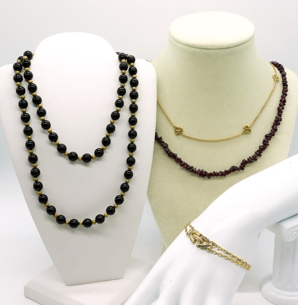 19″ Garnet Beaded necklace. Gold tone 17″ chain. Gold tone double strand 7″ bracelet with ornate clasp. 30″ Black and Gold Beaded Vintage Necklace.