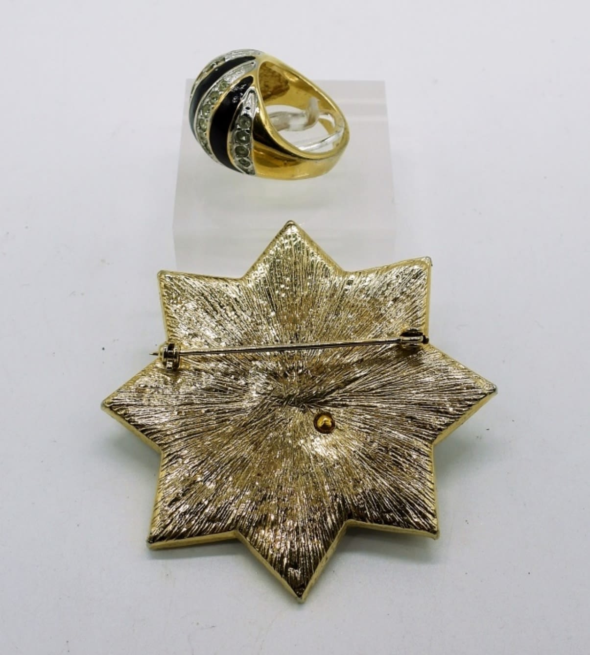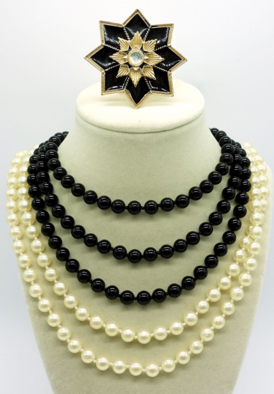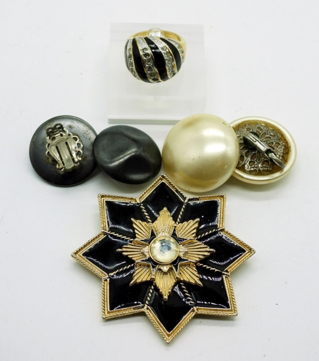 Two Lady Remington Vintage 48″ Faux white pearl and Heavy black beaded necklaces. Marked “LR” tag at clasps. Vintage Clip On Earrings, One pair Black 1″x1″ and One pair White 1″x1″. Black and Gold tone Vintage Brooch with clear center gemstone. Ring is size 6 and marked 18KHGE.