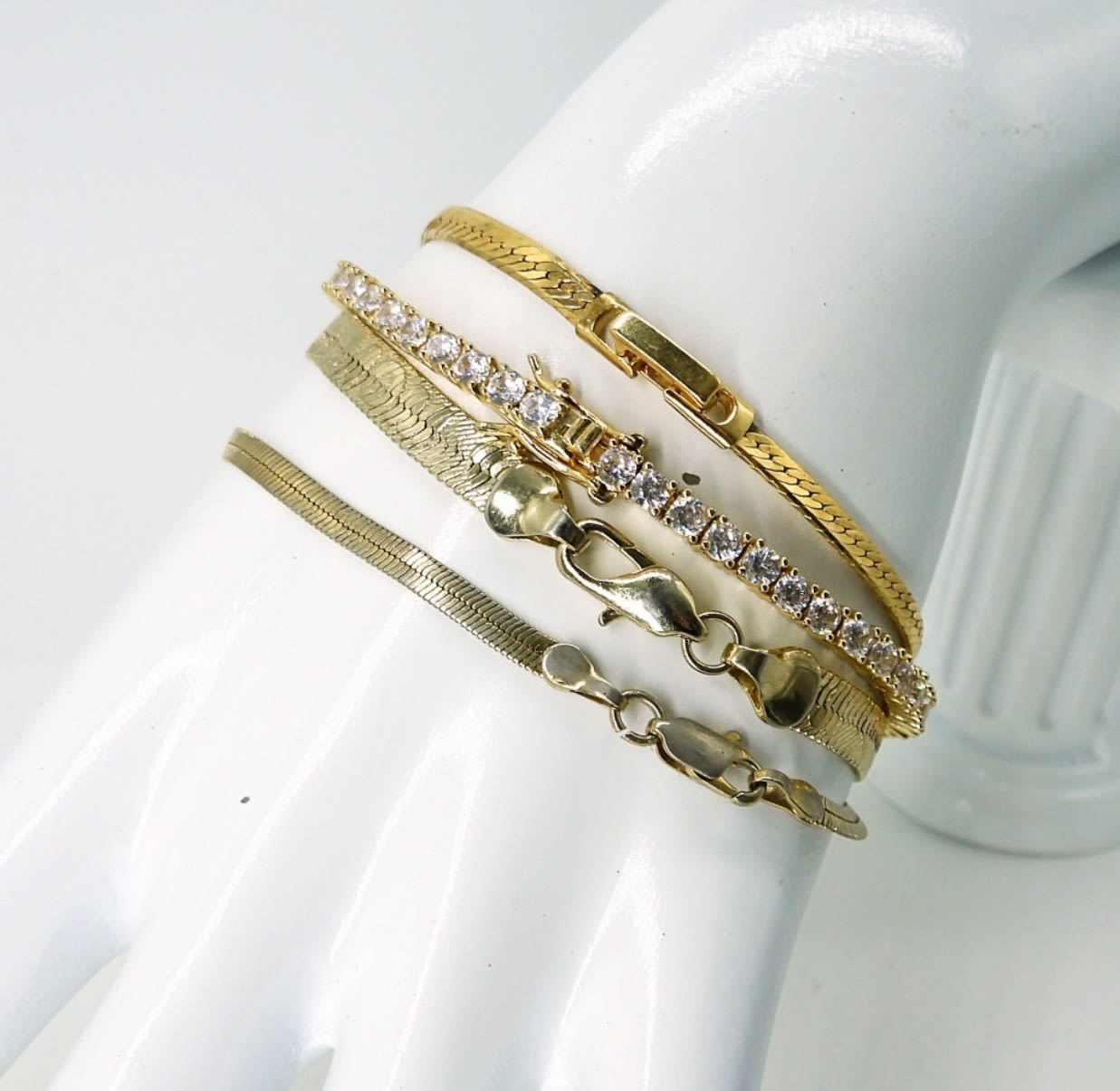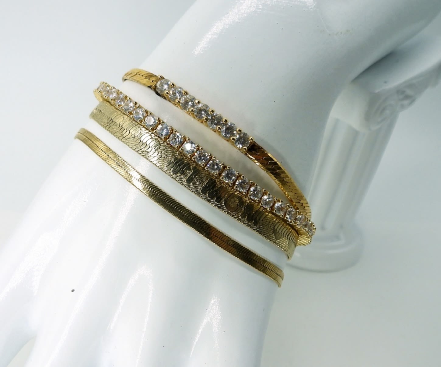 Four Gold Tone & White Gemstone Bracelets, 7″.