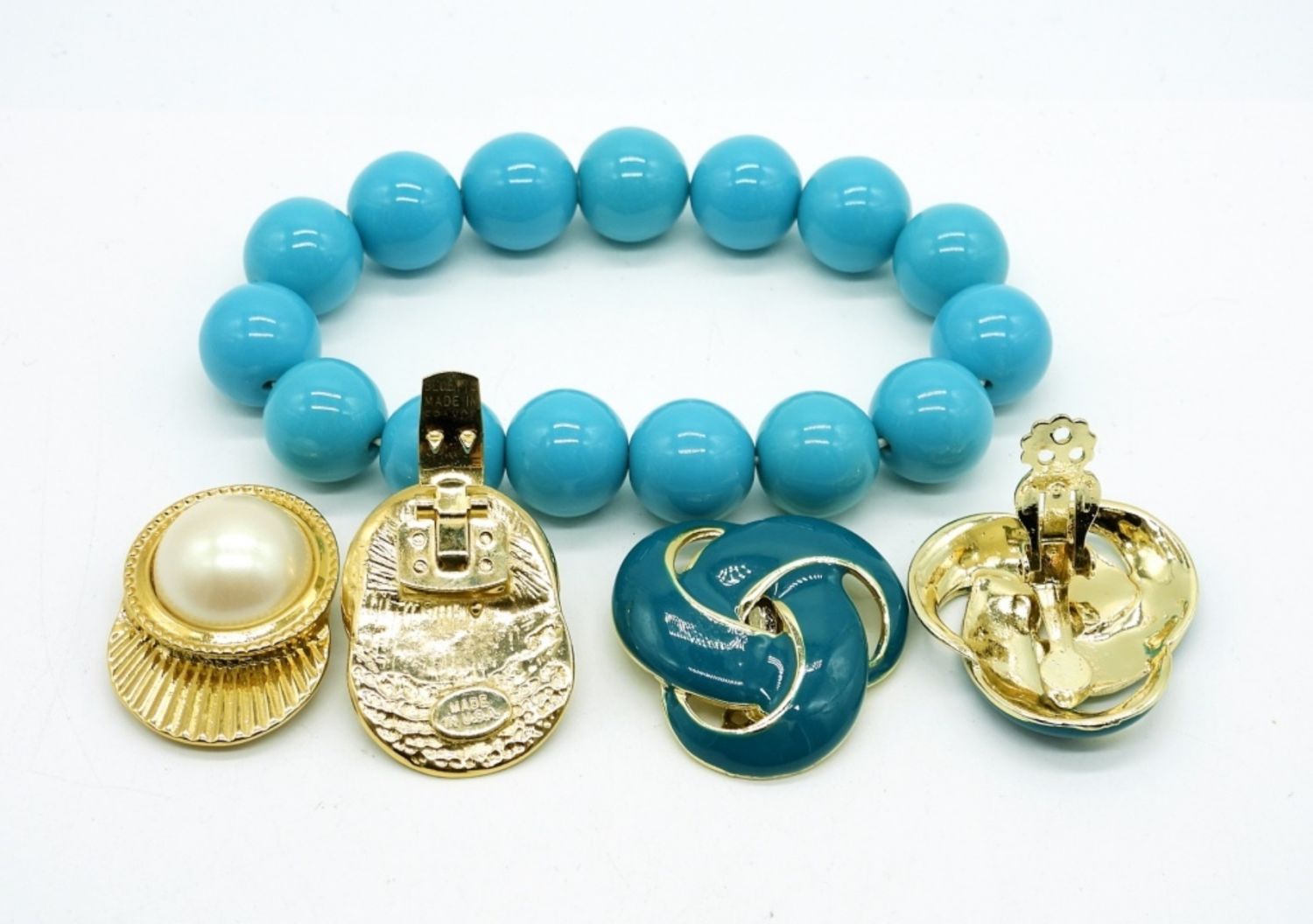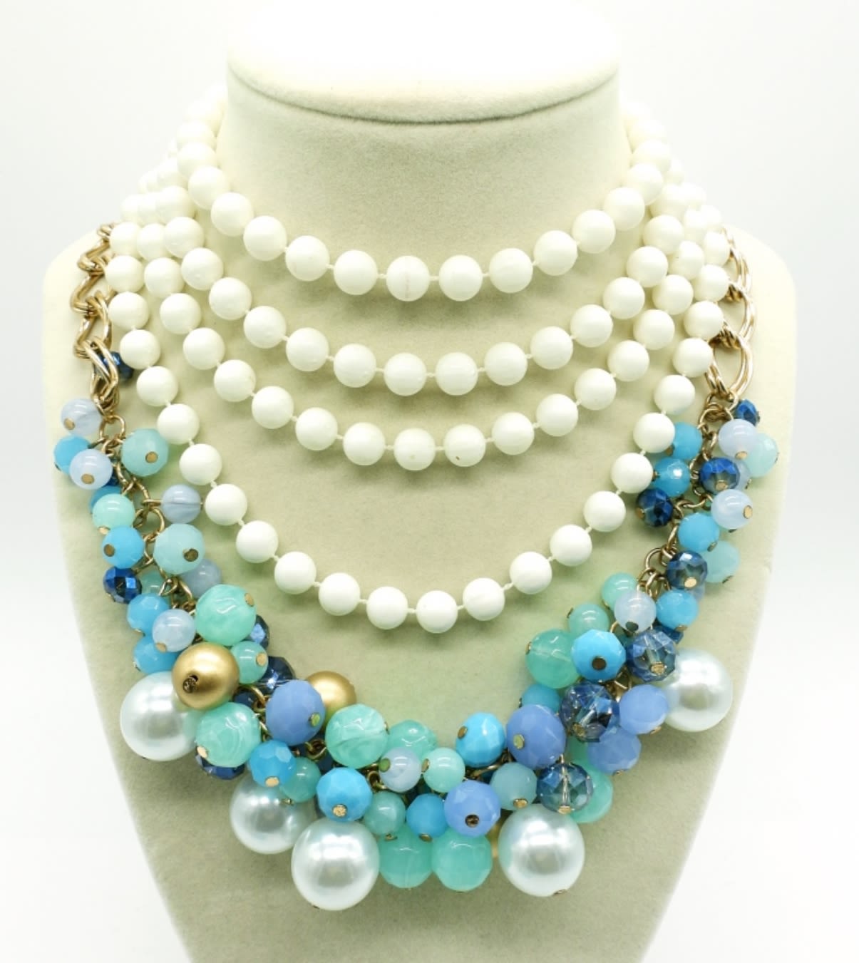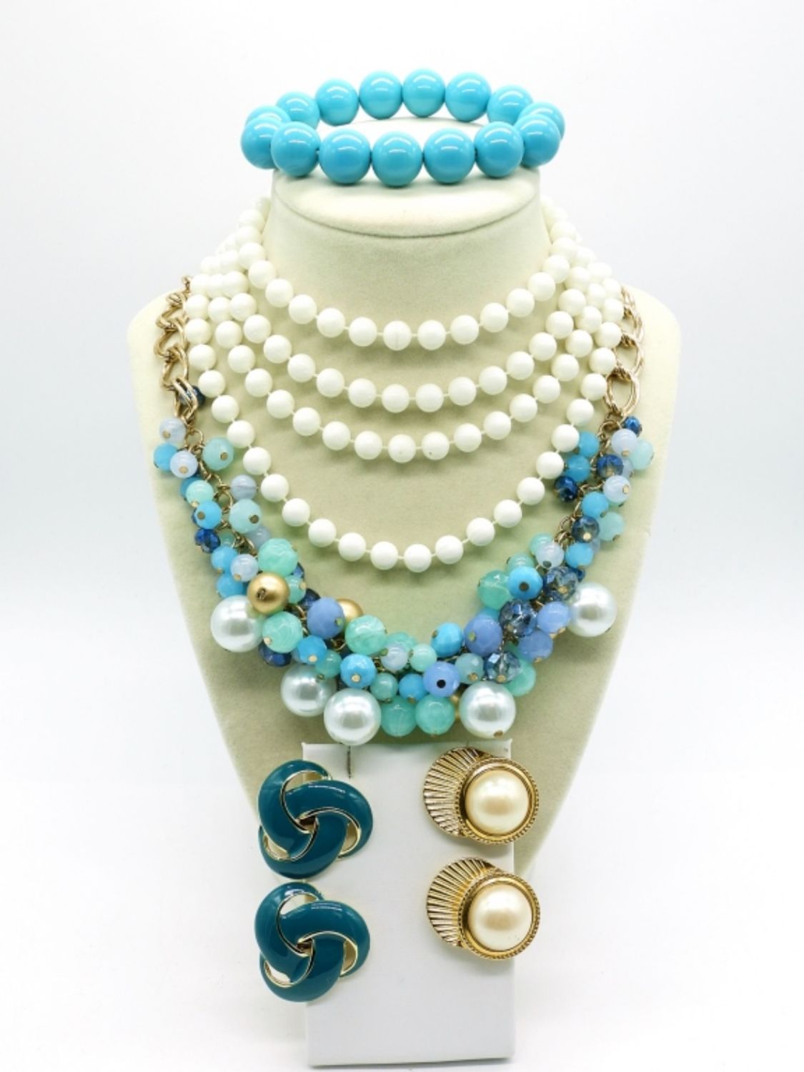 Gold tone 19″ Blues & White Beaded Bauble Necklace. Vintage white plastic beaded necklace, 52″. Vintage blue chunky beaded bracelet, 8″. Two pair of vintage clip on earrings in gold tone in blue and white.