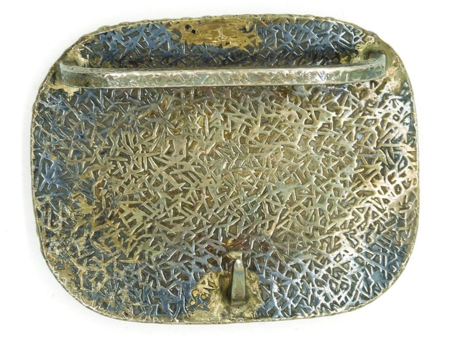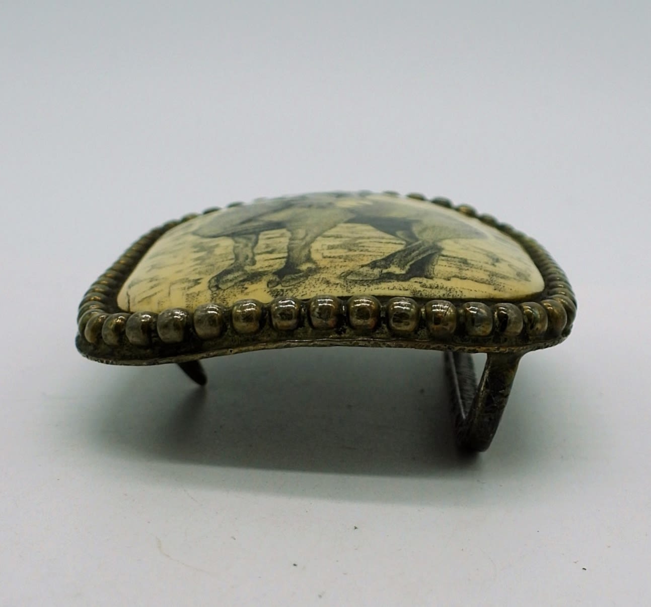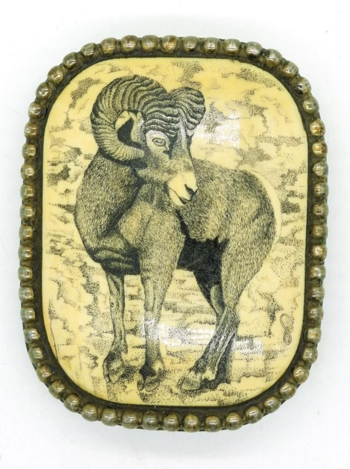 Silver Tone Belt Buckle with the photo of a Ram in black and tan. 3″x 2″.