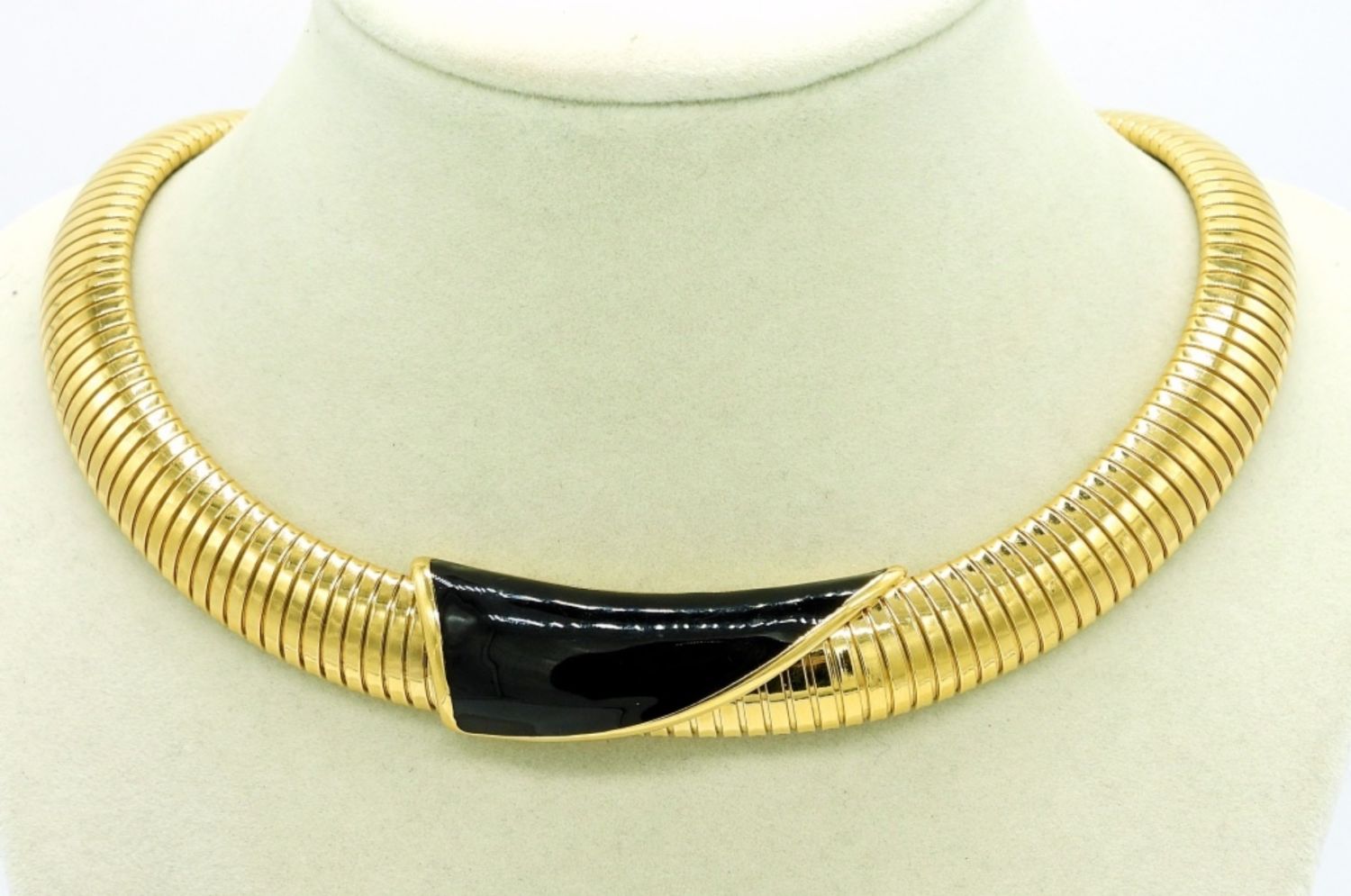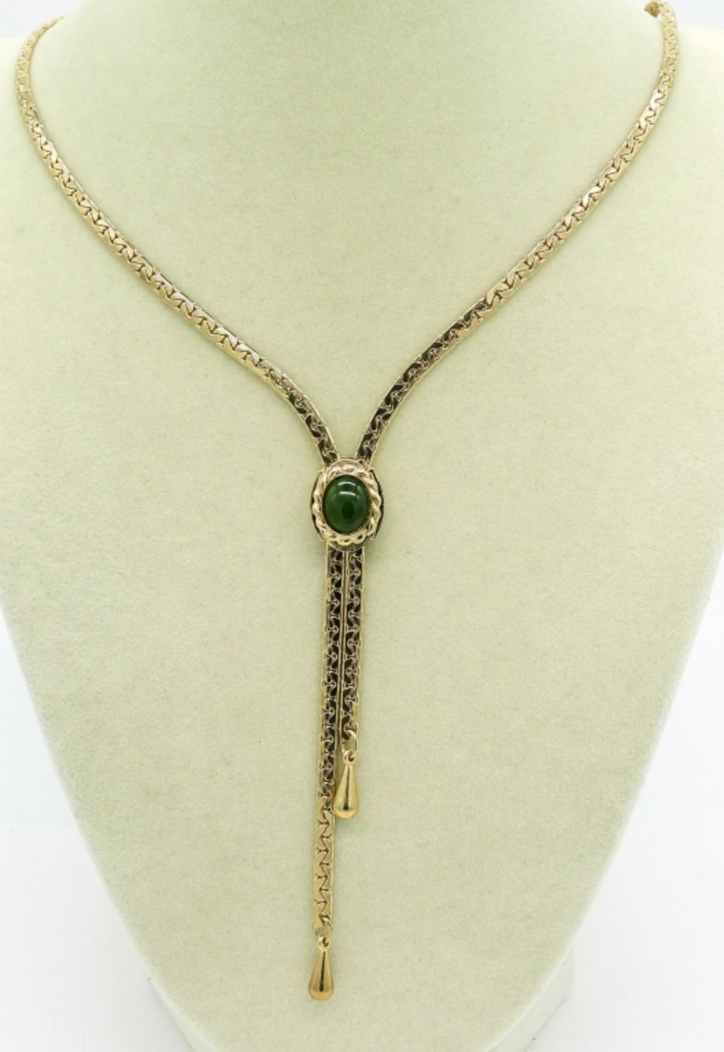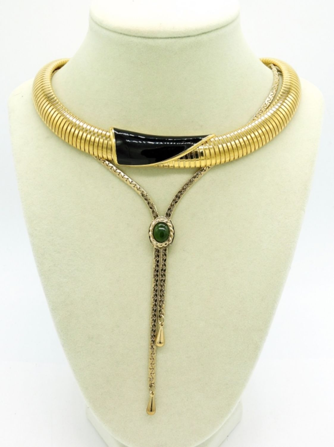 Hobe Brand, Gold Tone Lariat Necklace with Green Gemstone, 25″. Monet Brand, Gold Tone Collar Necklace, Circa 1980’s with Black and Gold Slide. 16″.