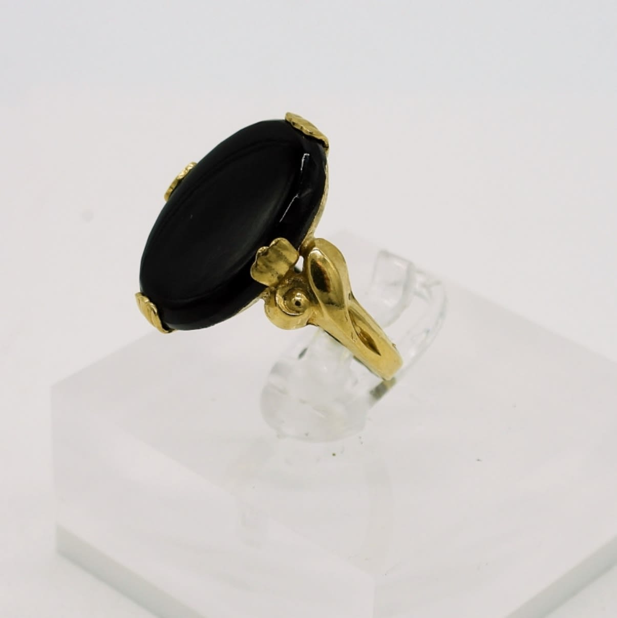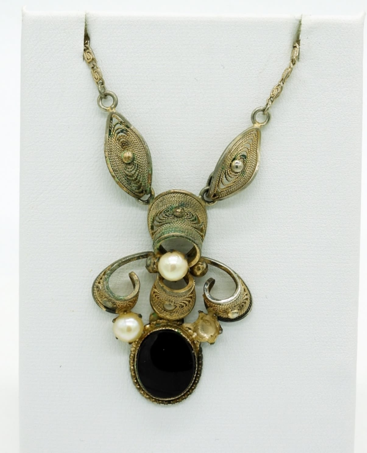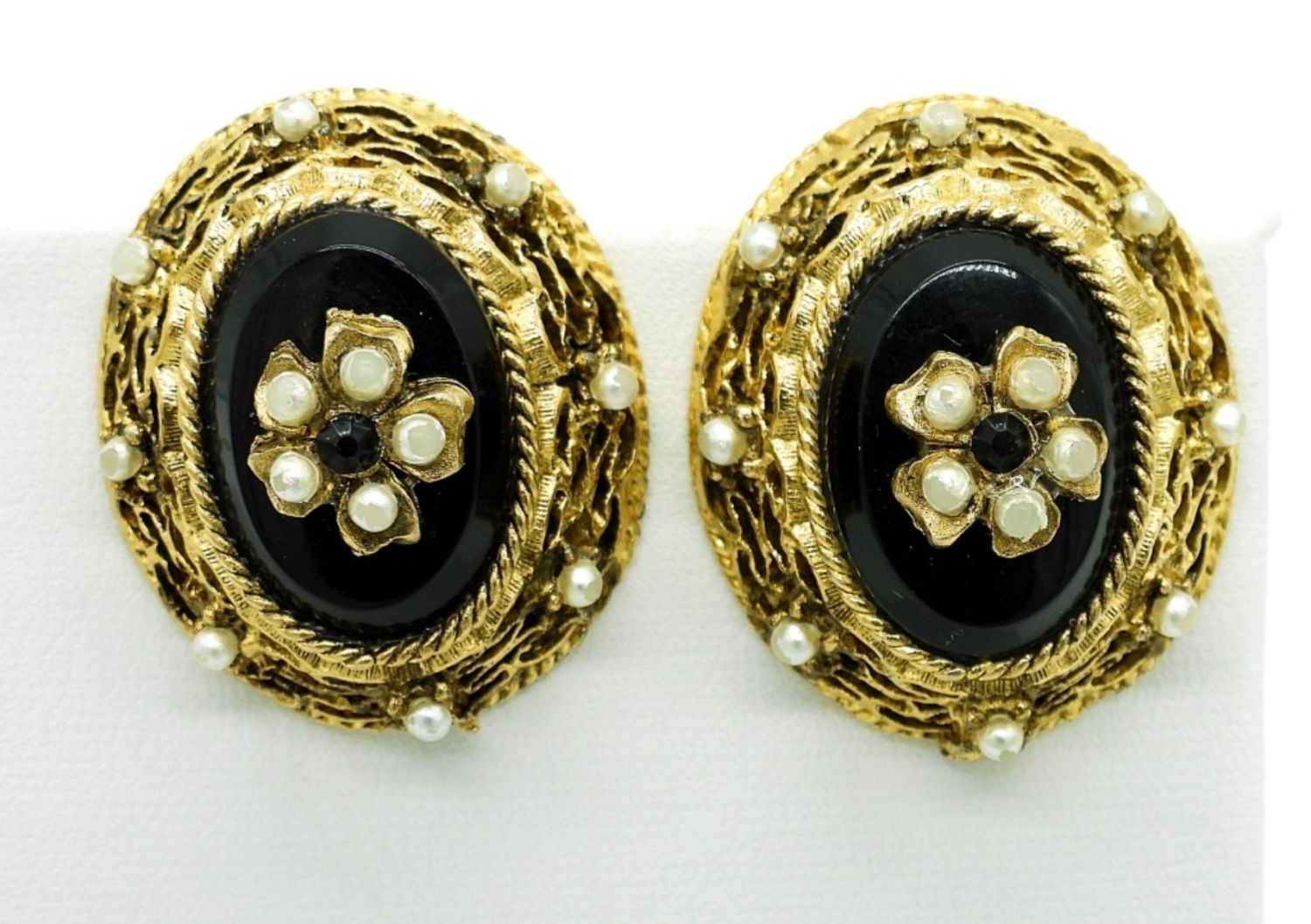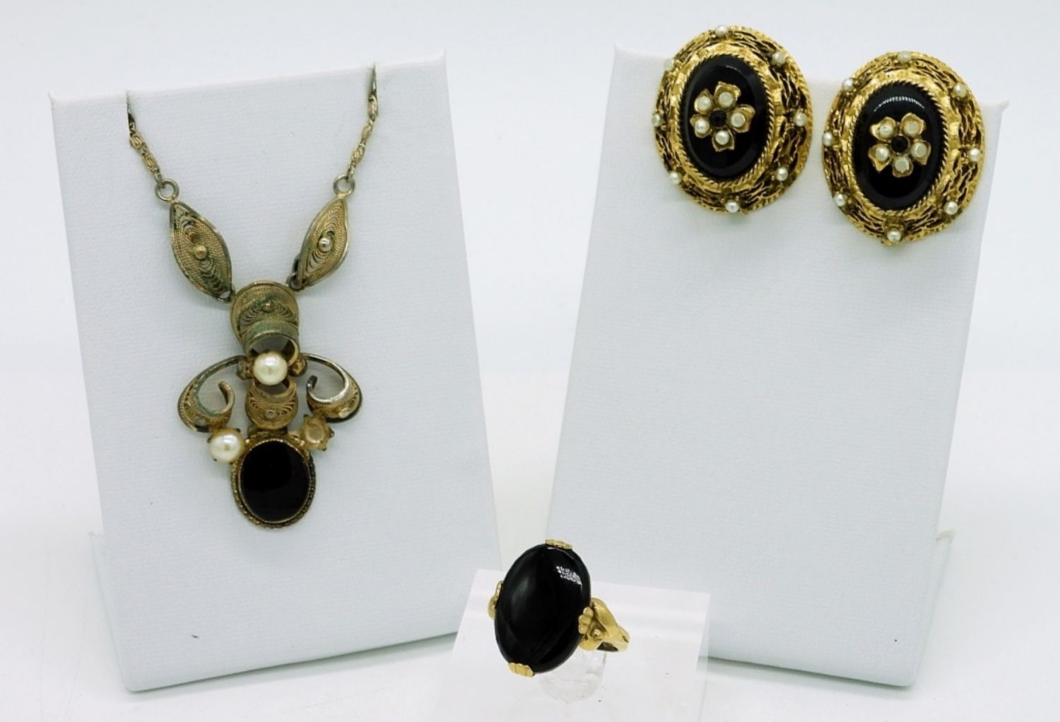 Vintage Gold Tone, 12K Gold Filled “Espo” Brand Necklace with a Black Gemstone (missing one pearl accent), 15″. Gold Tone, Size 5 Ring with Black Gemstone. Vintage Gold Tone Clip On Earrings with Black Gemstones and Tiny Faux Pearls.