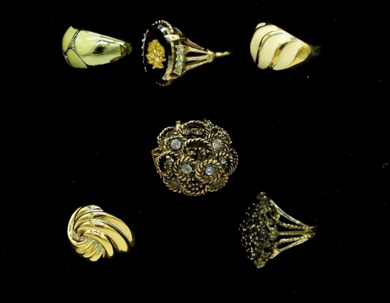 Six Gold Tone Vintage Rings. Some with Gemstones, Some with Enamel. Sizes 6, 6.5, 6 3/4, 8 & 9.