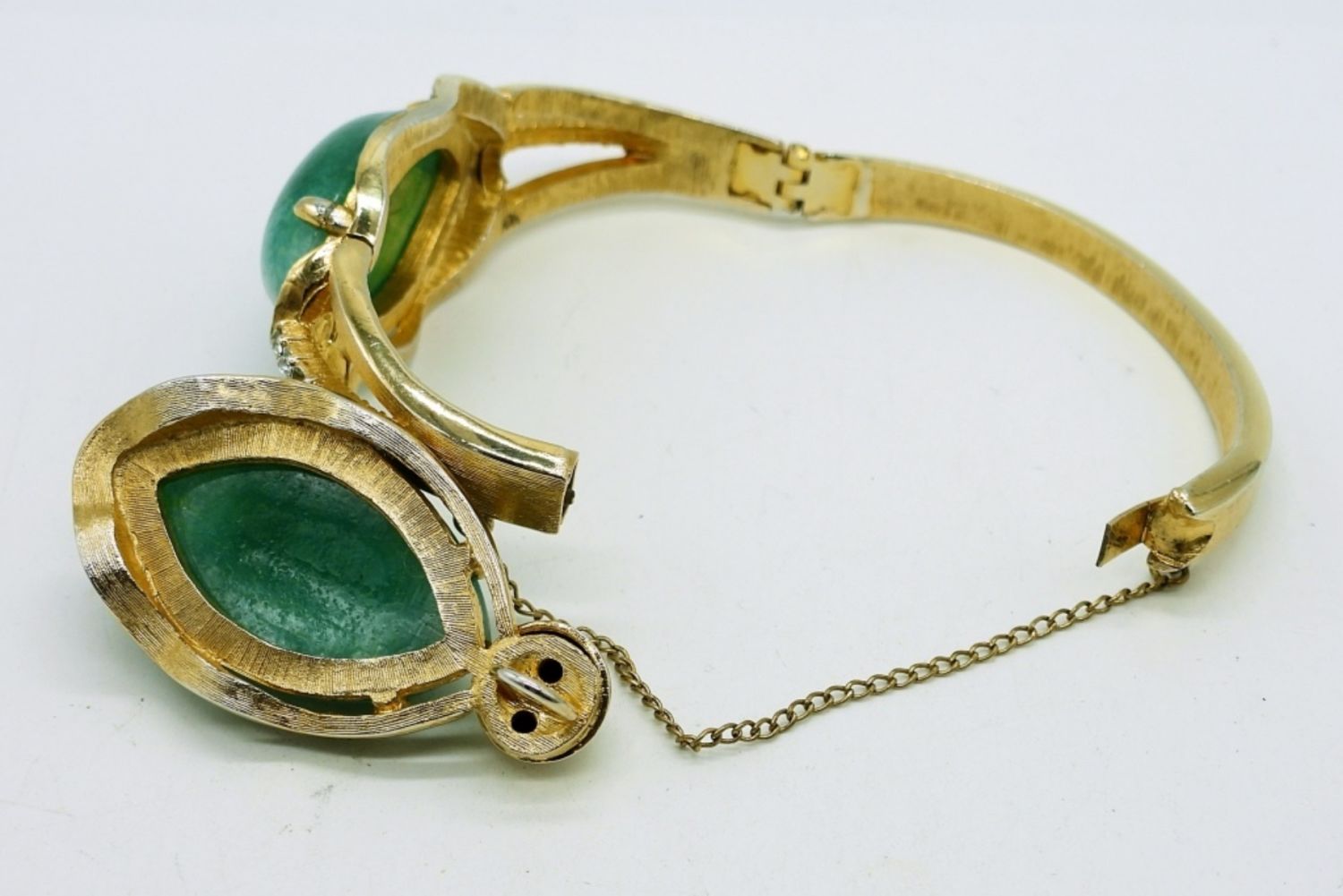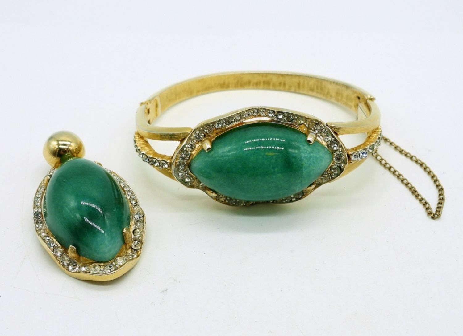 Gold Tone Bracelet with Large Green Gemstone and small white gemstones (7.5″), Latch needs to be repaired. Matching Pendant, 1 3/4″x 1″.