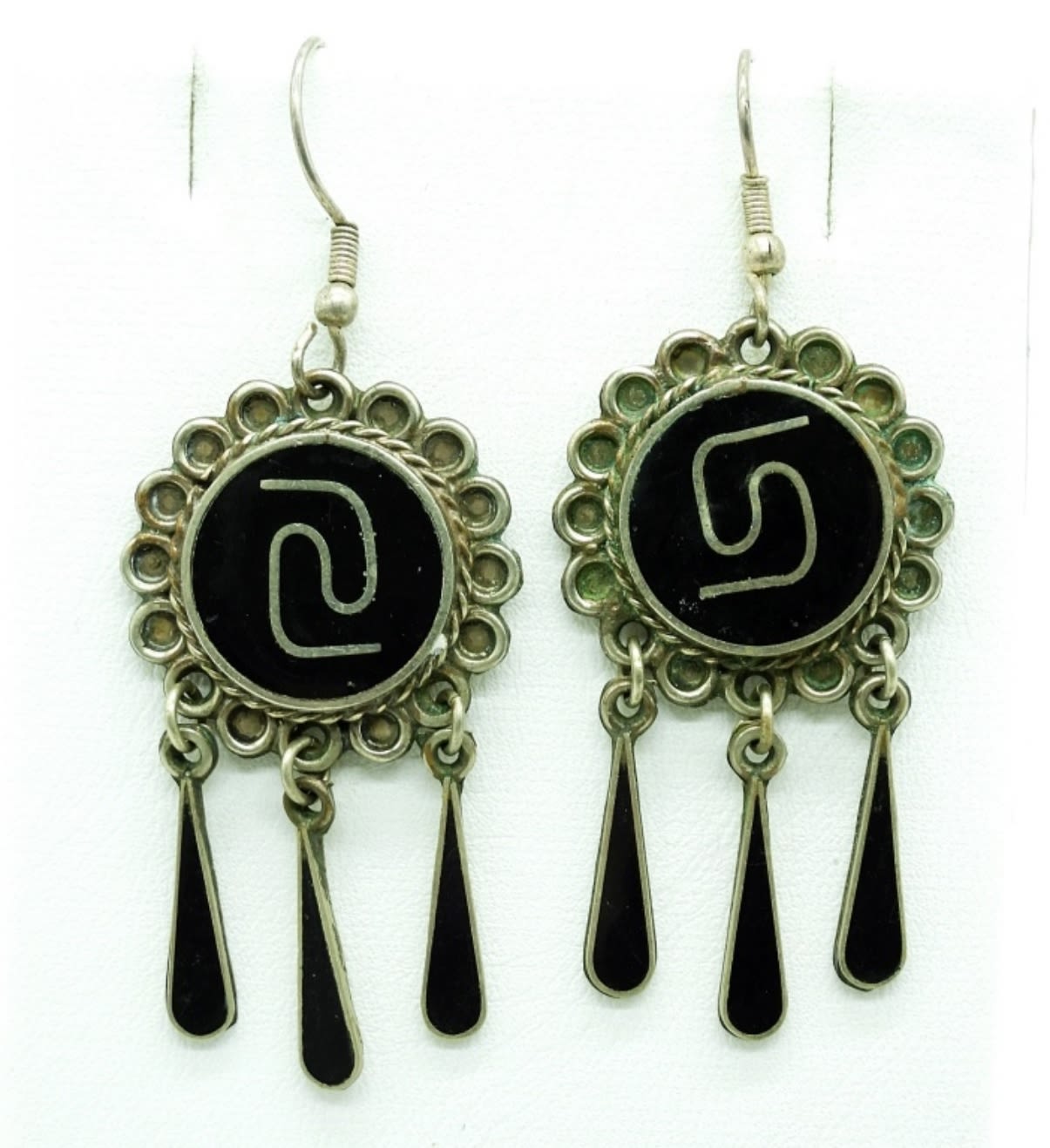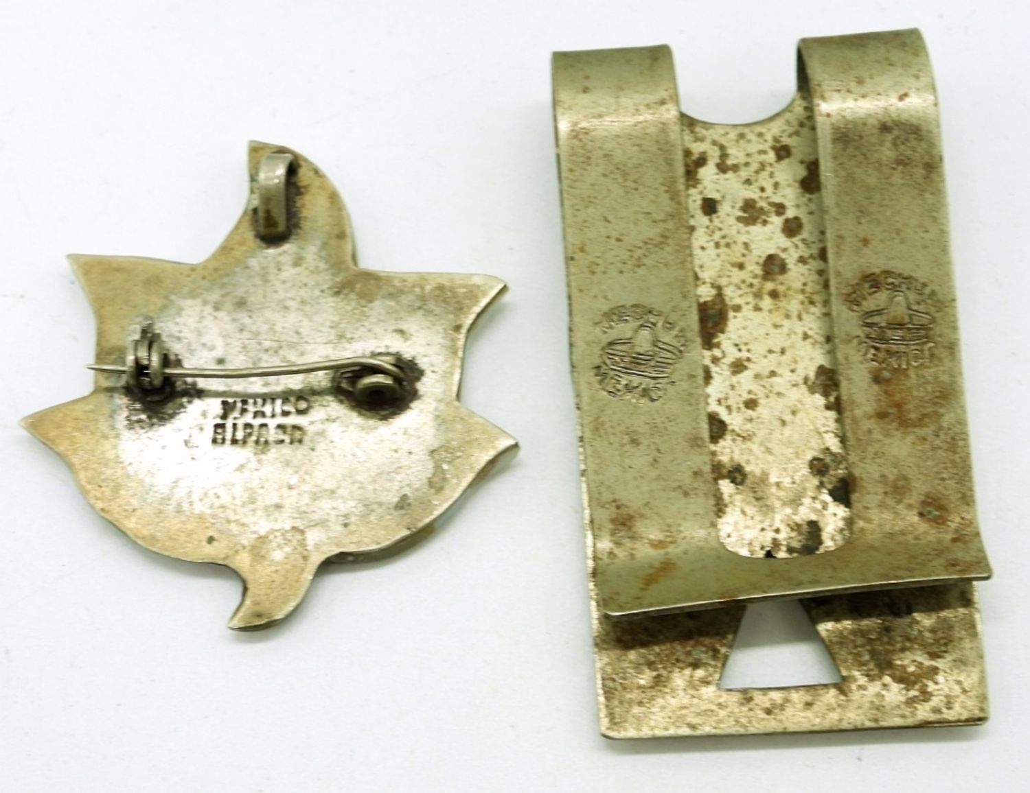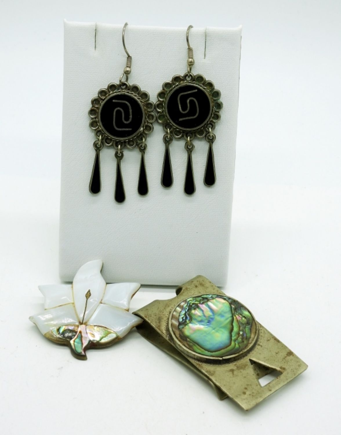 Silver Tone, Alpaca Mexico Brand, Mother of Pearl & Abalone Pin. Silver Tone, Alpaca Mexico Brand Earrings with Black Inlay. Silver Tone, Abalone Shell Money Clip (Hecho en Mexico – Stamped).