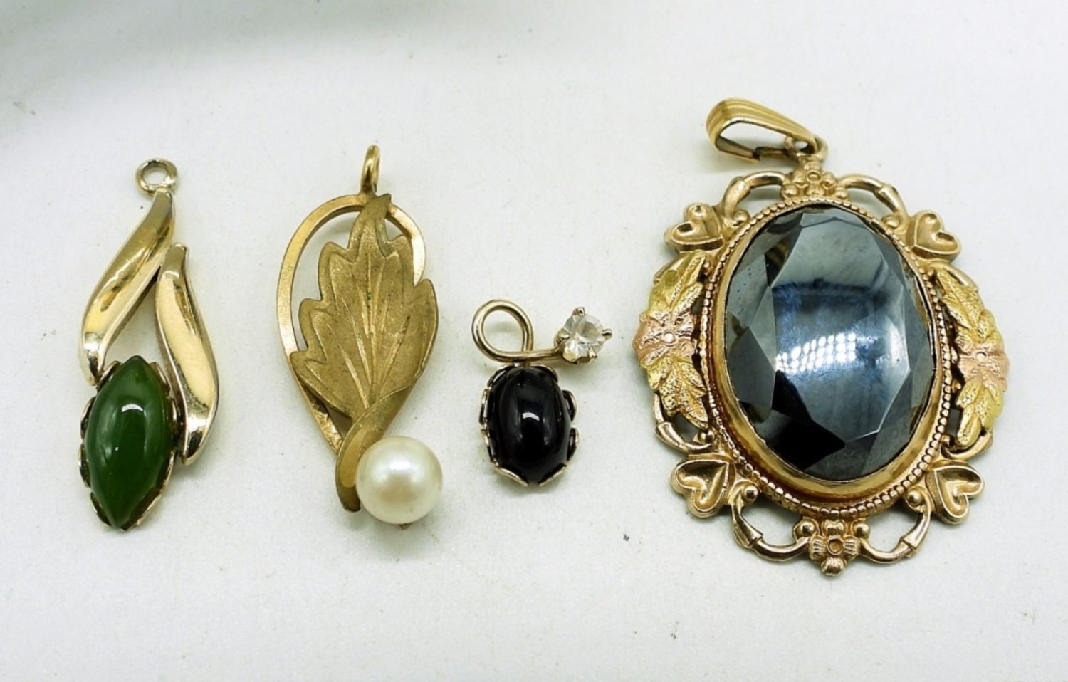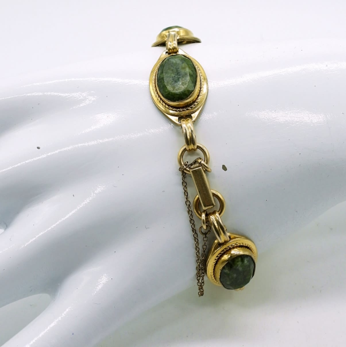 Vintage Gold Tone DANECRAFT 12K Gold Filled Green Aventurine Bracelet in Beautiful Condition! Three Gold Tone Pendants, Marked “dec 14KGF”. One gold tone pendant with Shiny Black Gemstone.