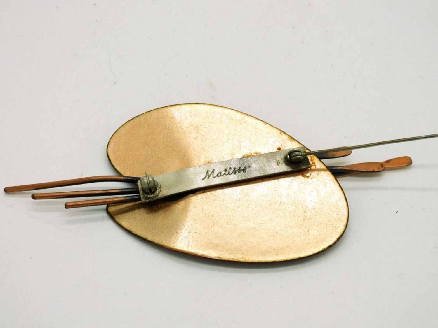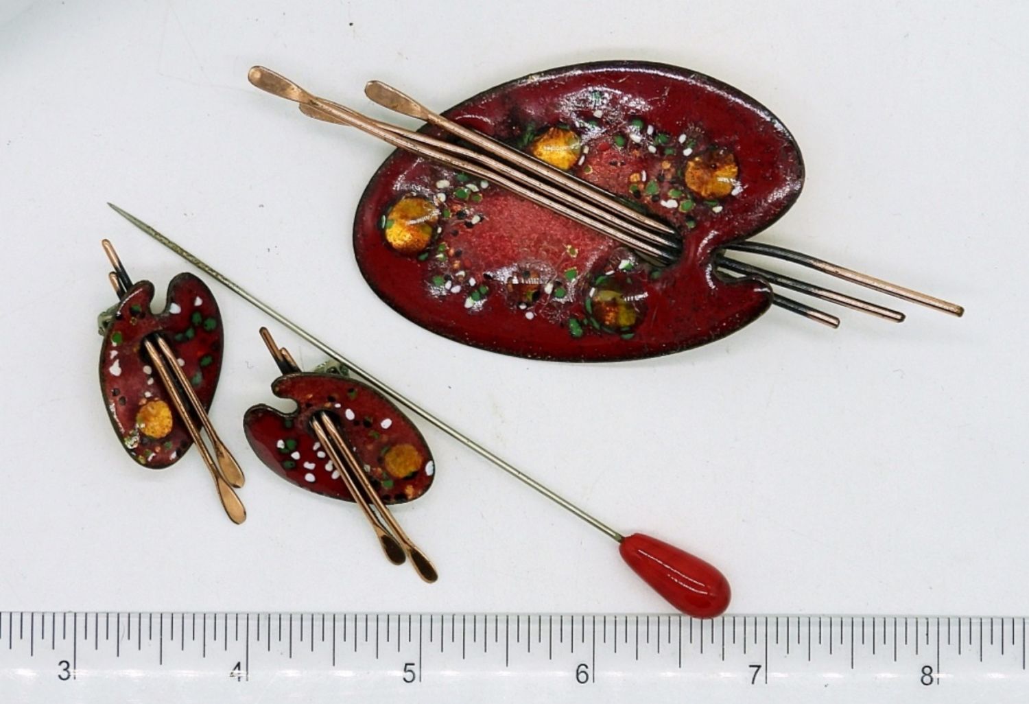Vintage Red Matisse Renoir Signed Palette Brooch & Clip Earrings, & Red Enameled Hat Pin. These are in wonderful condition, just need a good cleaning!