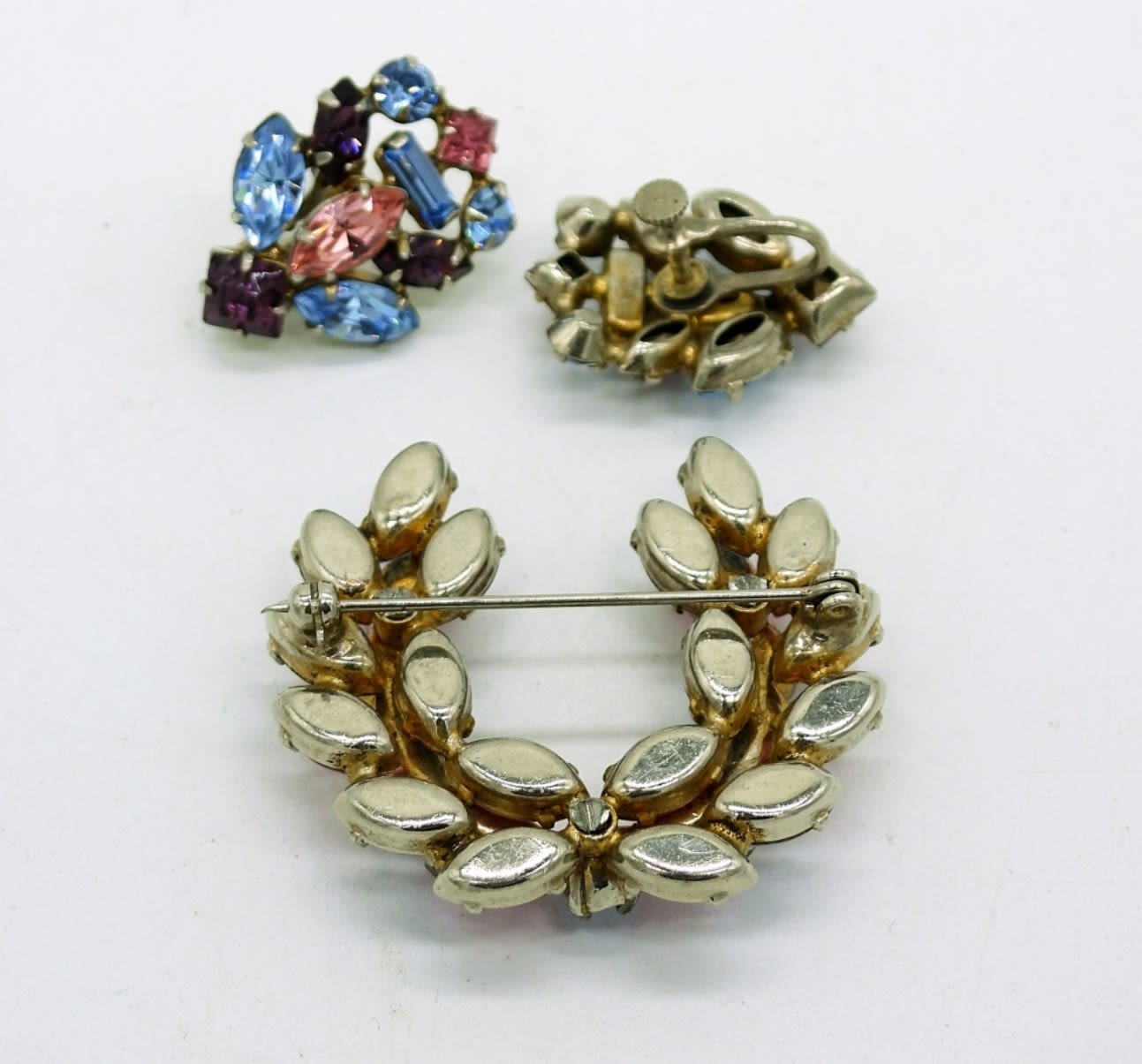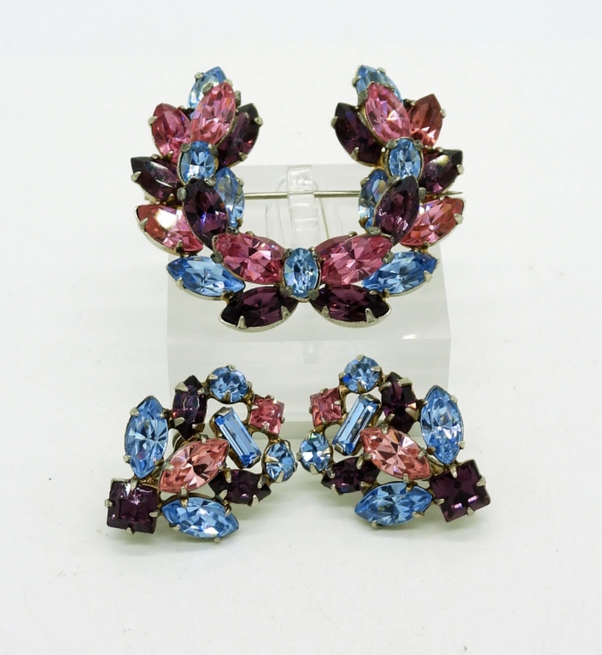 Vintage Rhinestone Brooch & Screw Back Earring Set. Rhinestones are clear and sparkling in Blue, Pink & Purple with a silver toned metal. No Missing Stones! These are really gorgeous pieces!