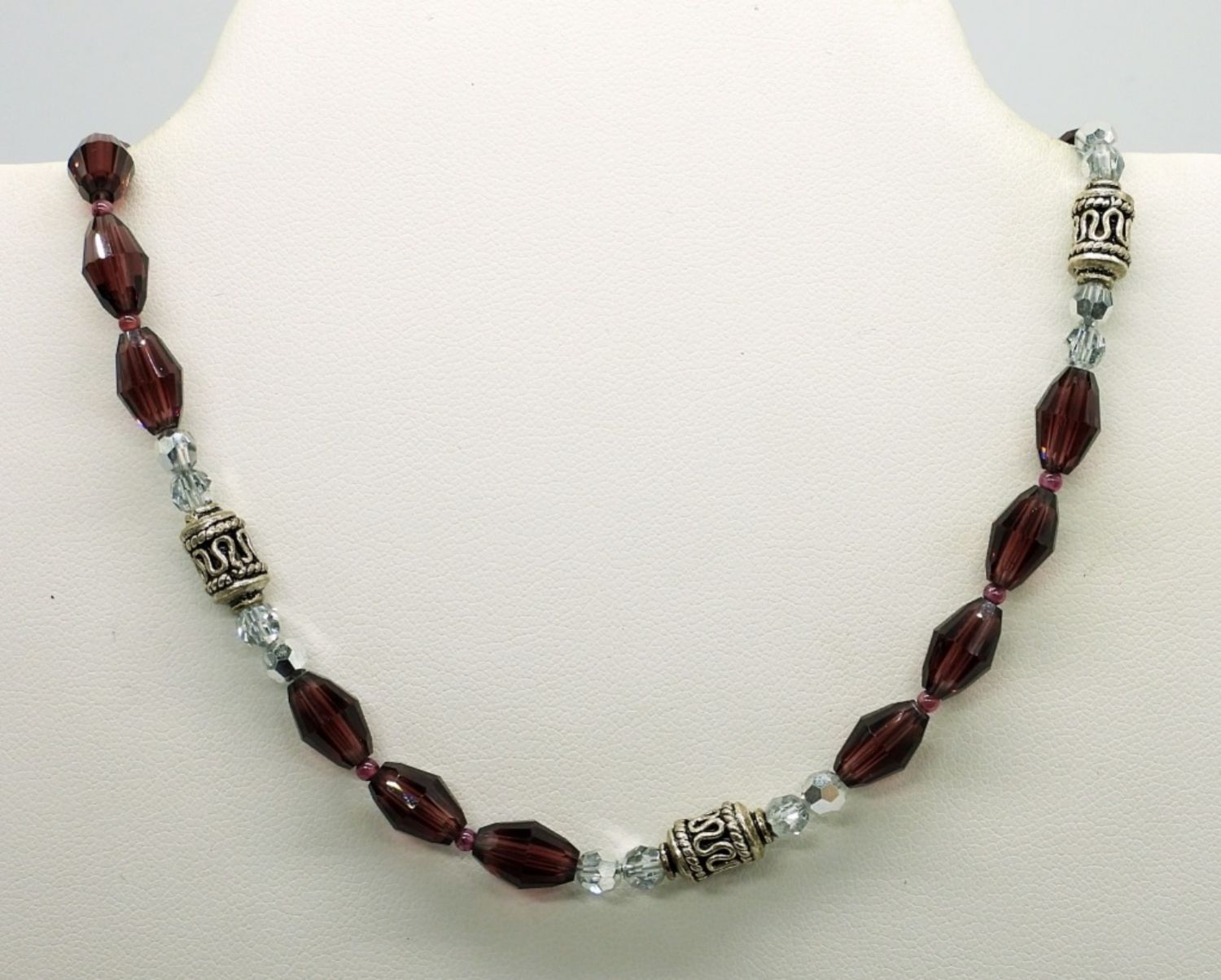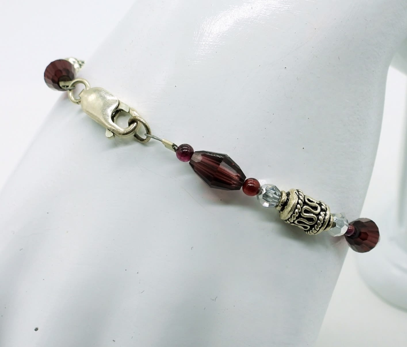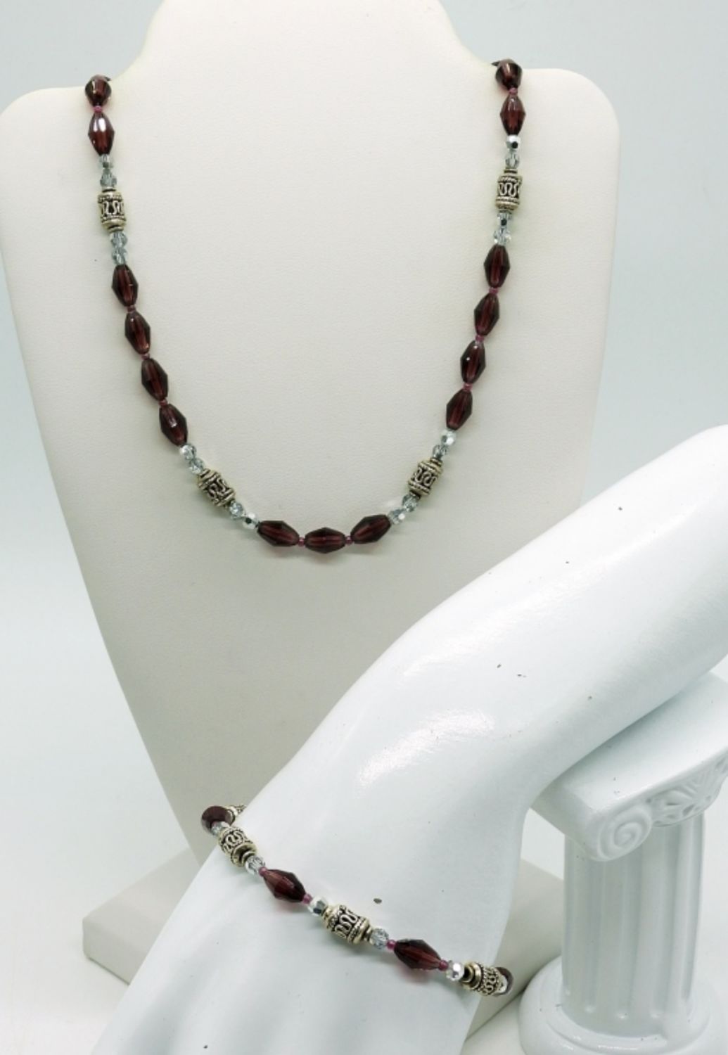 Garnet Colored Crystal Beads with Silver Tone Accent Beads. Matching Necklace (17″) and Bracelet (7″).