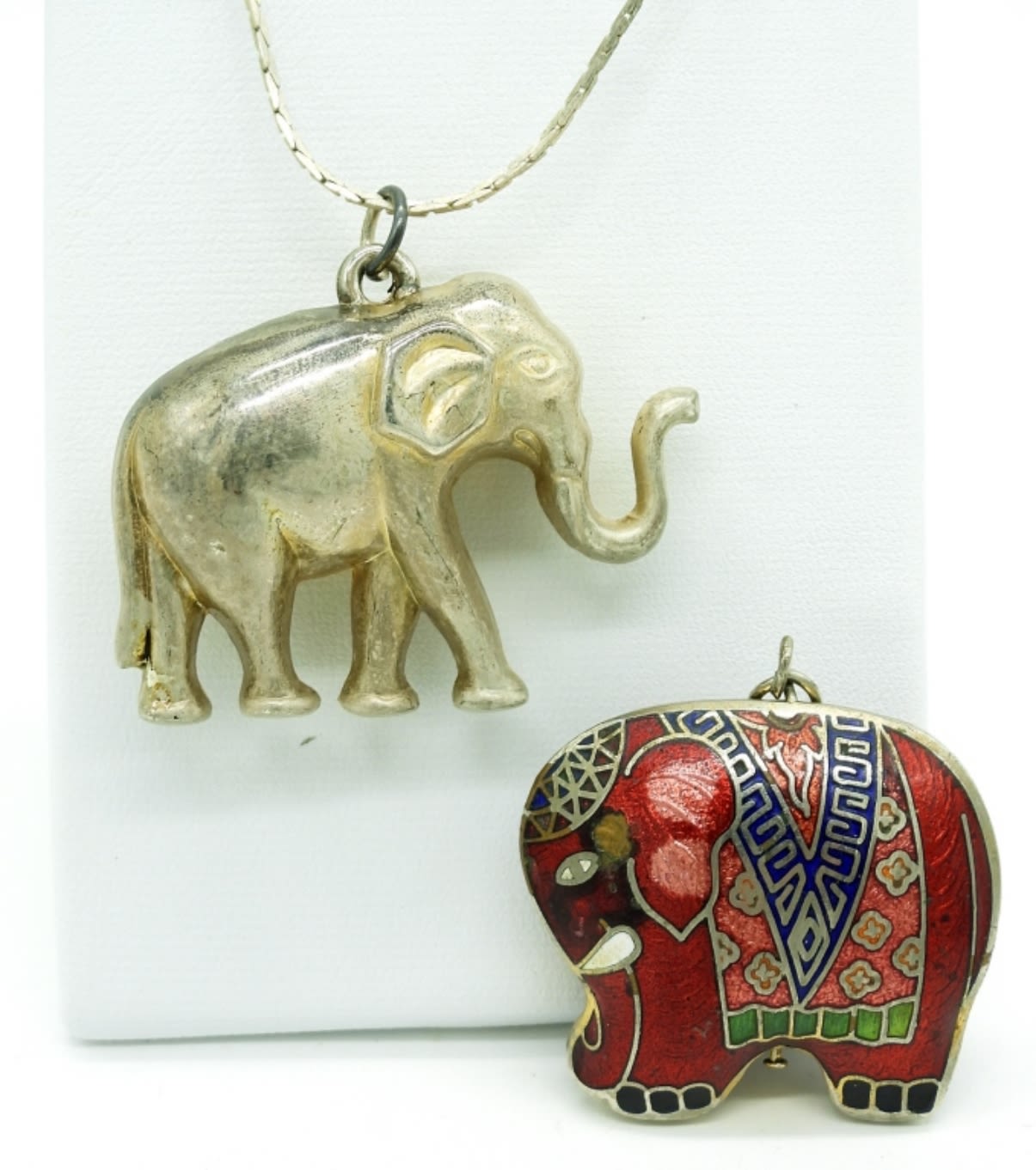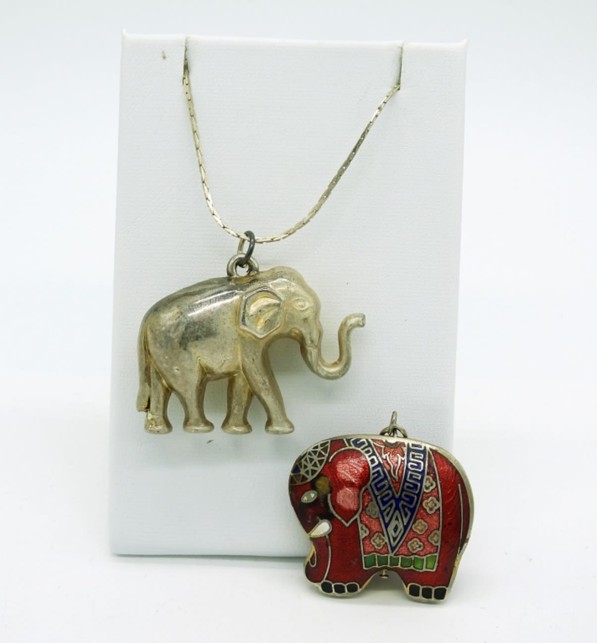 Vintage Cloisonne Style Red Elephant Pendant and Silver tone elephant pendant on 22″ chain.