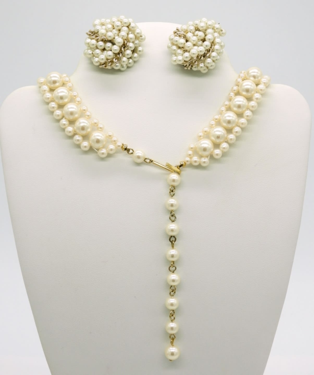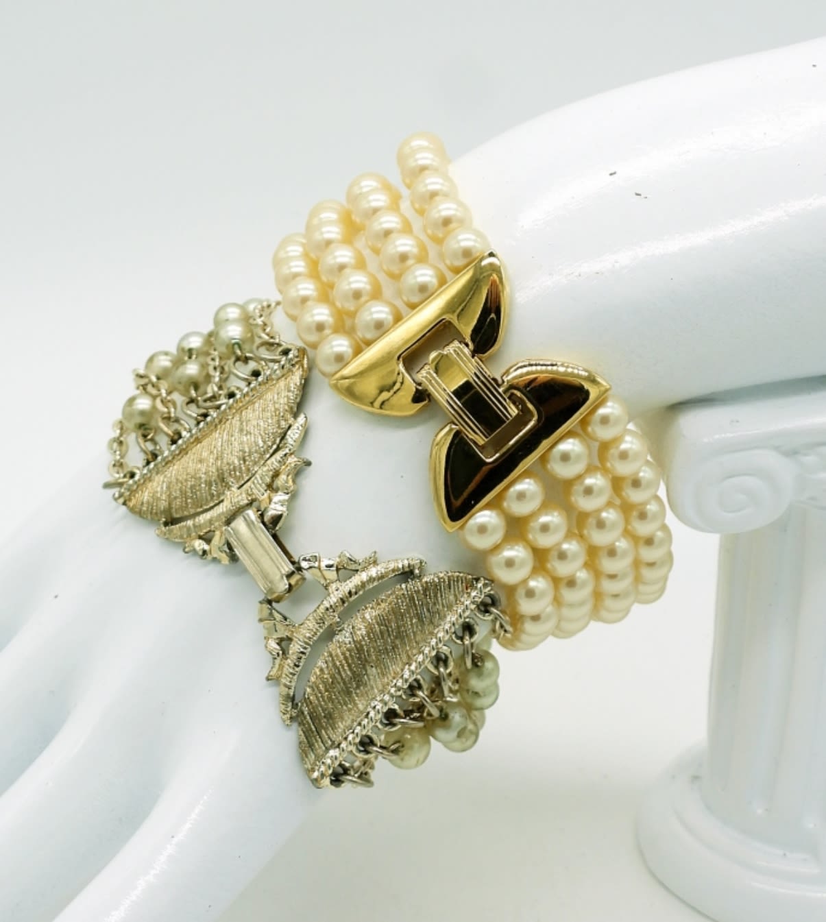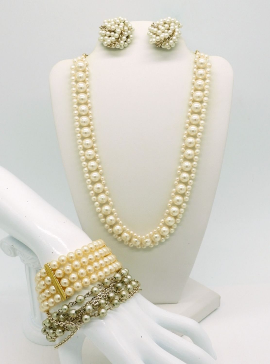 Gold tone and silver tone Vintage faux pearl jewelry. Two Bracelets, 7″. One Pair of Clip on Faux pearl earrings. One Faux pearl Choker style necklace with gold tone accents, 16″ adjustable.