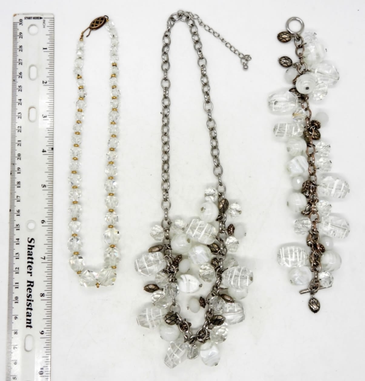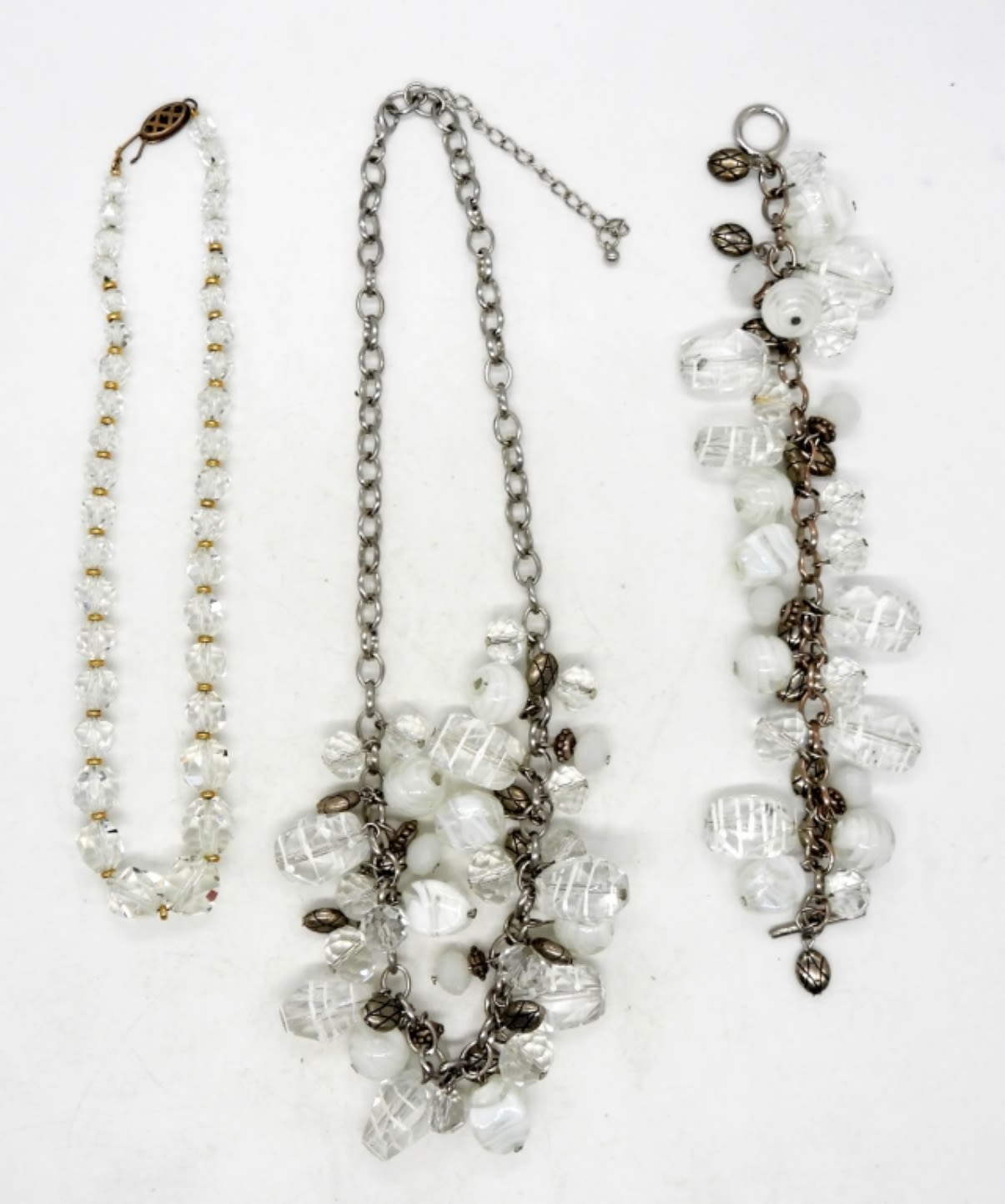15″ CLEAR & GOLD TON BEADED NECKLACE, & CLEAR & WHITE BEADED SET 22″ NECKLACE & 7.5″ BRACELET.