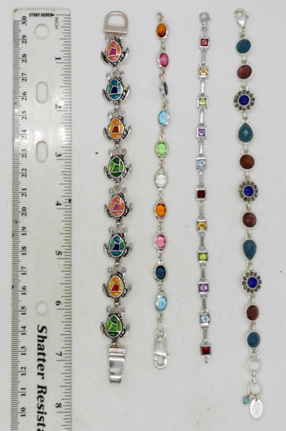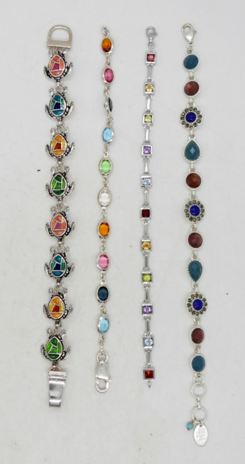 7.5″ ENAMEL TURTLES, 8″ STAMPED “VINTAGE AMERICA”, 7″ ROUND GEMS W/ 925 CLASP, & 7″ SQUARE GEMS W/ 925 CLASP