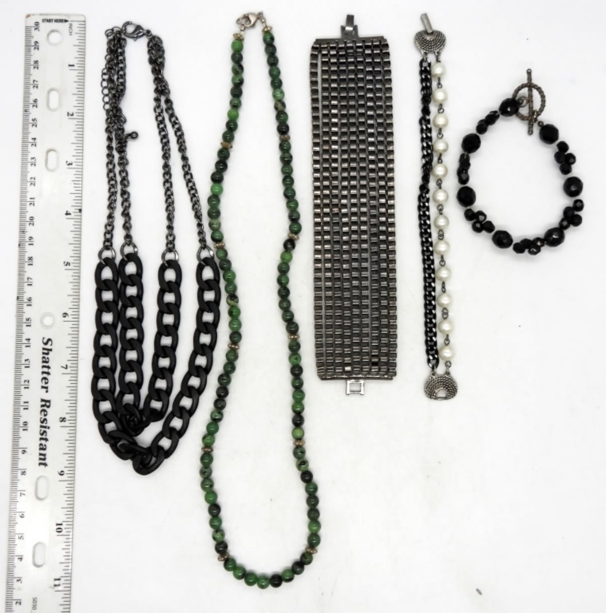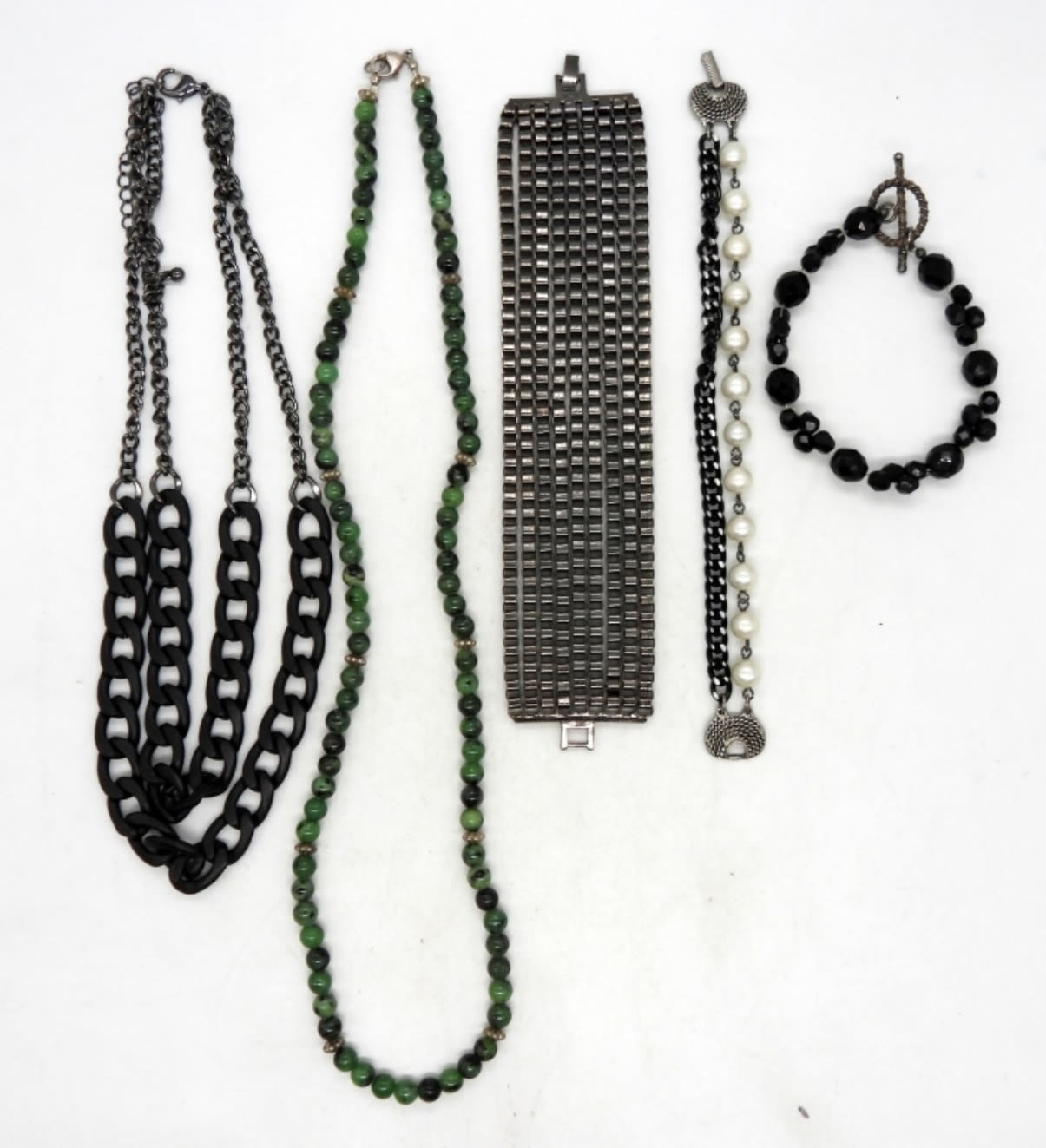 (2) NECKLACES & (3) BRACELETS. NECKLACES: 23″ GREEN JADE BEADED W/ 925 CLASP, 15″ DOUBLE STRAND BLACK & GUNMETAL CHAIN. BRACELETS: 8″ BLACK BEADED, 7″ DOUBLE STRAND BLACK CHAIN & PEARL, & 7″ THICK MULTI STRAND GUNMETAL CHAINS.