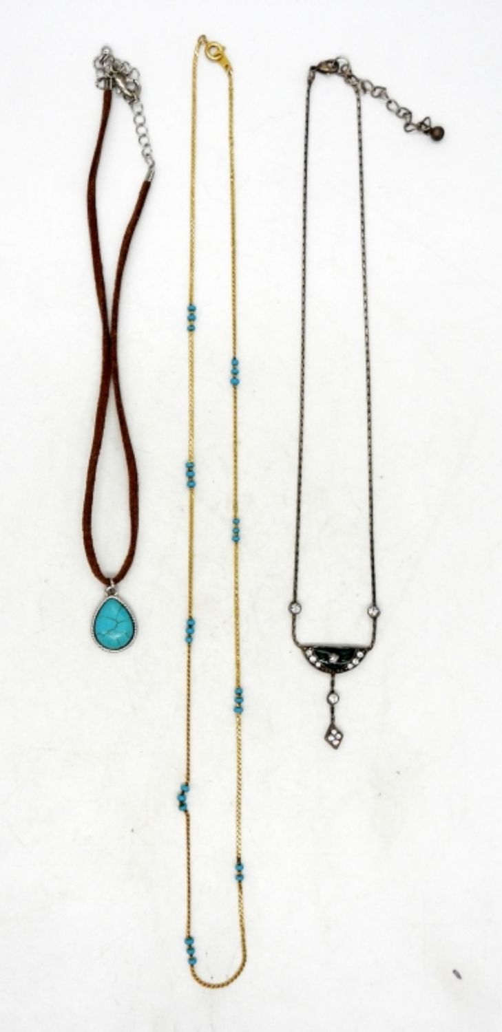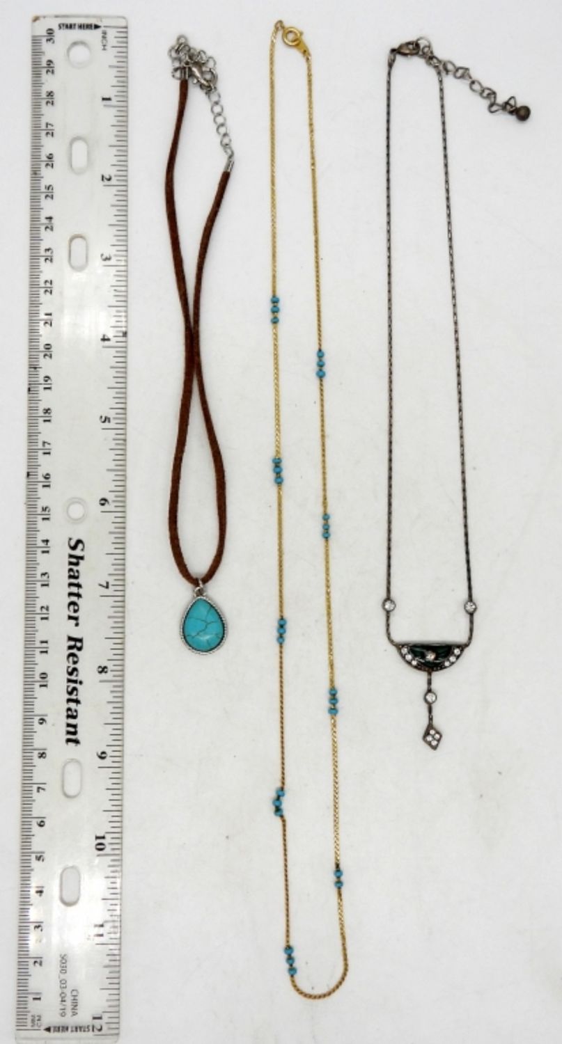 24″ GOLD TONE & TURQUOISE COLORED BEADS, 14″ BROWN CORD & TURQUOISE COLORED PENDANT, 17″ SILVER TONE RHINESTONE & GREEN ENAMEL