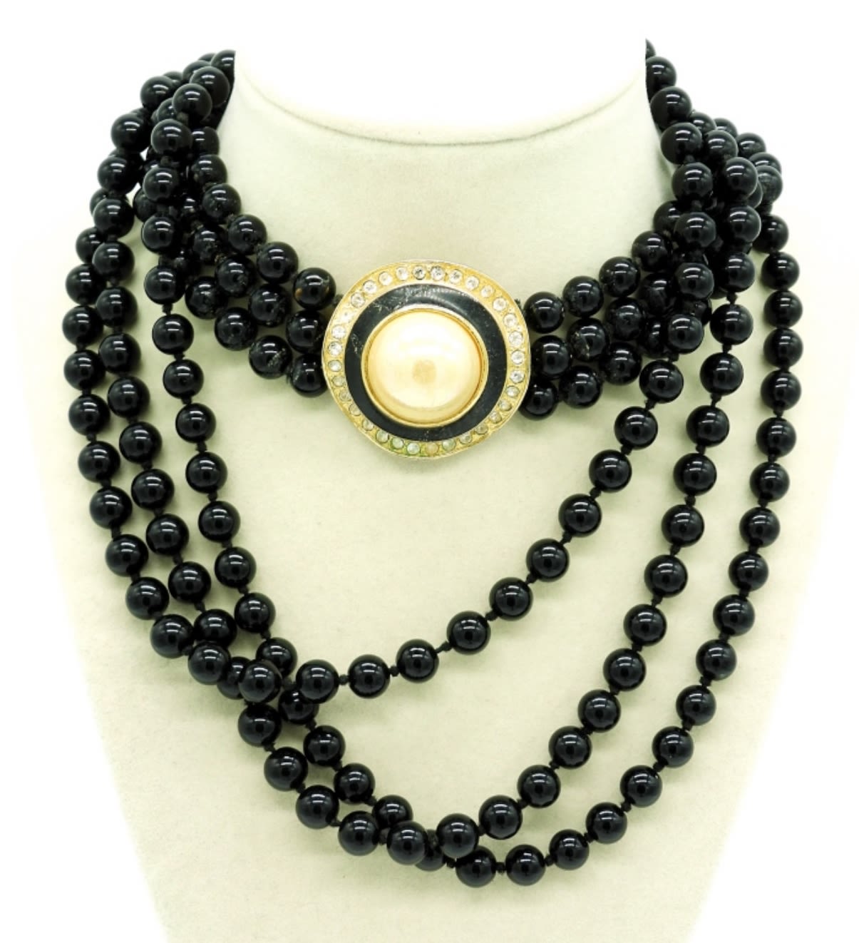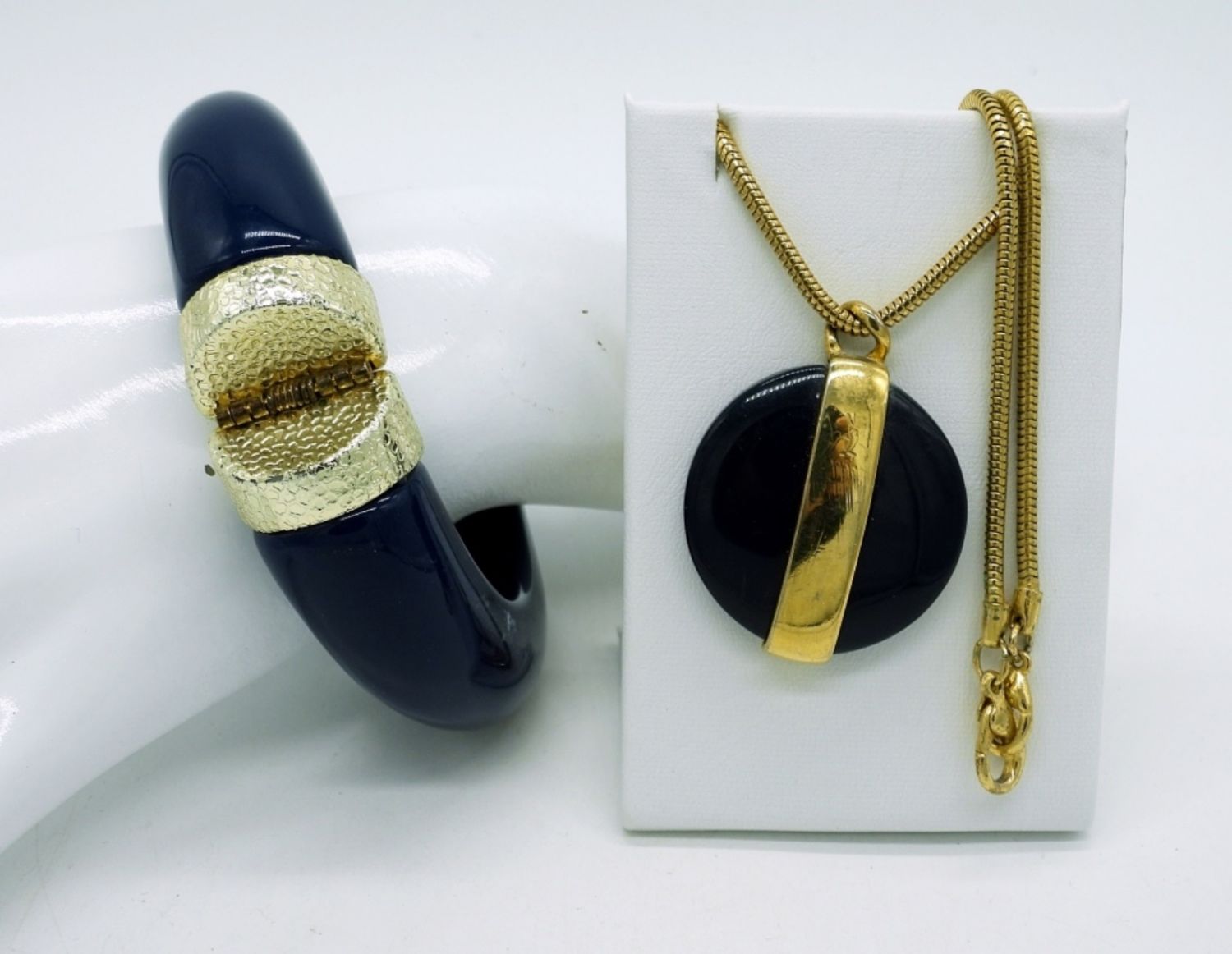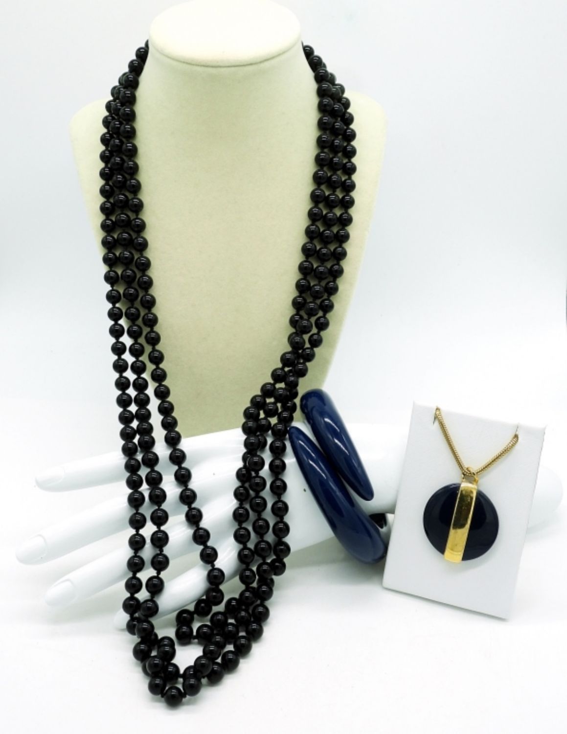 Vintage gold tone black beaded necklace circal 1980s with large gold/black & faux pearl clasp. 30″. Matching gold tone & Navy Blue Tusk style bracelet and chunky round navy blue pendant on a 30″ chain.