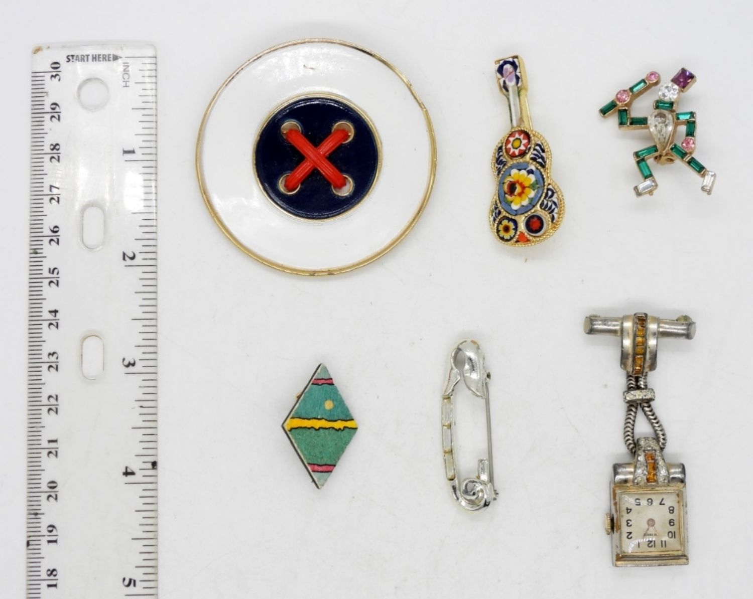 SAFETY PIN, OVERSIZED BUTTON, DANCER, WATCH (UNTESTED), & GEOMETRIC