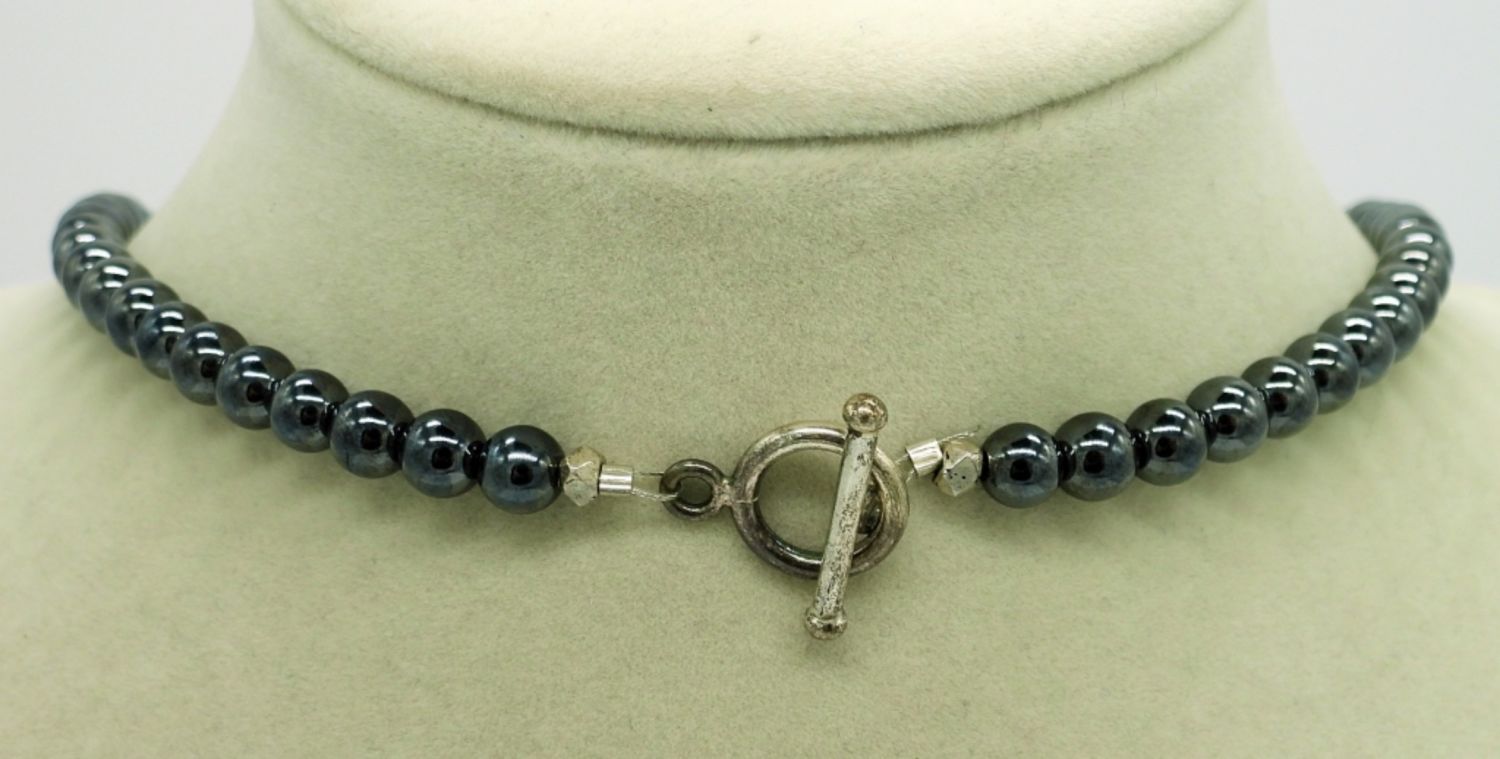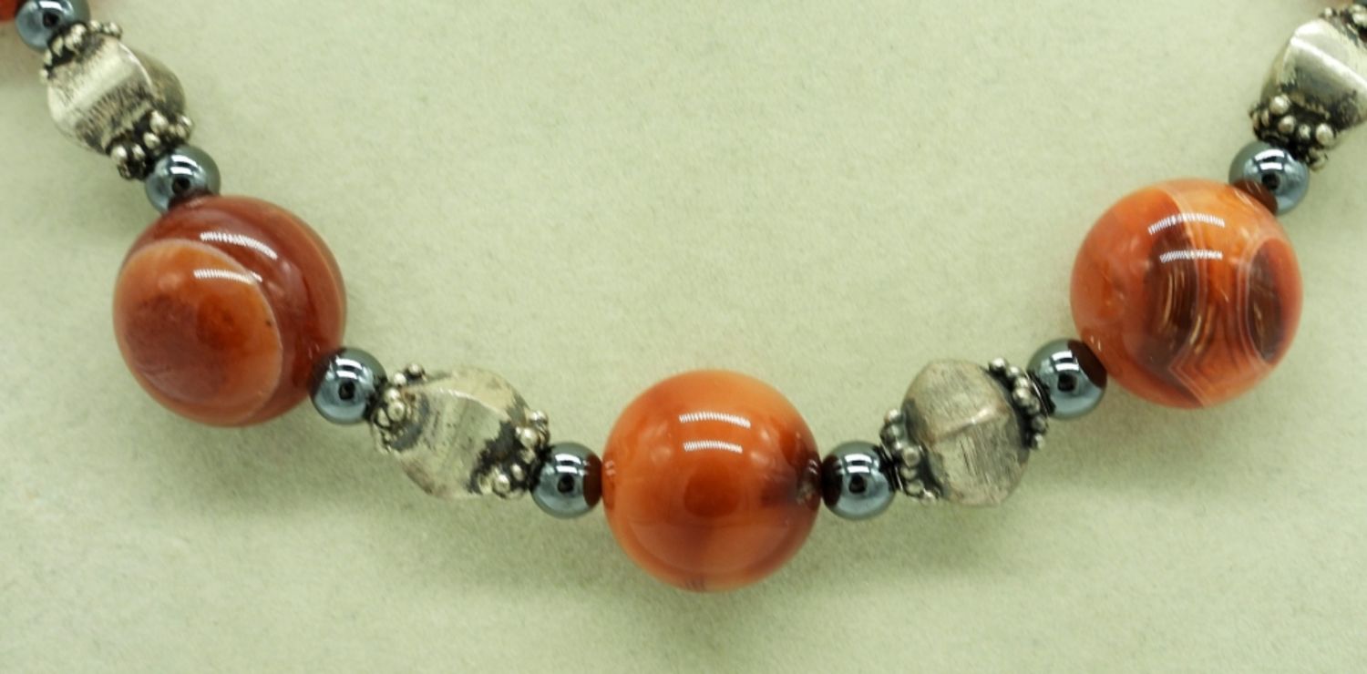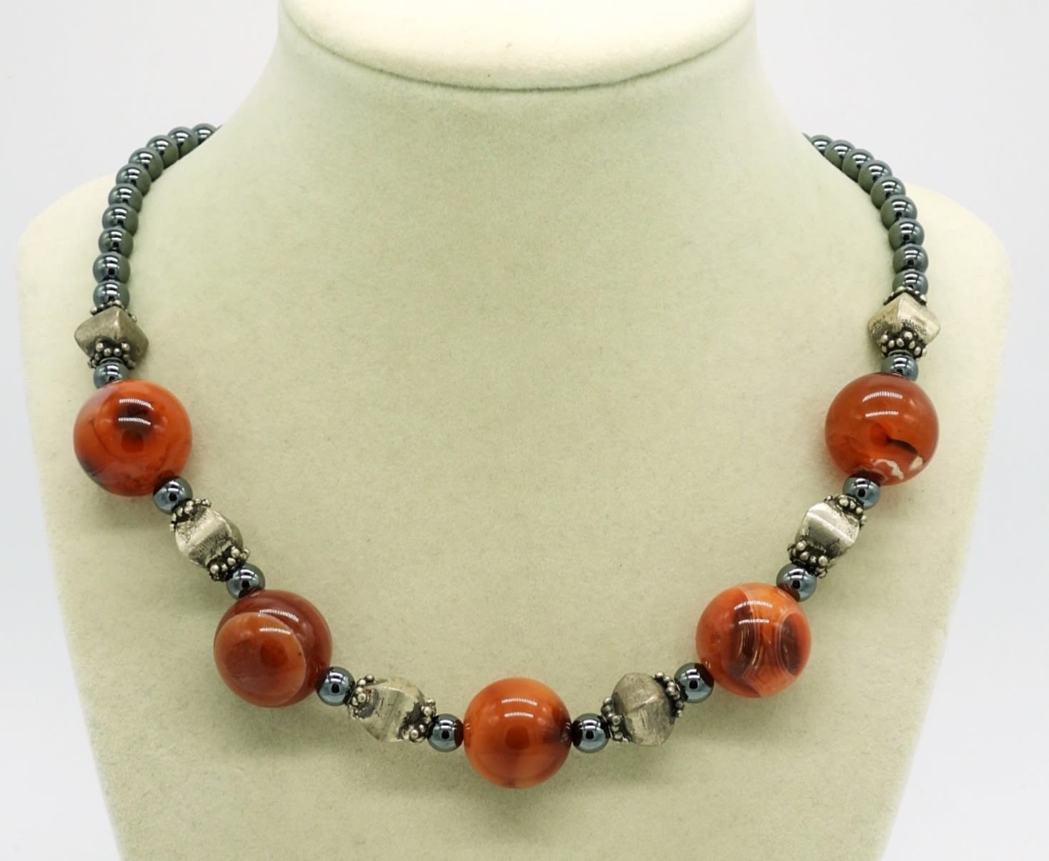 Hematite Beaded necklace with Large Red Carnelian Beads as well as Metal Beads, 18″ with toggle clasp.