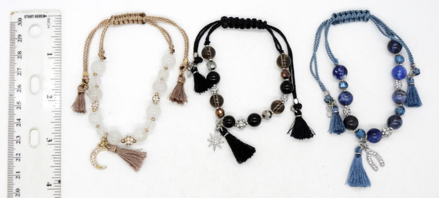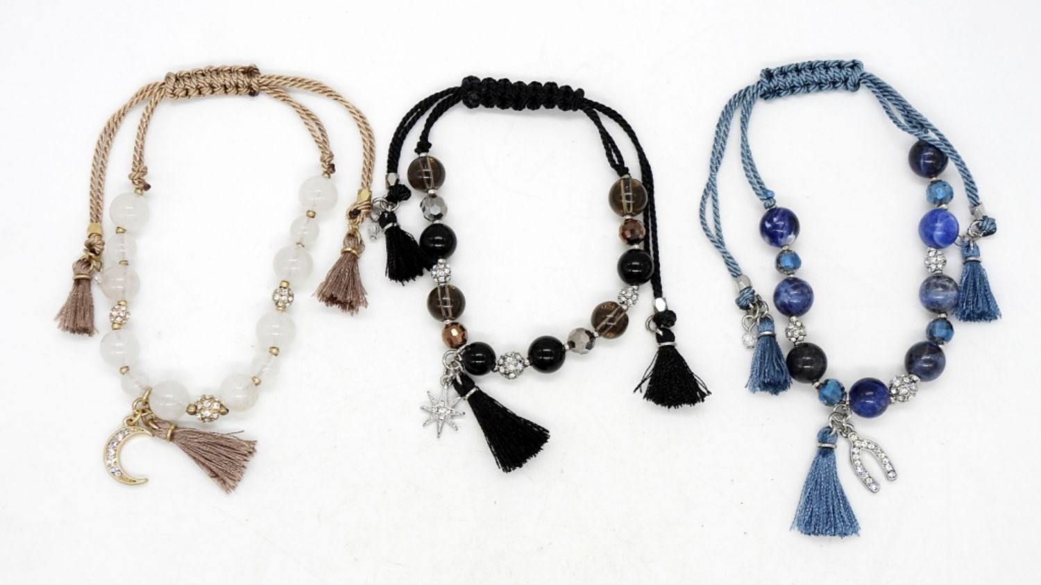 ADJUSTABLE CORD 1.5″-3.5″ DIAMETER. BLUE HORSESHOE CHARM, BLACK STAR CHARM, & GOLD MOON CHARM.
