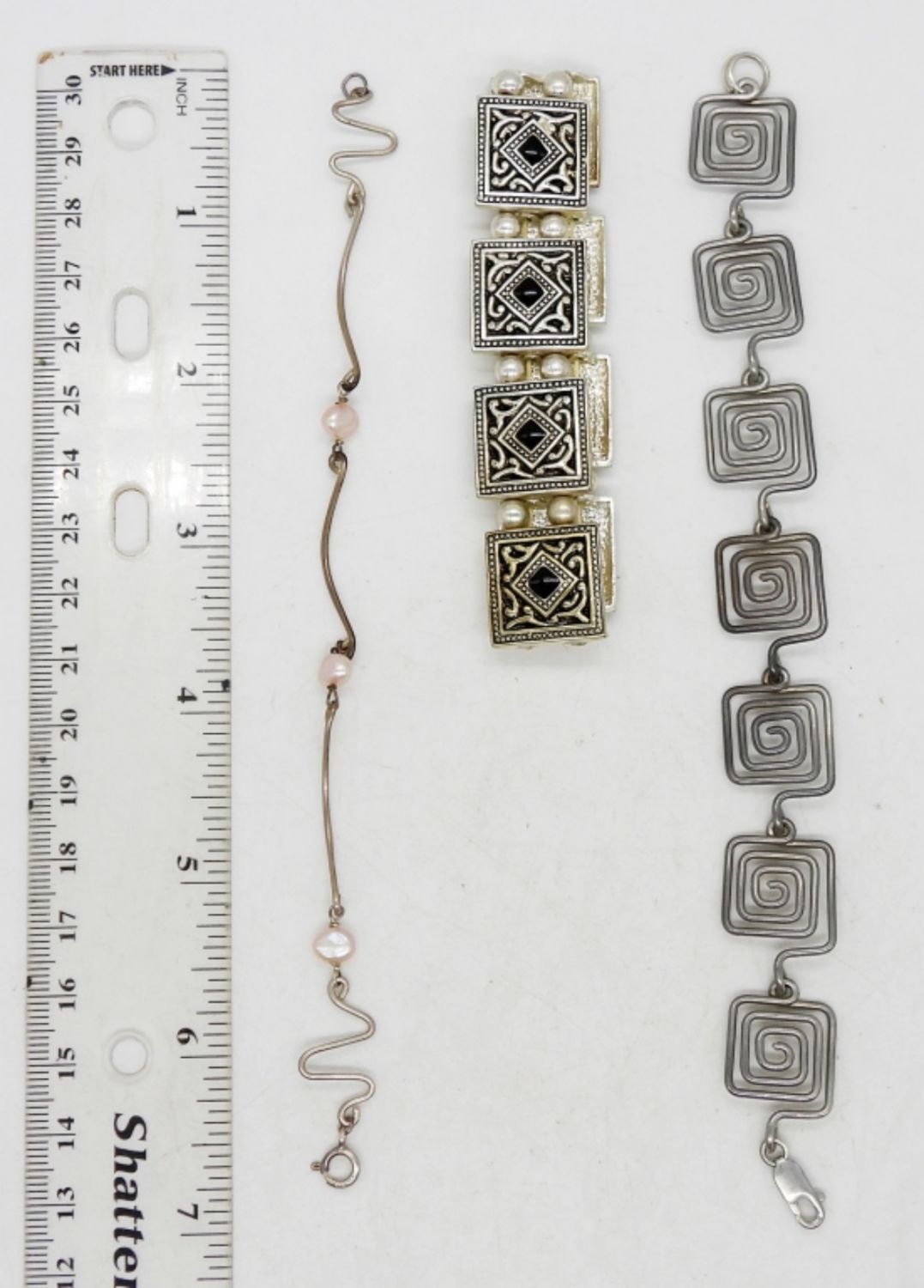 6.5″ PEARL & LINE, 7″ SQUARE SPIRALS W/ 925 CLASP, & 2.5″ DIAMETER STRETCH BLACK ENAMEL SQUARES.