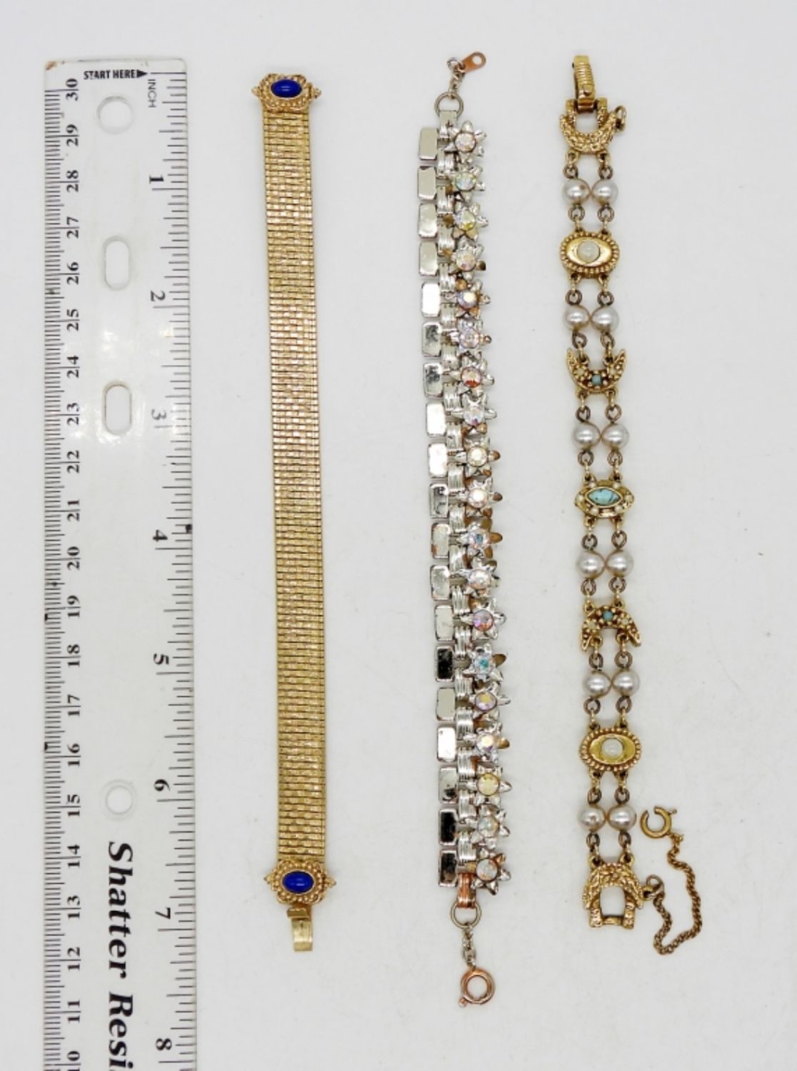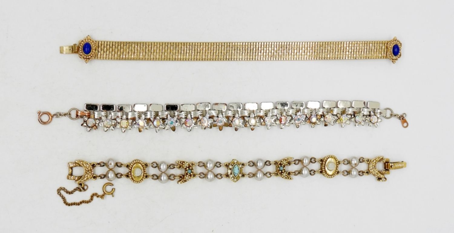 8″ AURORA BOREALIS RHINESTONE FLOWERS, 7″ FAUX PEARL & MOONS, & 6.5 ” GOLD BAND