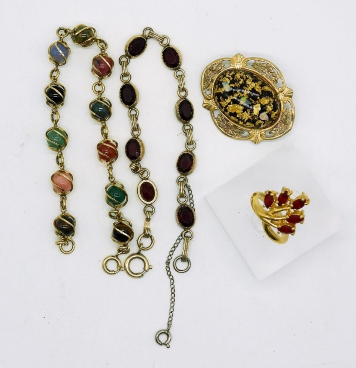 Two 7″ Gold Tone Bracelets with Gemstones. Vintage Gold Tone Brooch with Black and gold center stone. Two Pair of Vintage Gold Tone Clip On Earrings. Size 6 Gold Tone Ring with Red Gemstones.
