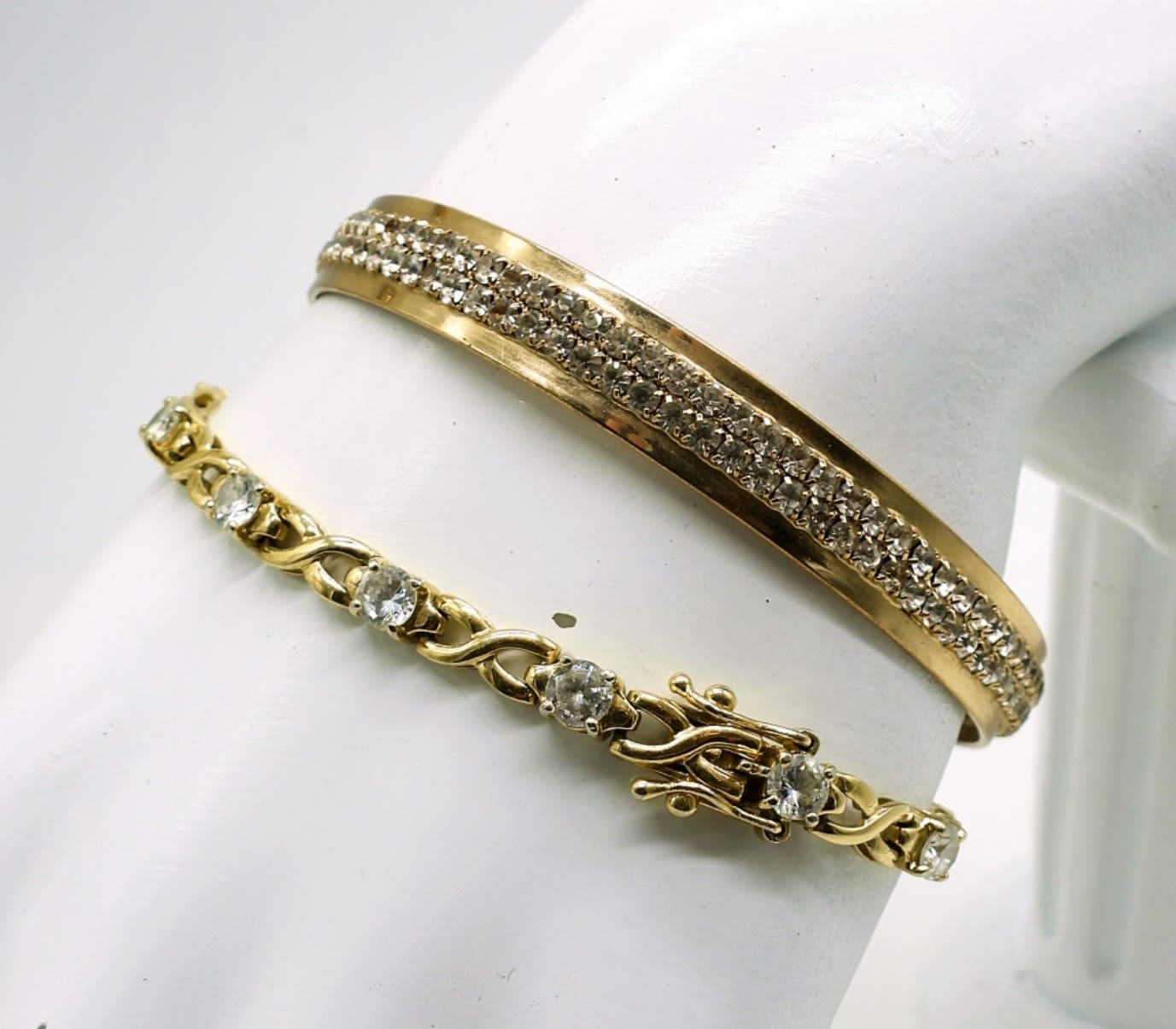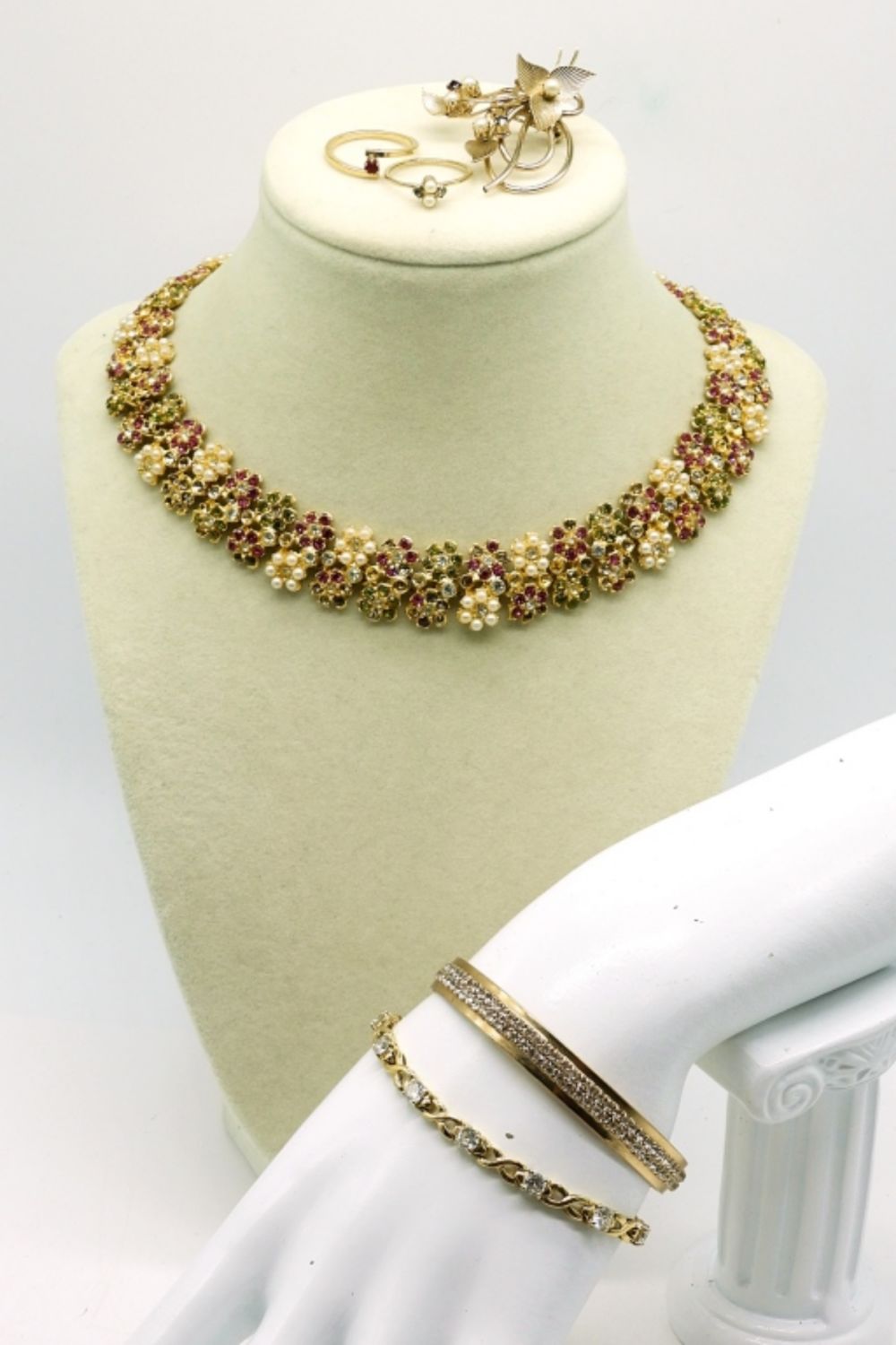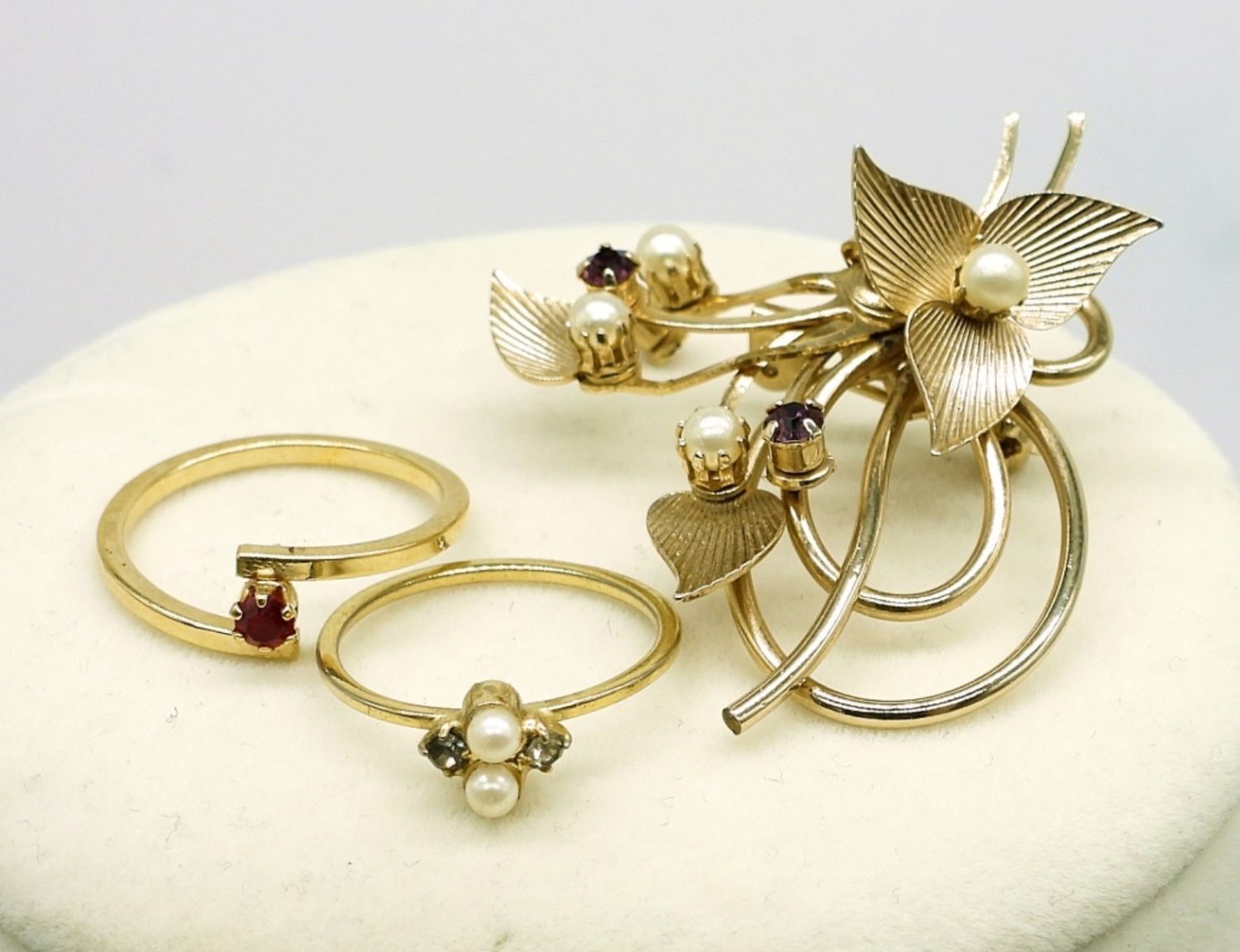 Vintage Gold Tone Flower Collar Necklace. 15″. Gold Tone and Clear Gemstone Bracelet, 7″. Gold Tone and Clear Gemstone Cuff Bracelet, 5″. Vintage Gold Tone Brooch with Pearl and Red Gemstones. Two Gold Tone Rings, Red Colored Gemstone is an Avon ring size 5.5. Pearl ring is size 5.