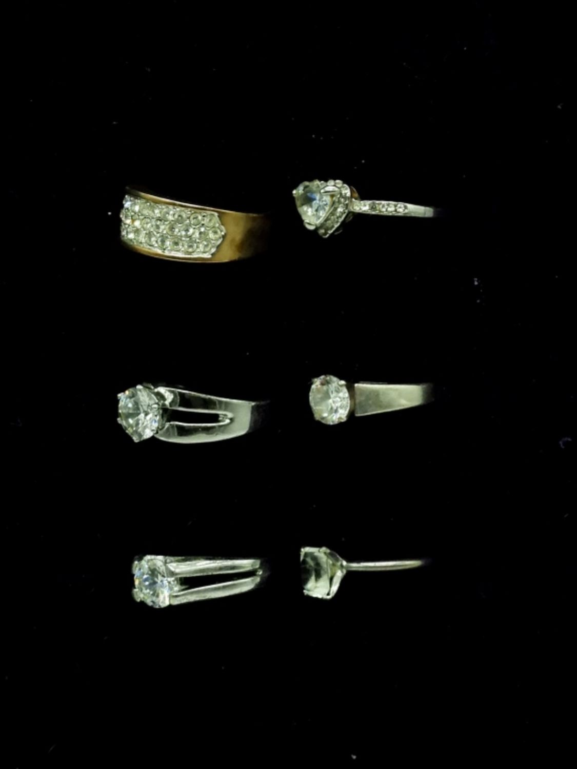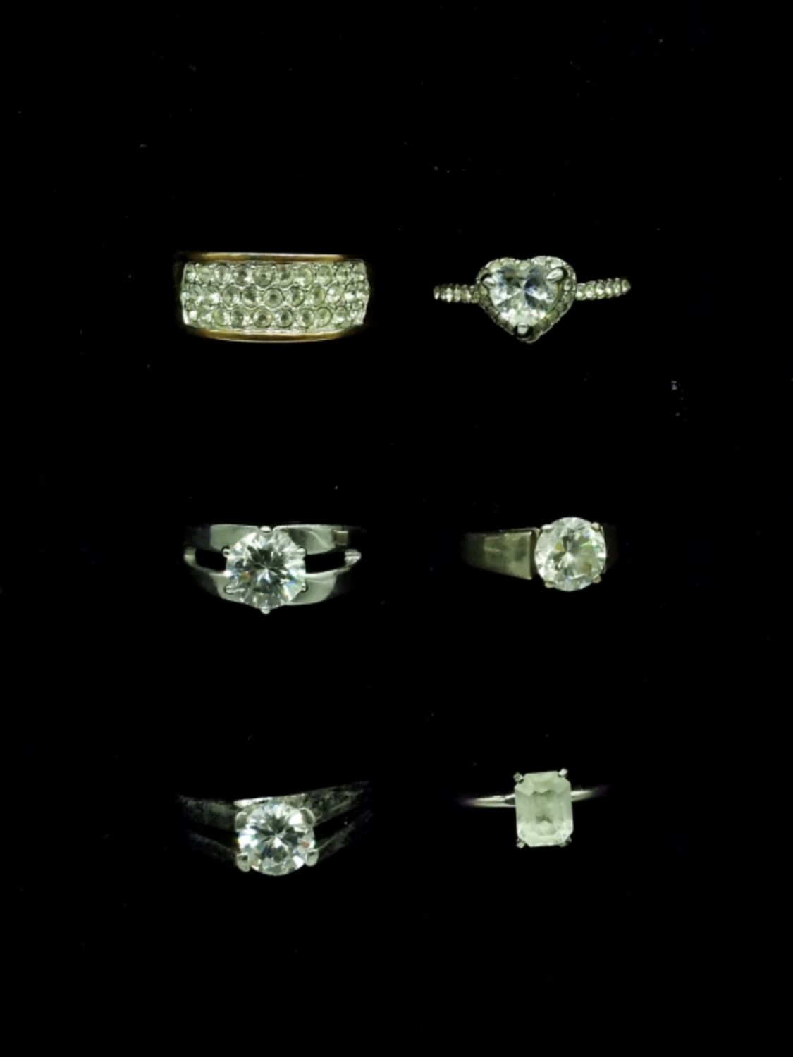 Six Rings with Clear Gemstones. Five in Silver Tone, One in Gold Tone. Sizes 5, 6, 9, 9.5, 10.