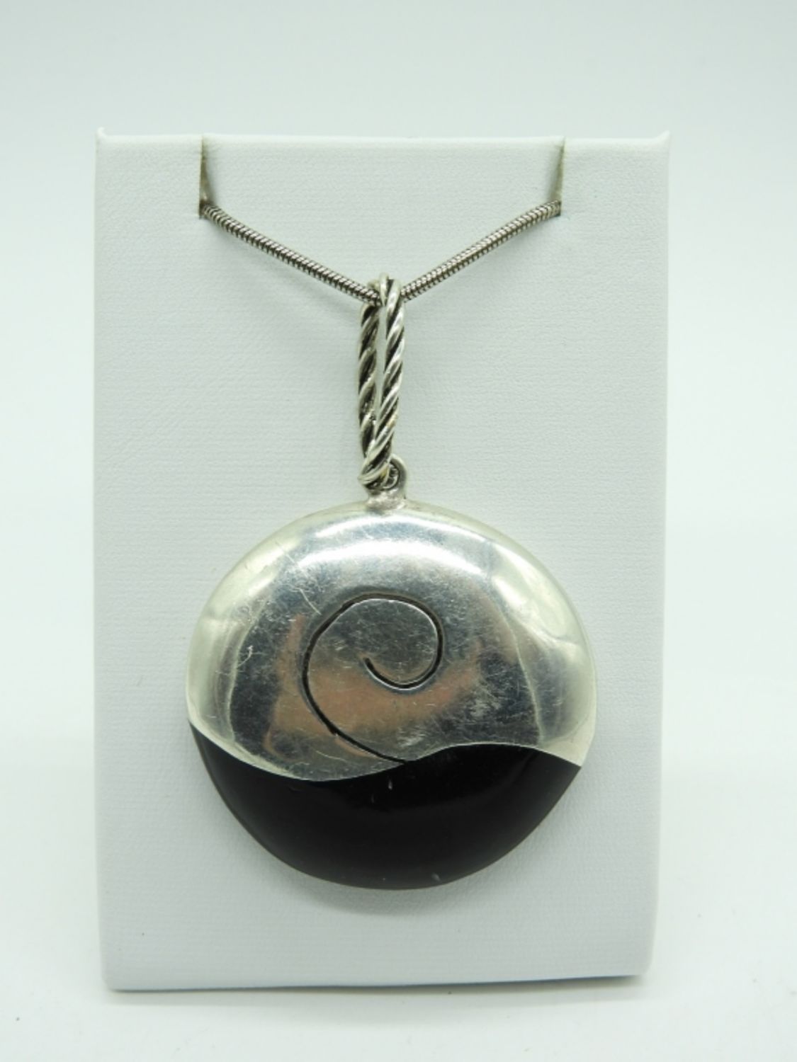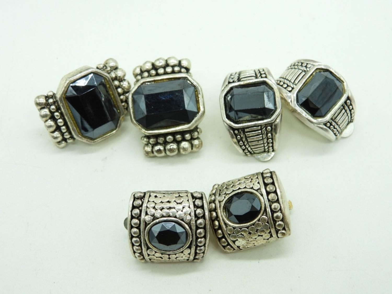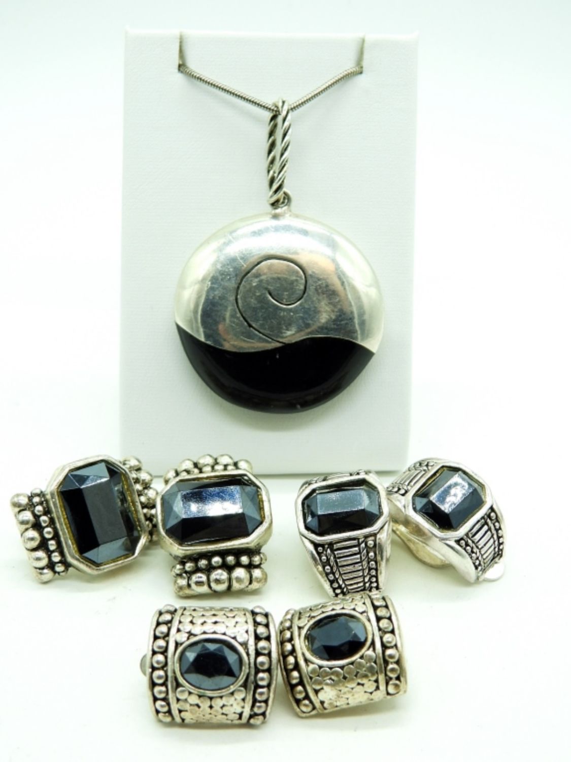 Large Round Silver Tone with Black Pendant on a 30″ chain. Three Pair of Vintage Black and Silver tone Clip On earrings.