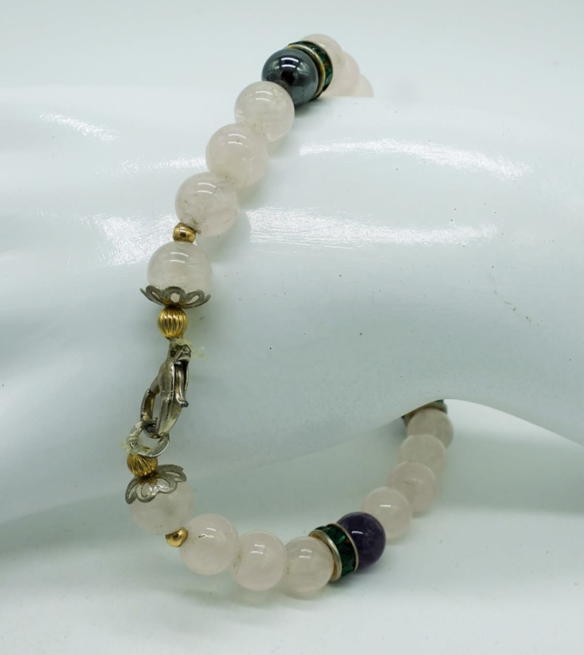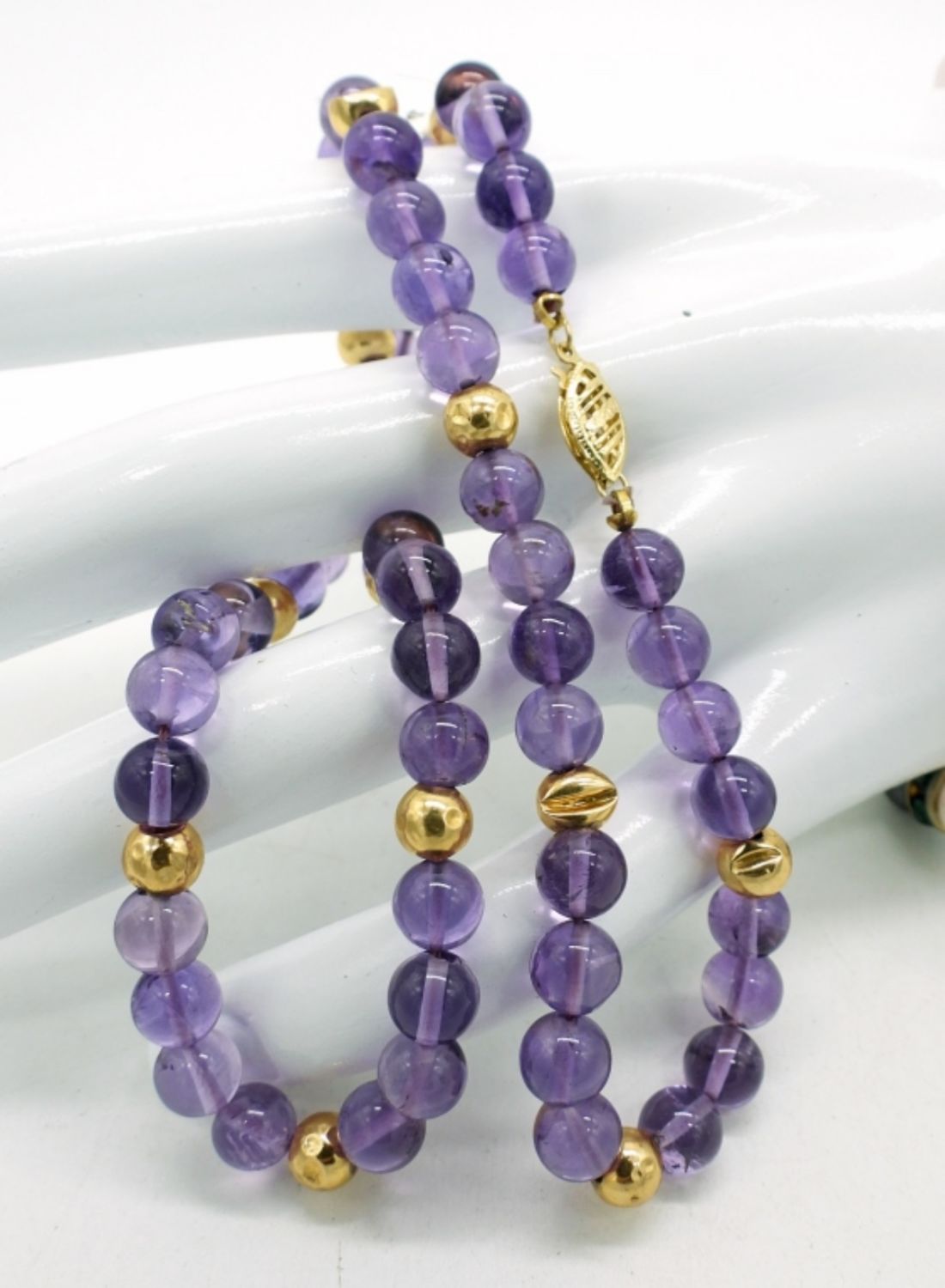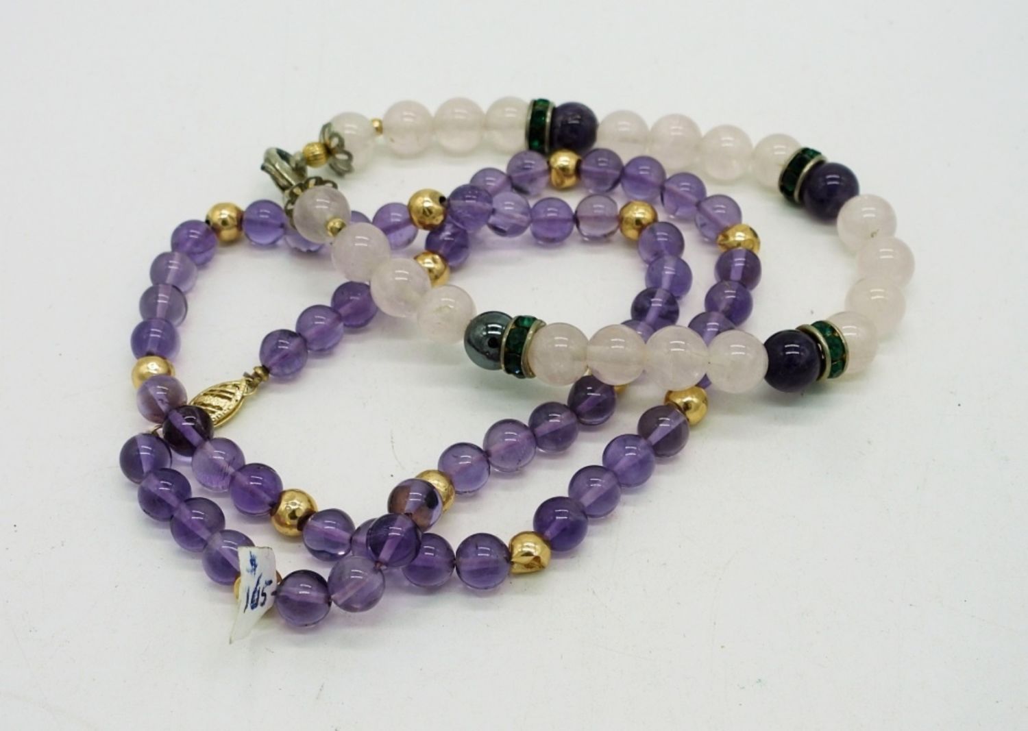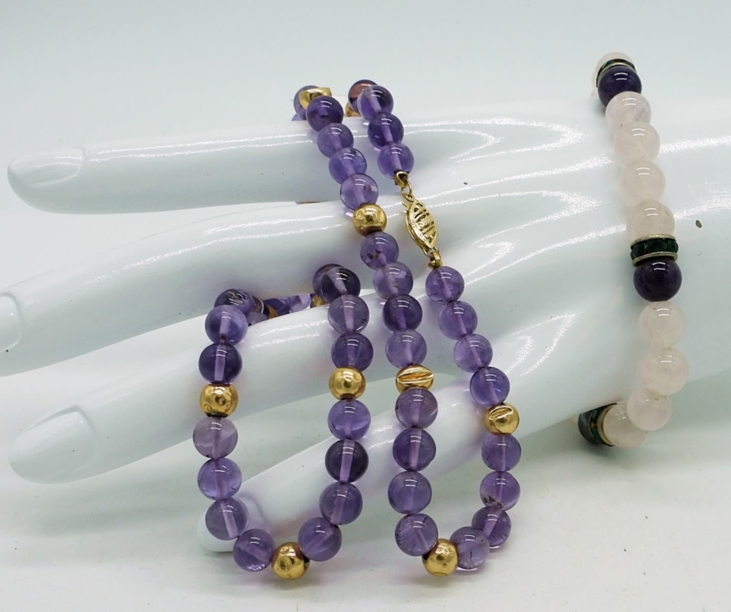 Amethyst beaded necklace with gold tone spacer beads, Clasp is 14K Yellow Gold, 18″. Home made Rose Quartz & Amethyst Beaded Bracelet, 9″.
