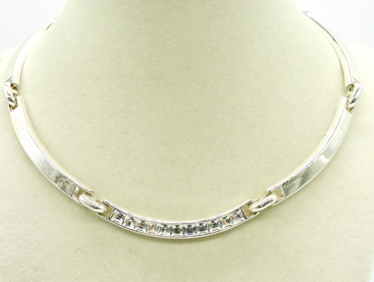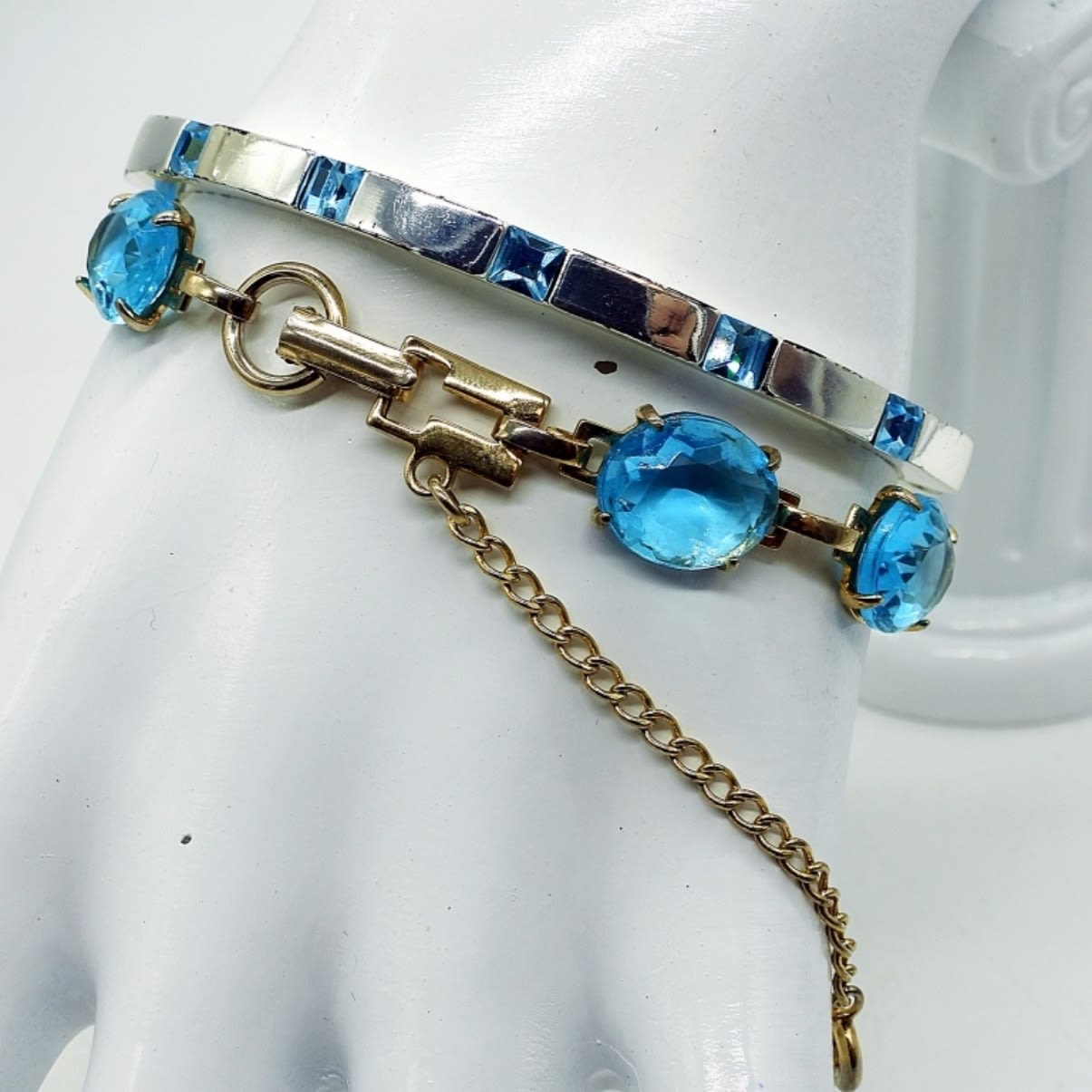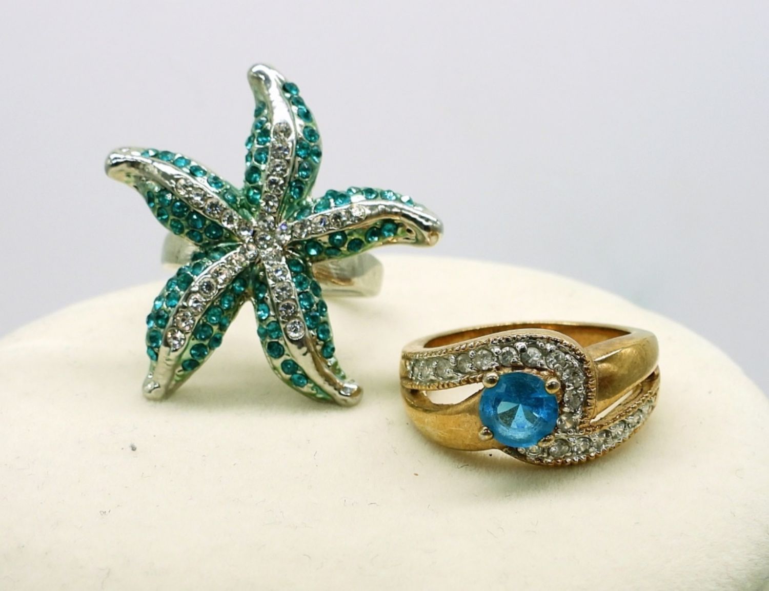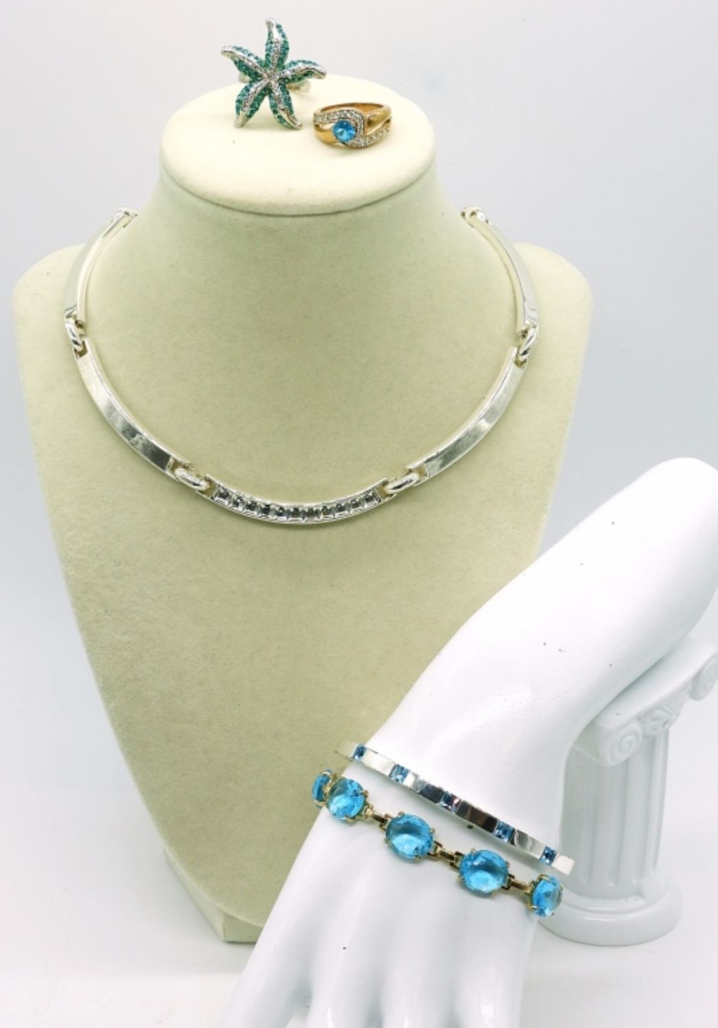 Silver tone necklace with clear gemstones, 15″. Silver tone bangle style bracelet with aquamarine colored gemstones, 7″. Starfish shaped silver tone ring with aquamarine and clear gemstones, size 7. Gold tone bracelet with large beautiful aquamarine colored gemstones, 7″. Gold tone aquamarine colored gemstone, marked “Thailand”, Size 7.
