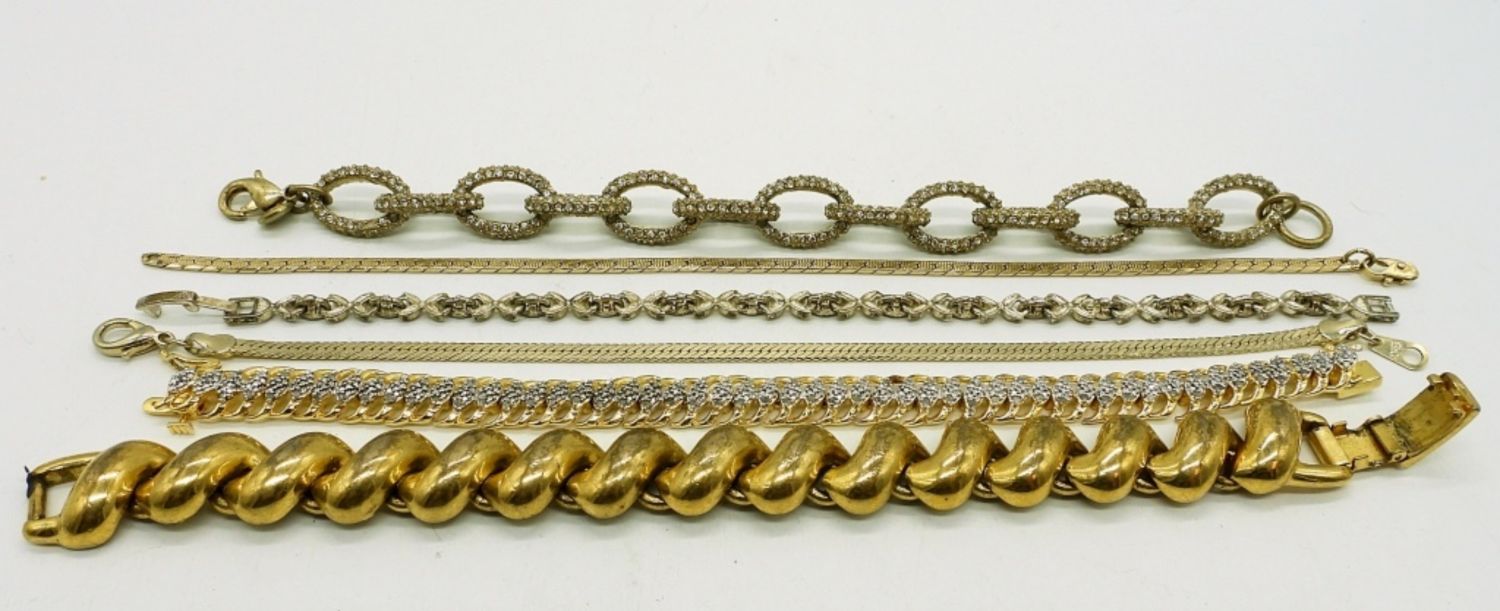 Six Gold Tone Bracelets, 6″ & 7″. One chain bracelet needs an O Ring to reattach the clasp.