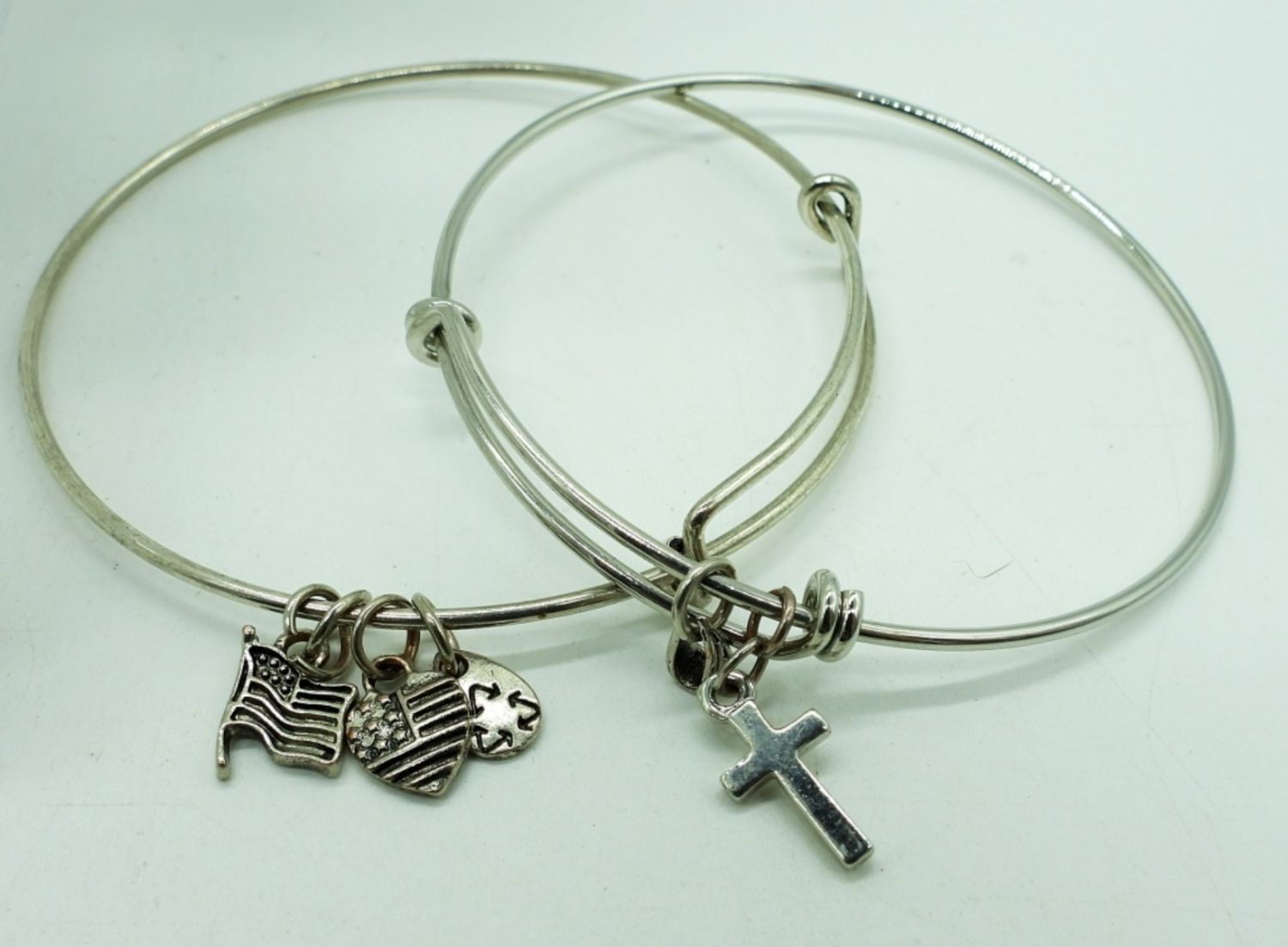 Three Silver tone Bangle Bracelets, Two are modern charm bracelets. The other has large clear plastic gemstones wrapped in wire. 8″.