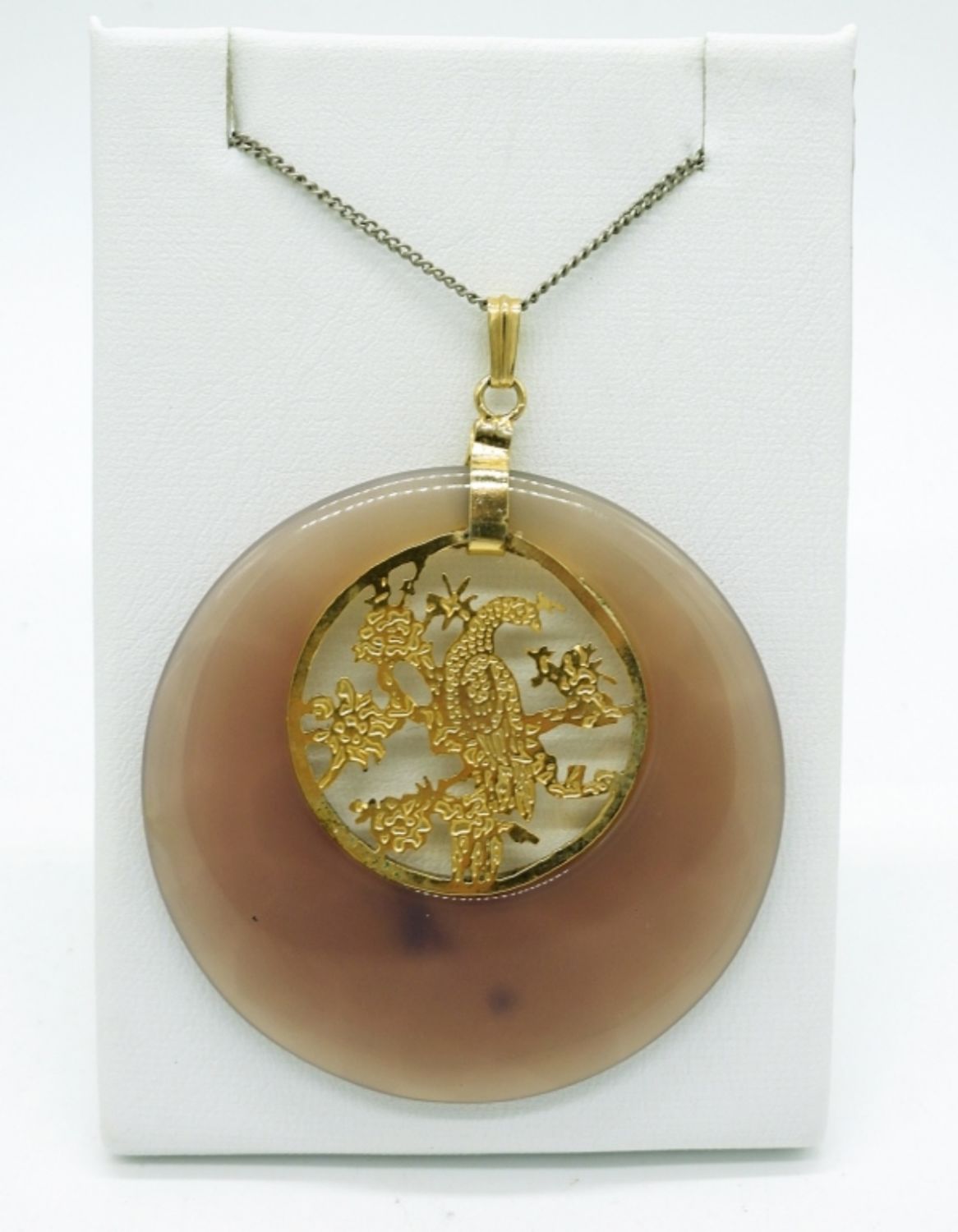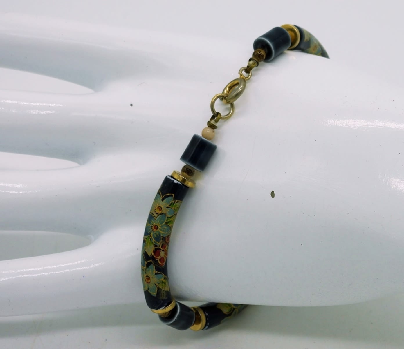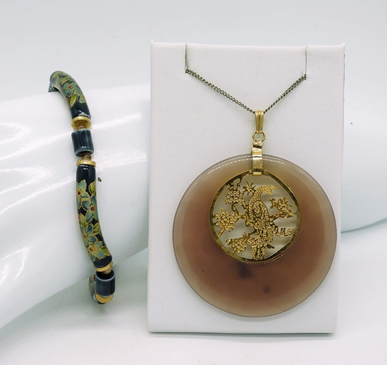 8″ Vintage Cloisonne Tube Beaded Bracelet. Large Vintage Chinese Symbol Natural Jade Circle pendant with gold tone accents. Chain is 14″.