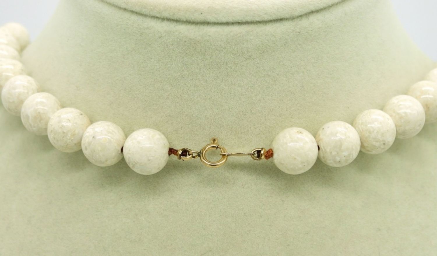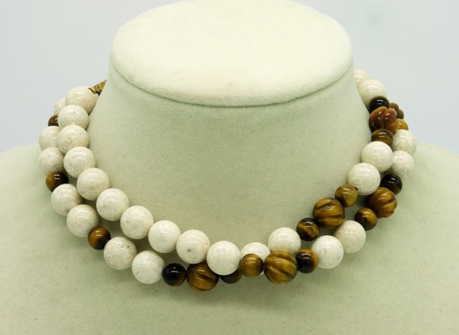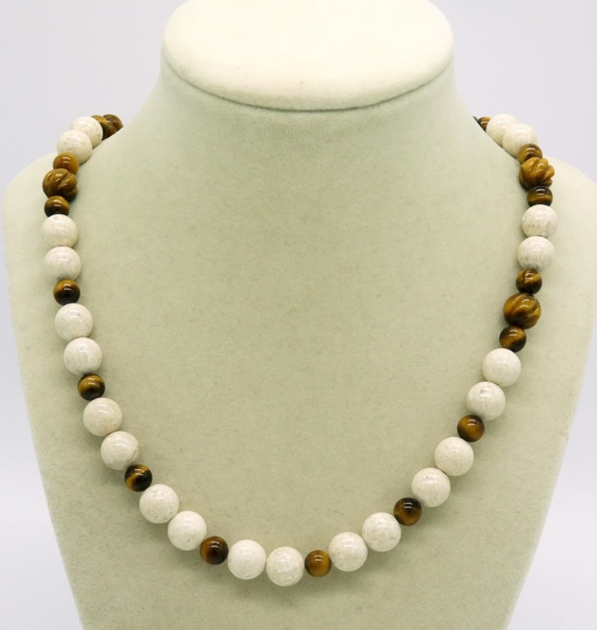 Tigers Eye and a White/Tan Gemstone that I think is Howlite, but I’m unsure. It is a beautiful heavy necklace, 25″.