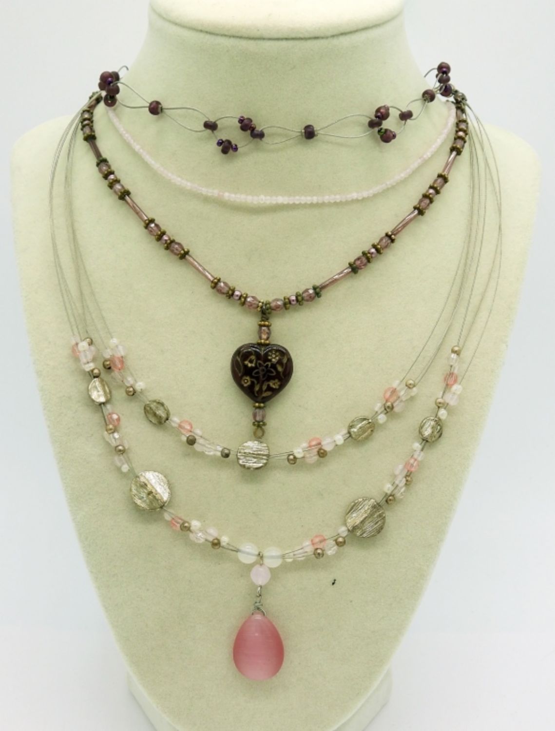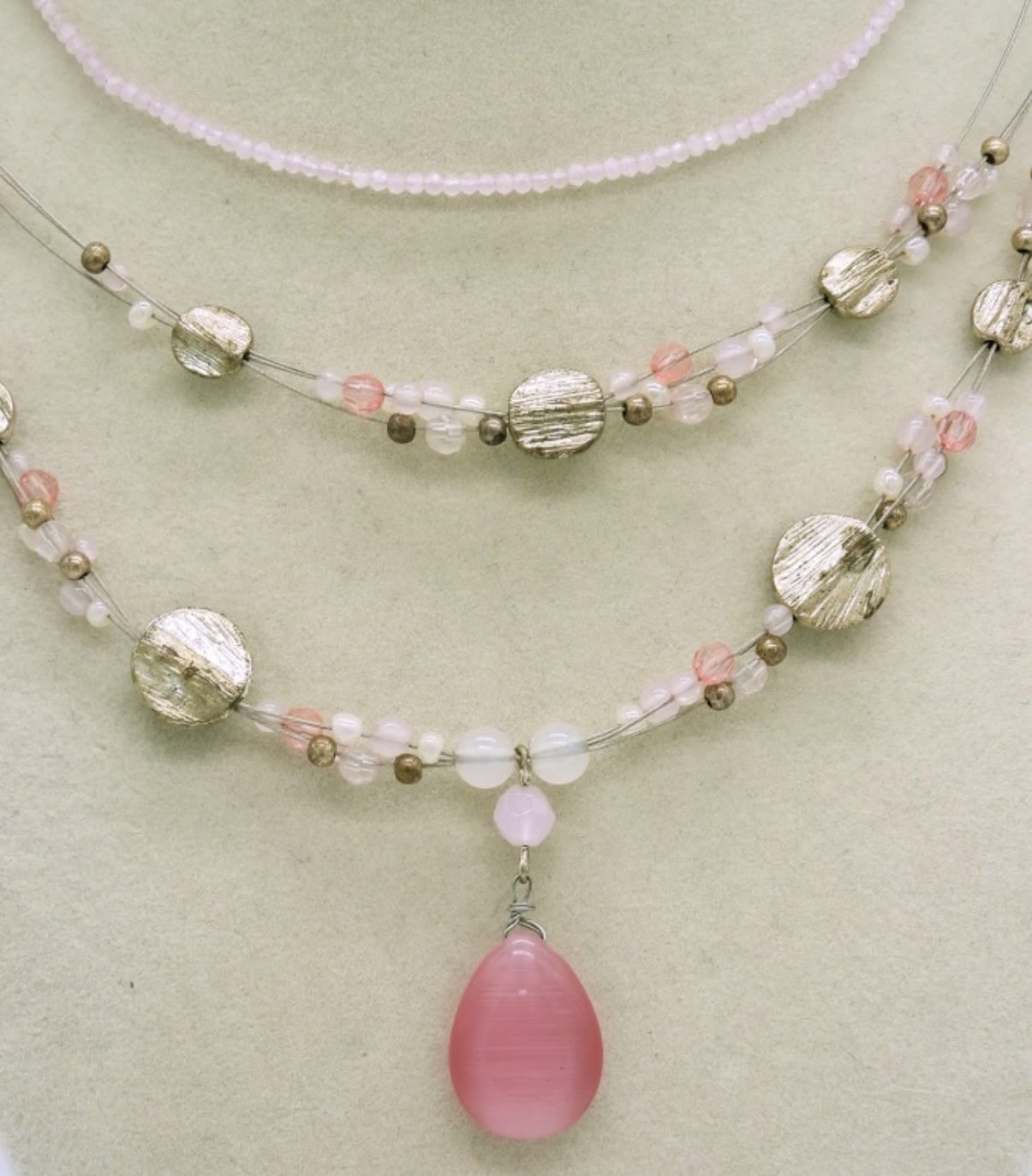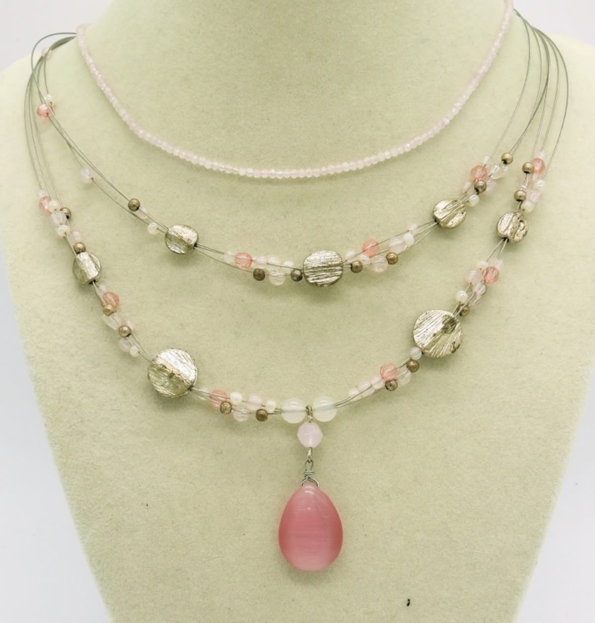 Four Beaded Necklaces with Rose Quartz, Quartz and Crystal Beads. Lengths 16″, 18″, 18.5″ & 19″.