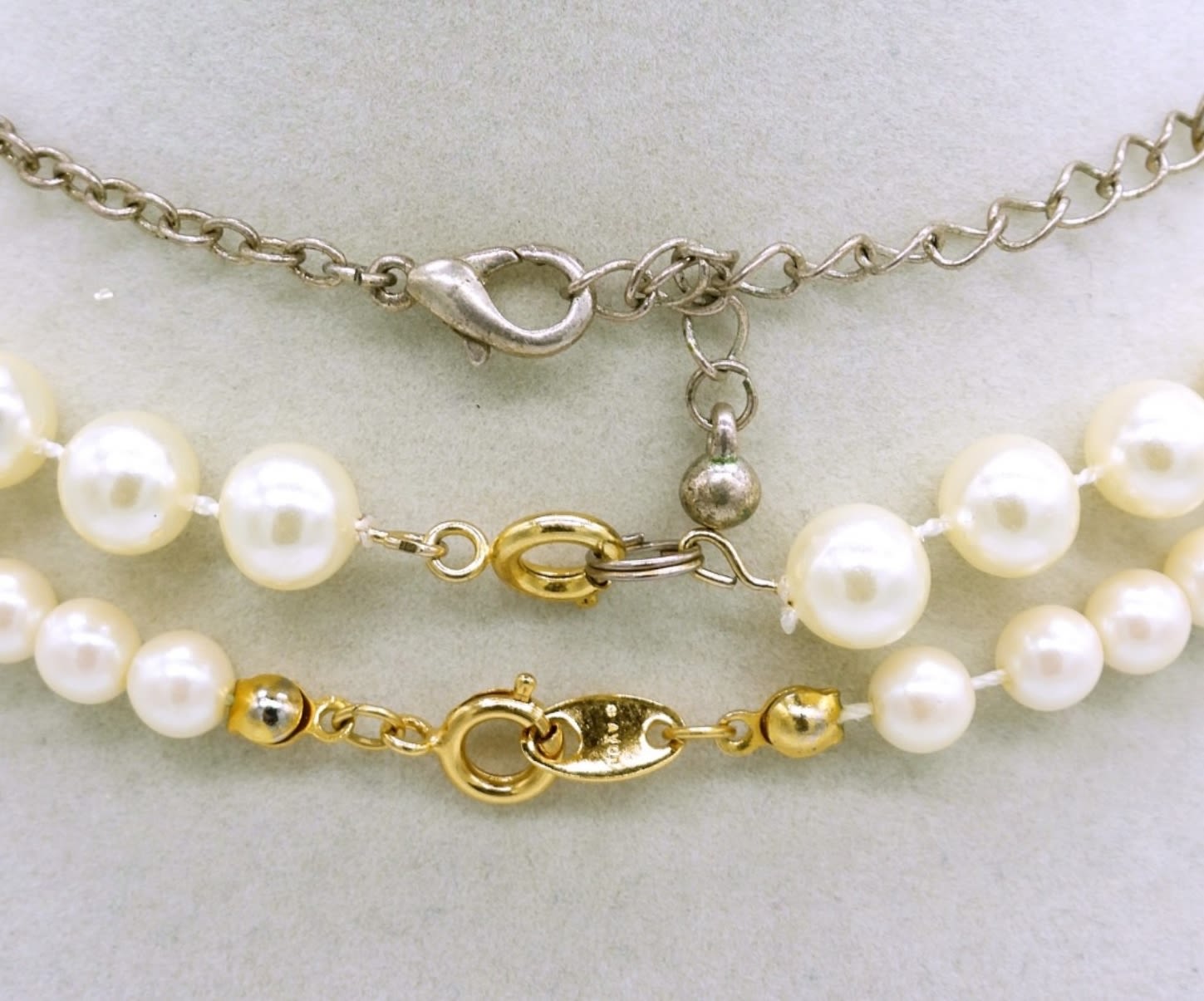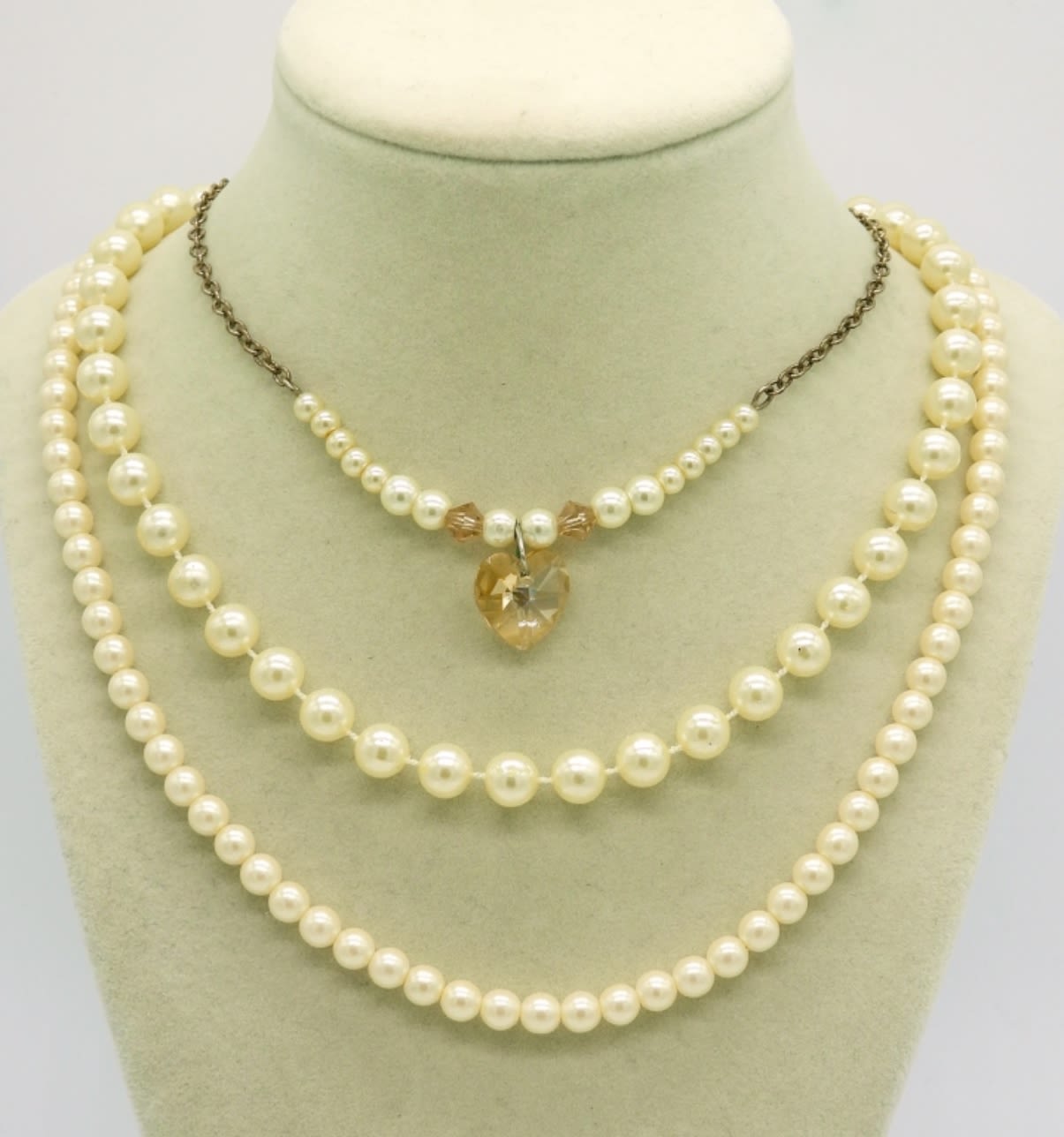 20″ Avon Pearl Necklace with gold tone clasp, 17″ Chunky Faux Pearl Necklace, 20″ Chain with pearl & crystal beads and Crystal Heart Pendant.