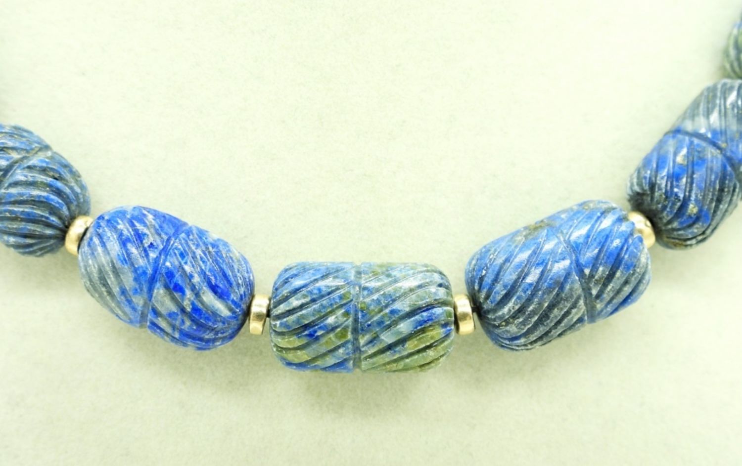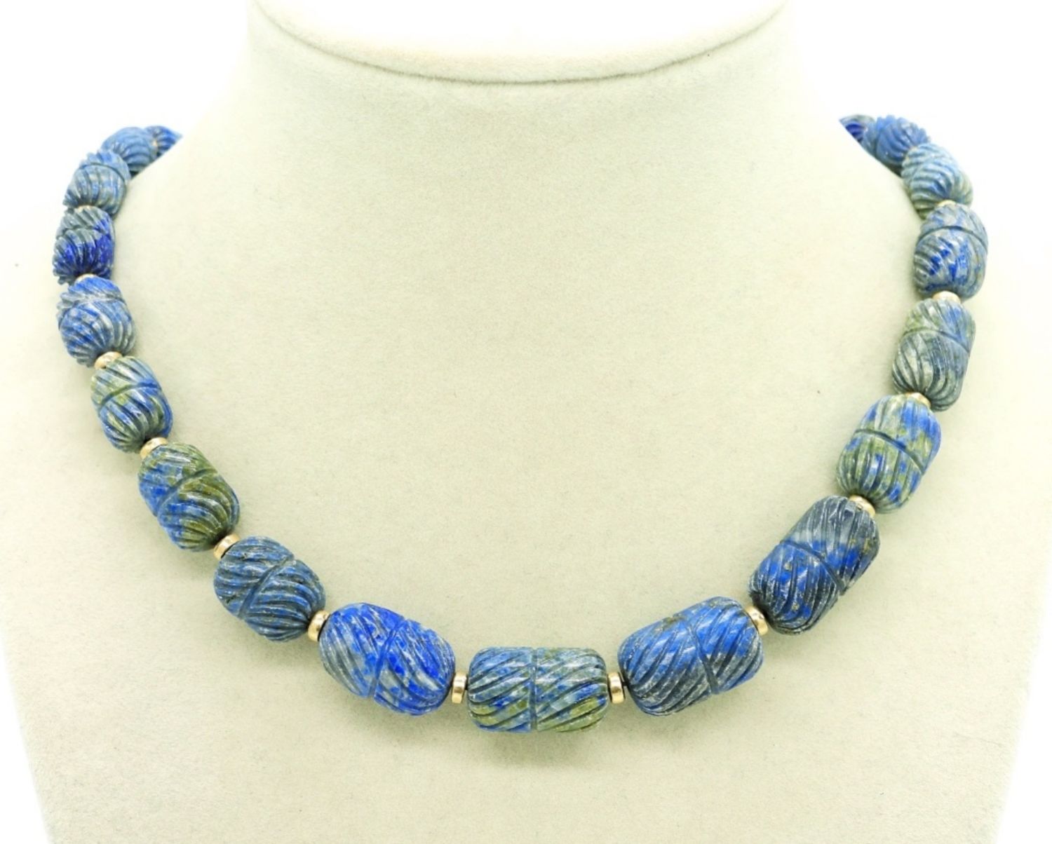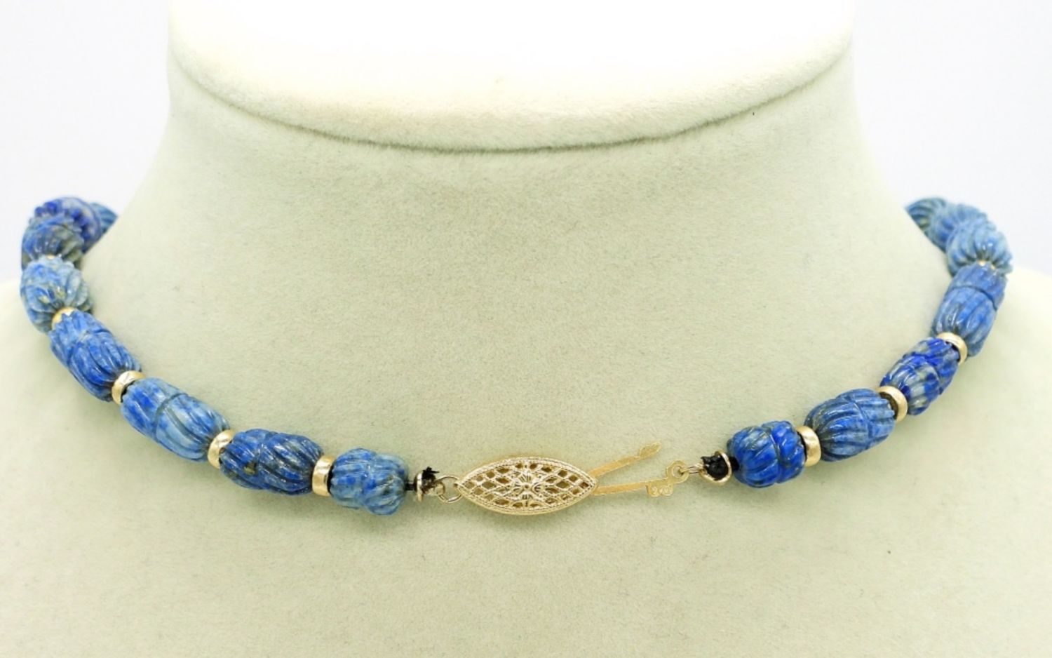 Vintage Carved Lapis Lazuli Beaded Necklace, 18″. This necklace has a good weight to it and the clasp is 14KG