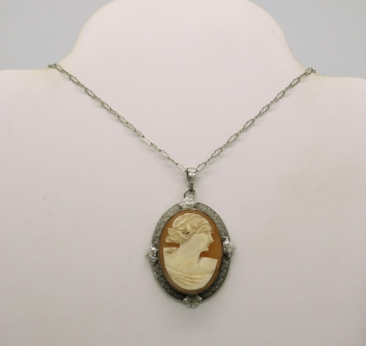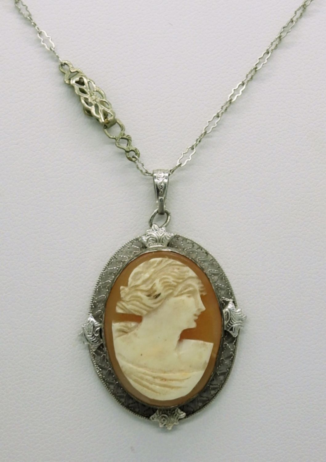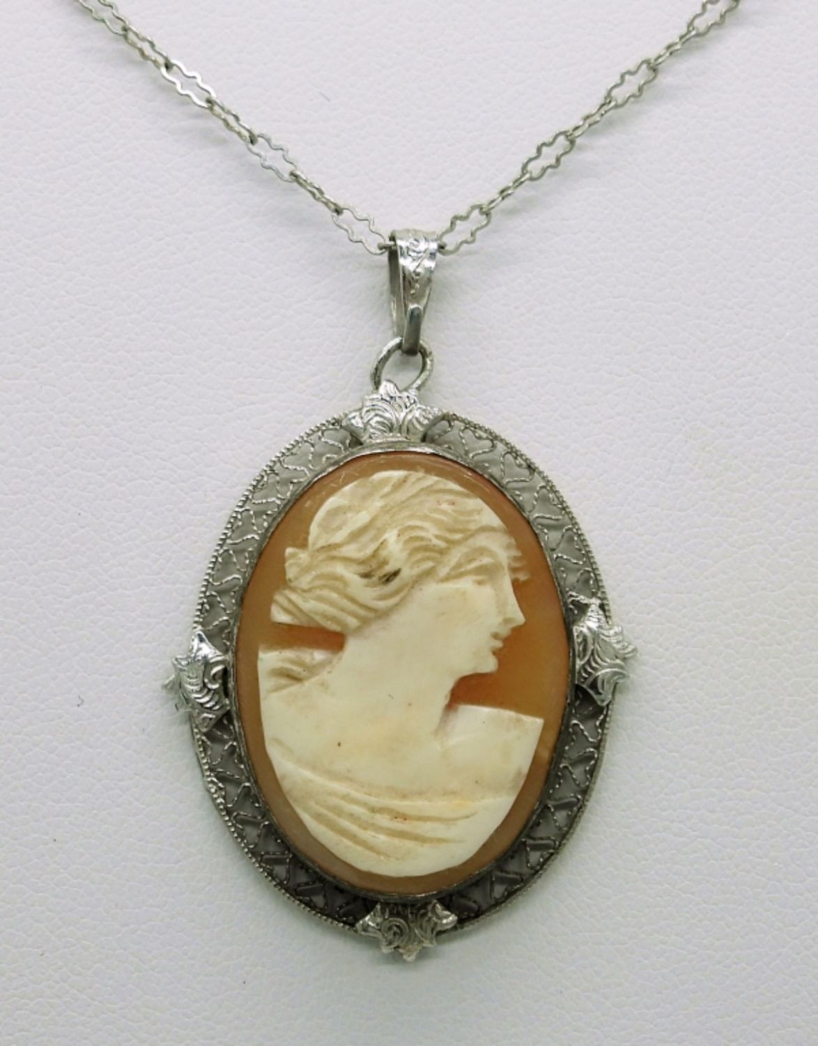 Beautiful Vintage Cameo Pendant with filigree detailing on an 18″ Gorgeous Silver Tone Chain.