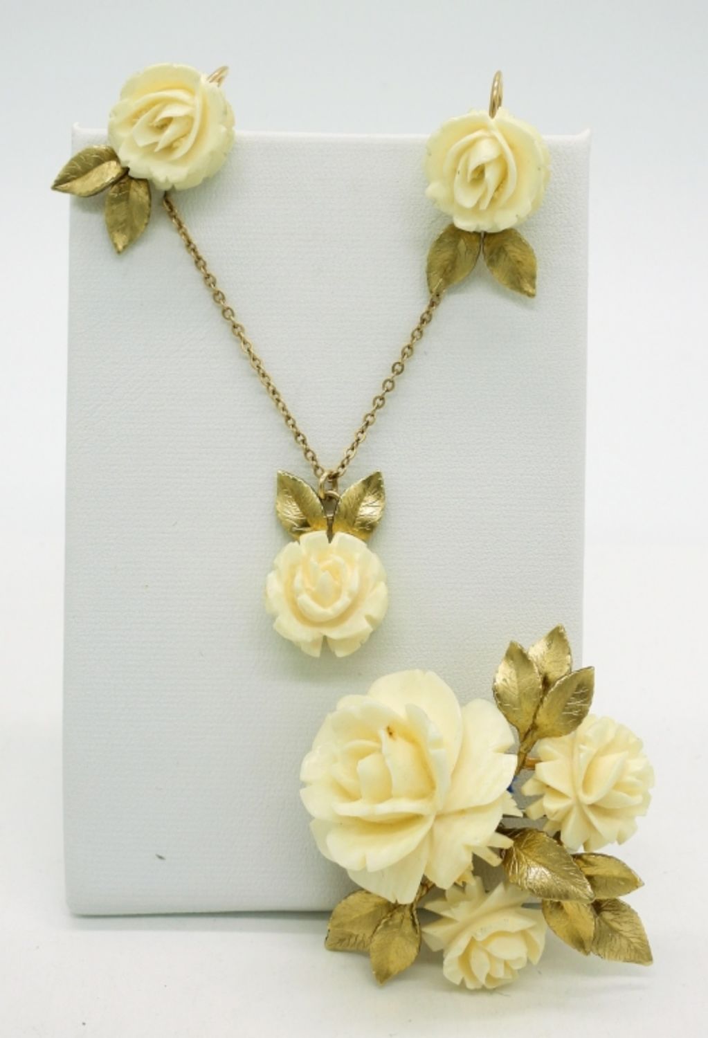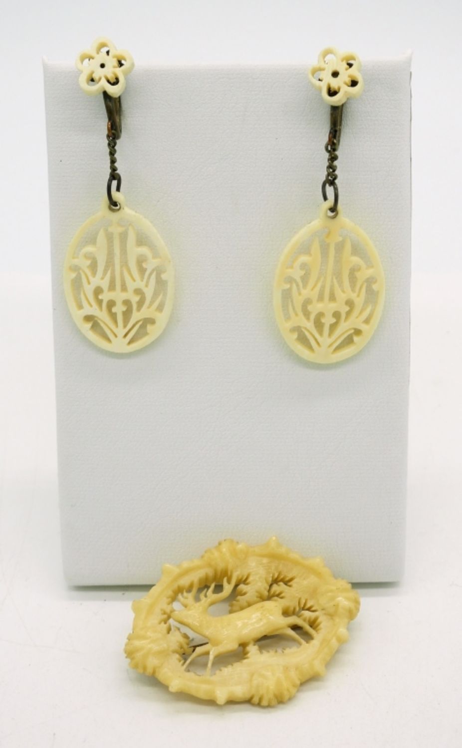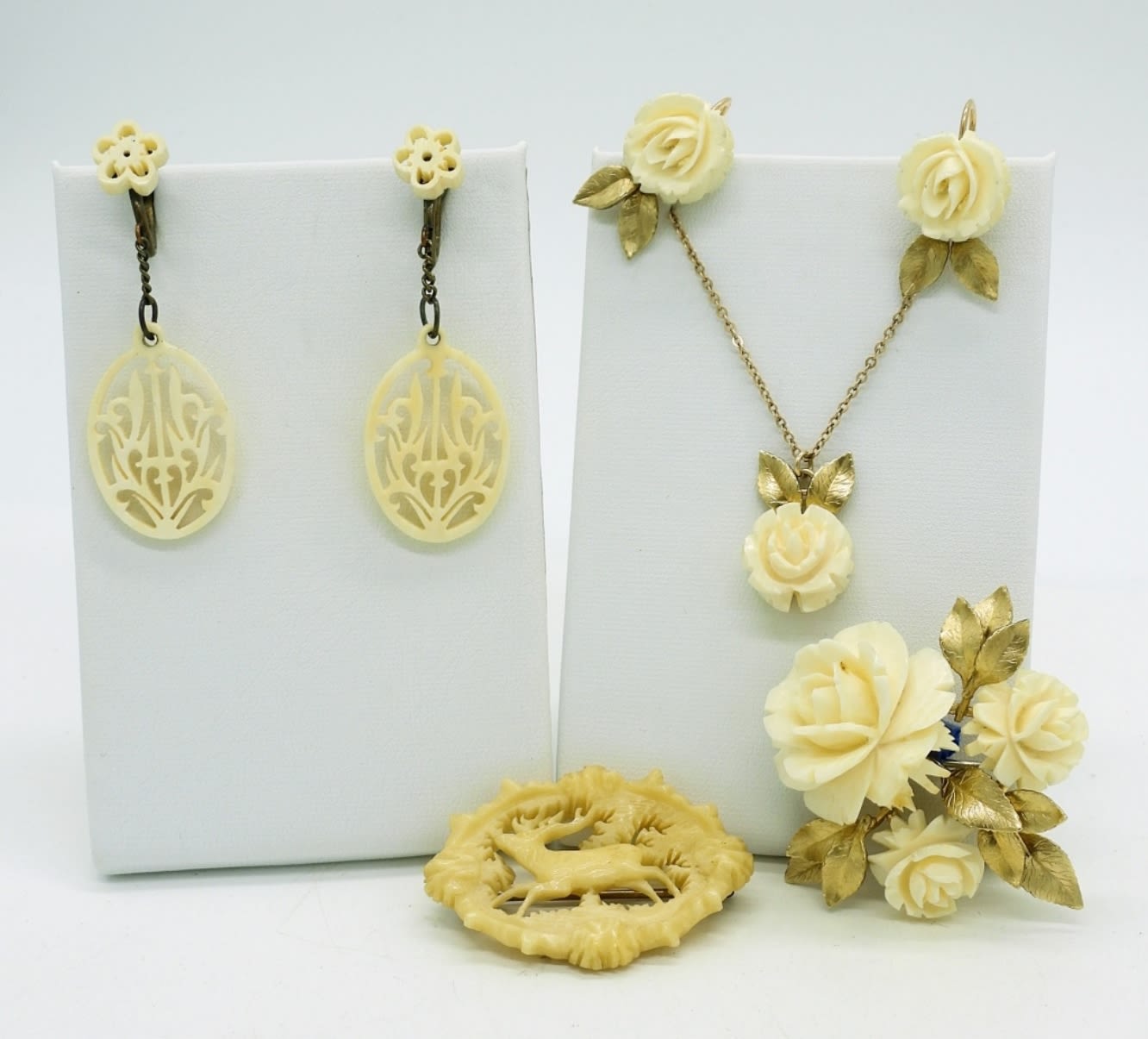 Vintage 12K Gold Filled Earrings (2Pair), Brooch & Necklace Set, Carved Celluloid Roses. Necklace is 17″. Carved Bone Brooch with Deer Scene, Measures 1.5″x 1″.
