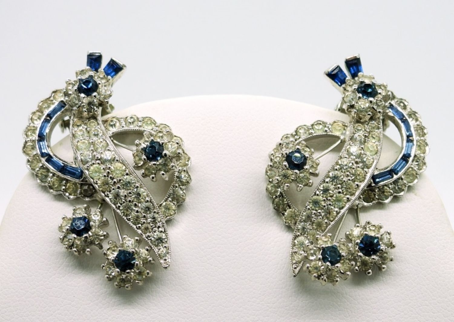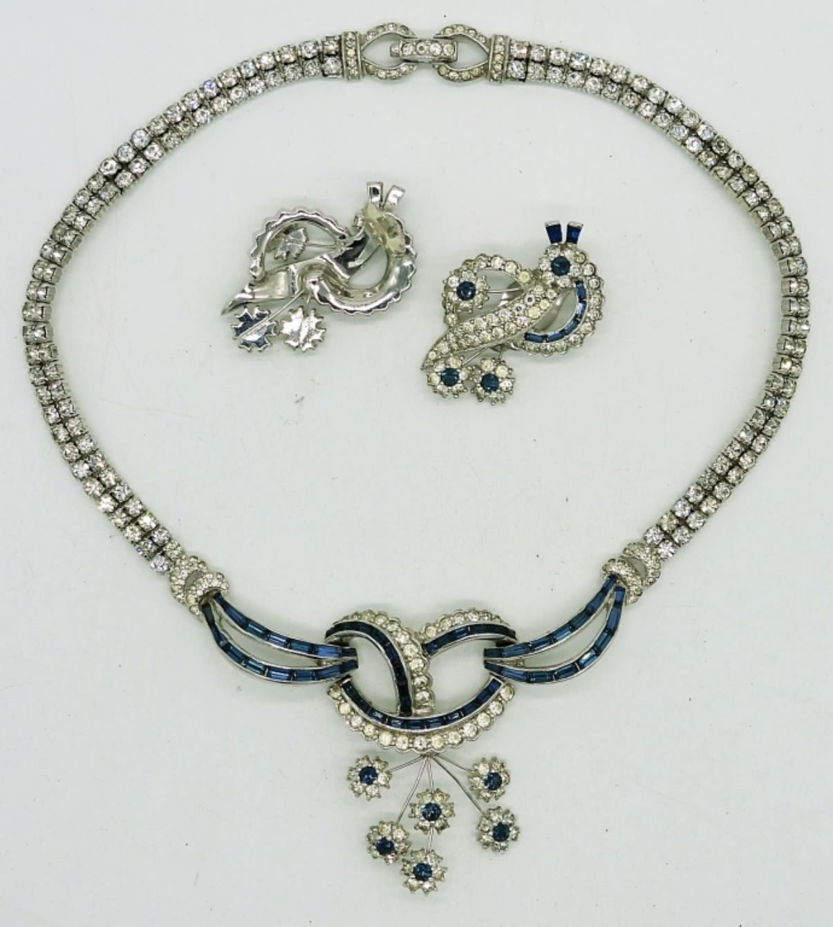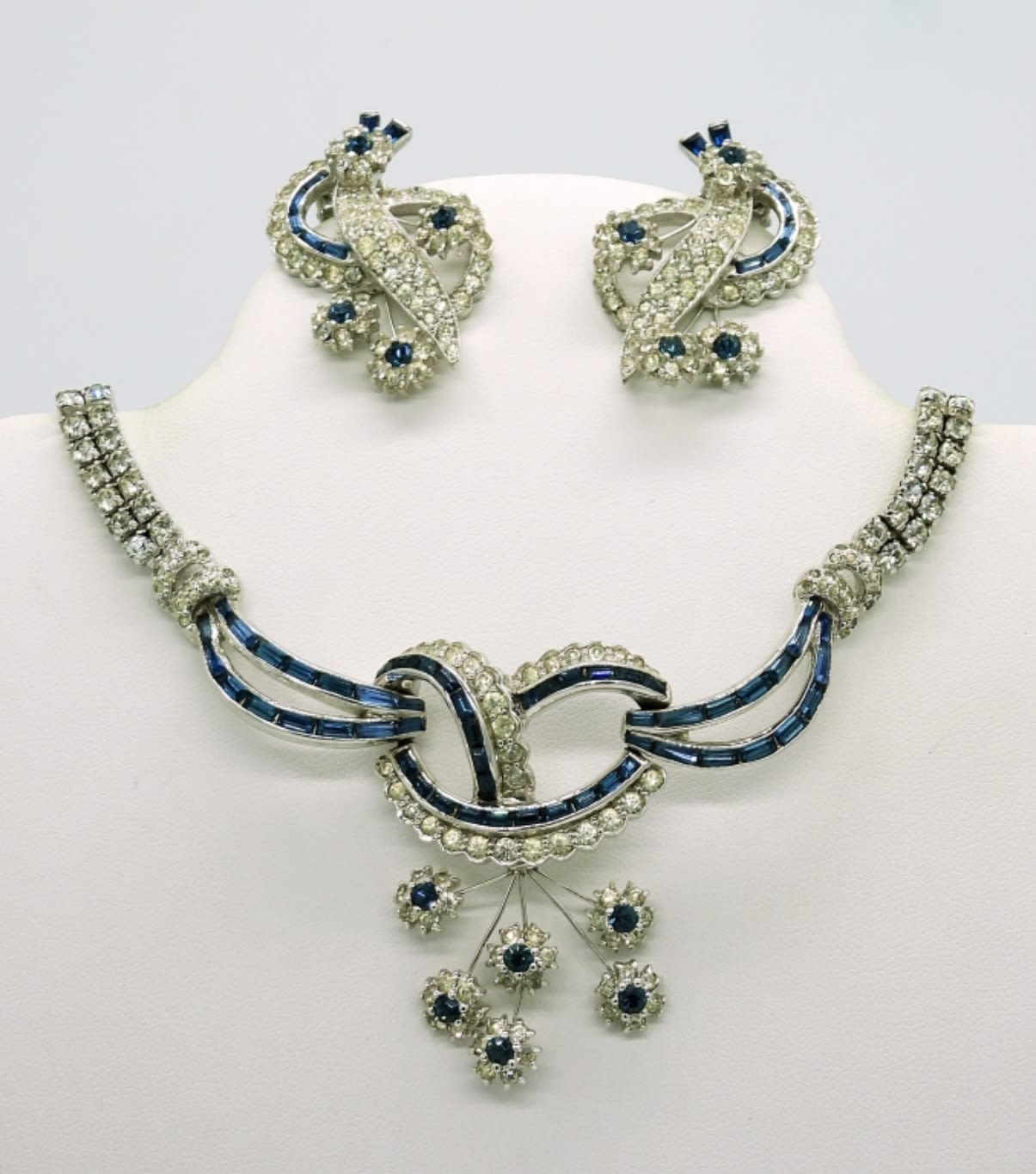 This incredibly beautiful set is “Jomaz” Brand and in incredible condition! Blue and White Rhinestones decorate every inch of the Necklace and Earrings. Necklace measures 14.5″. Earrings are Clip On.