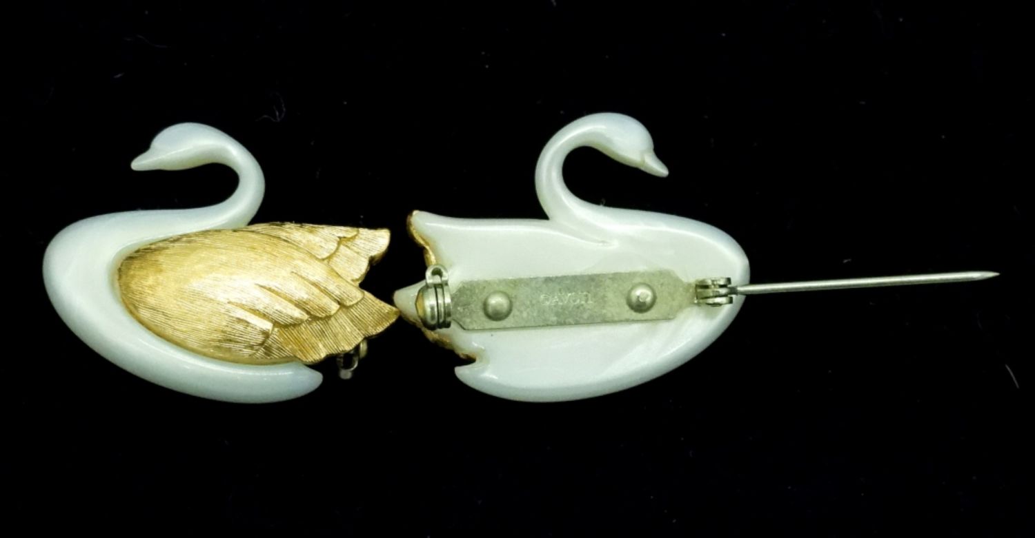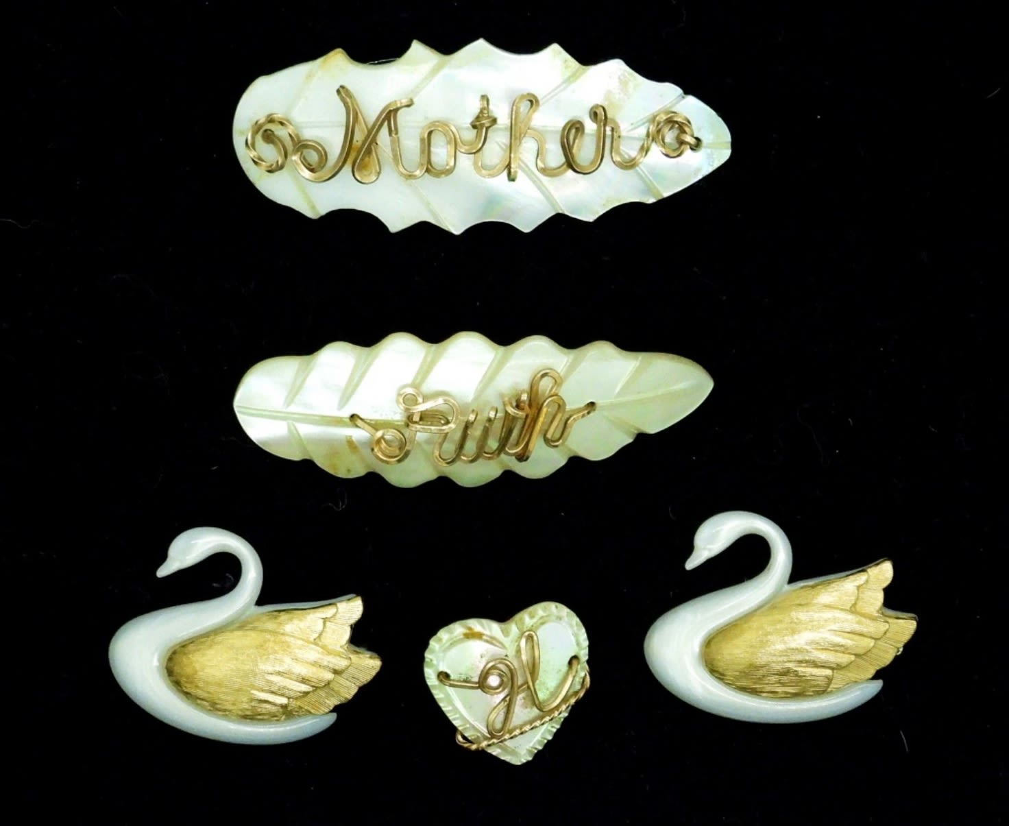 Two Avon Swan Brooches in White Mother of Pearl with Gold Tone Wings. Two Leaf Mother of Pearl Brooches, One says “Mother” in gold tone Wire and the other says “Ruth”. Small Heart shaped Mother of Pearl Pin with “H” in gold tone wire.