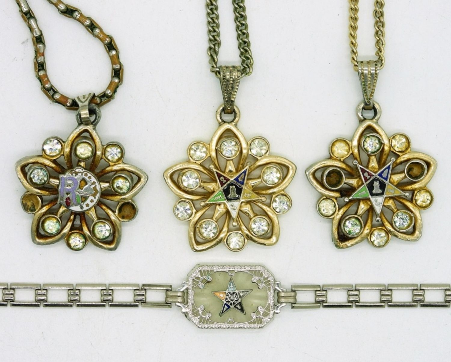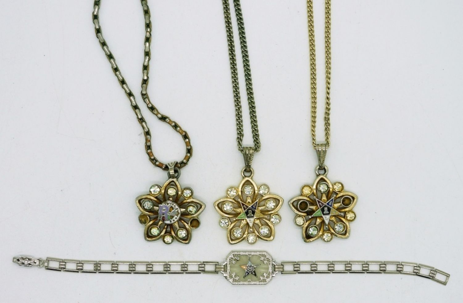 Two Starburst Pendants with the Masonic Icon in gold tone, chains are 19″. One Starburst pendant with the Daughters of Rebekah Icon in gold tone, chain is 16″. Silver tone Etched Glass Bracelet with the Masonic Icon, 7″.