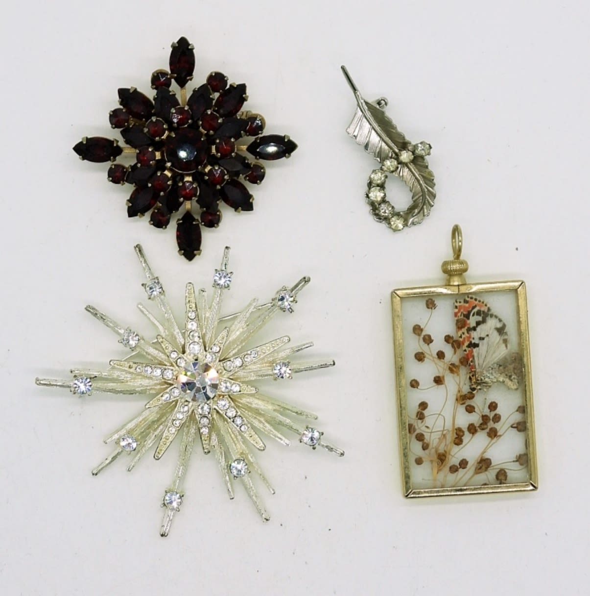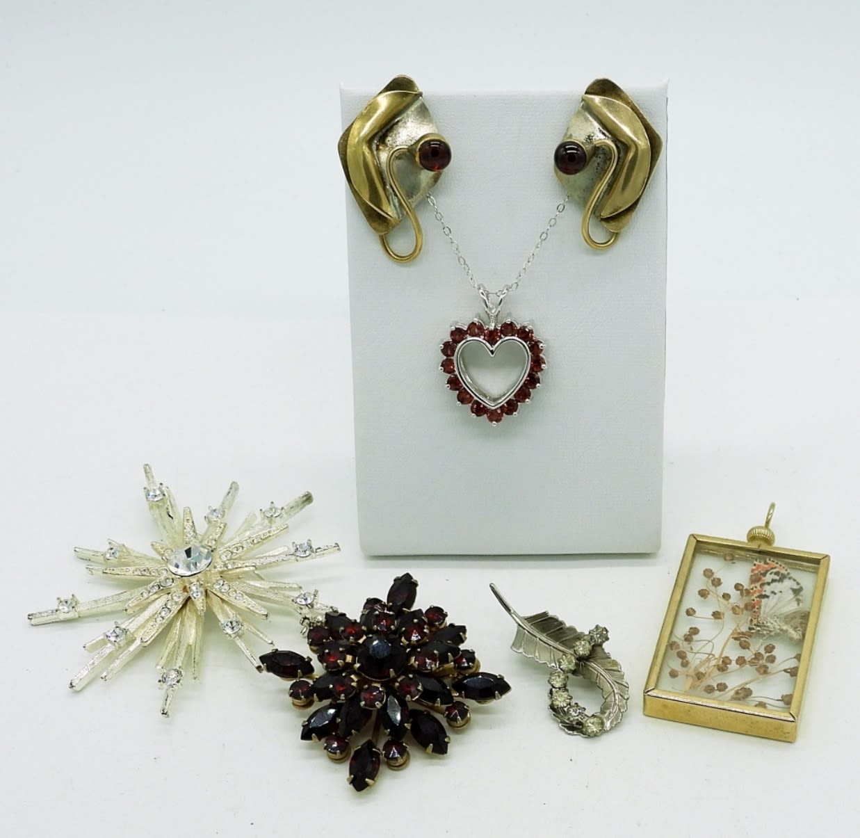 Three Vintage Brooches, Garnet & Clear Rhinestone (2.5″, 1.5″, 1″). Gold tone Butterfly Pendant (2″x1″). Double Sided Heart Gemstone Pendant in Silver tone, Garnet colored gemstones on one side and clear gemstones on the other, chain measures 18″. Vintage Gold tone pierced earrings with Garnet Colored Gemstones,