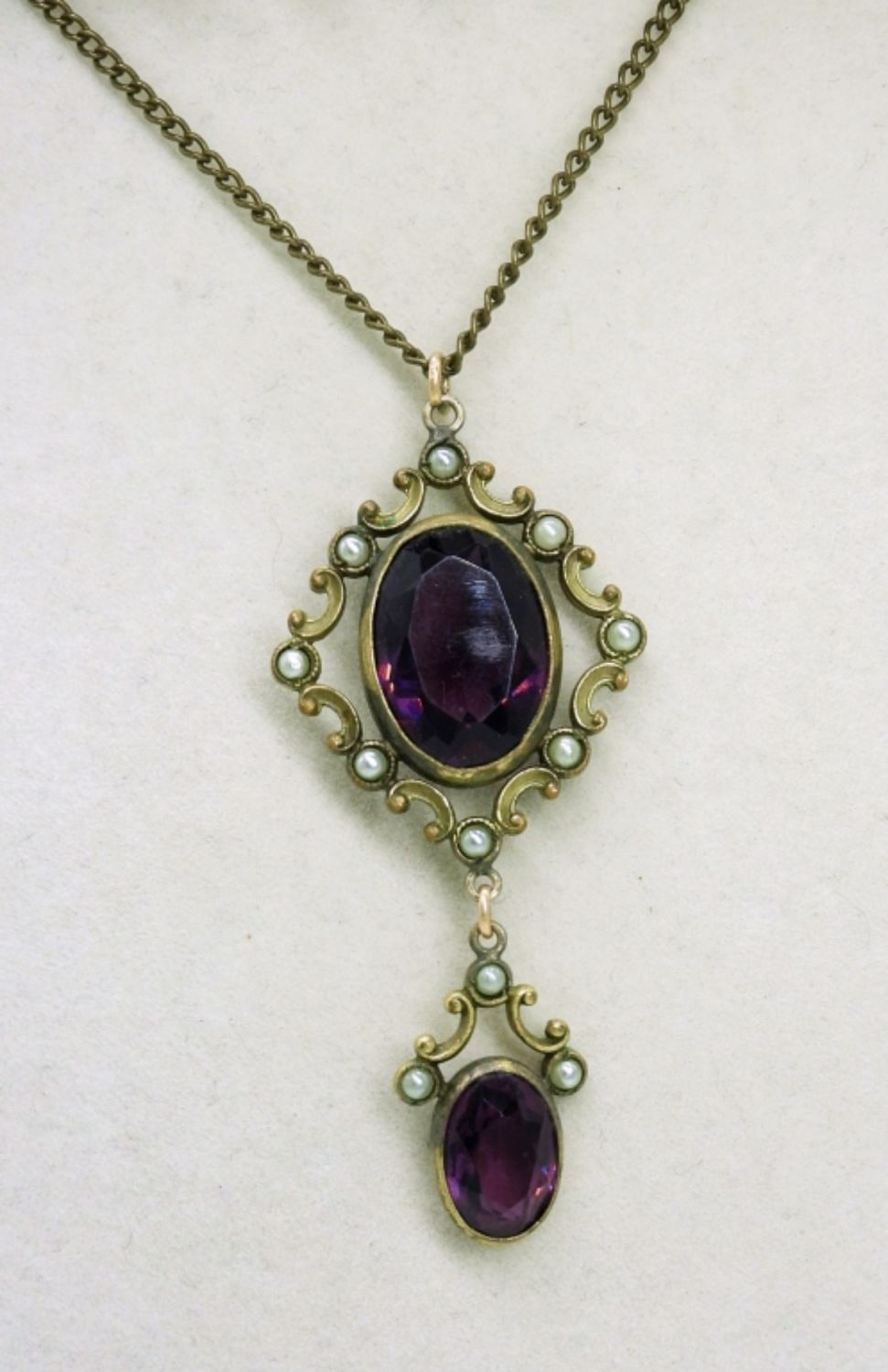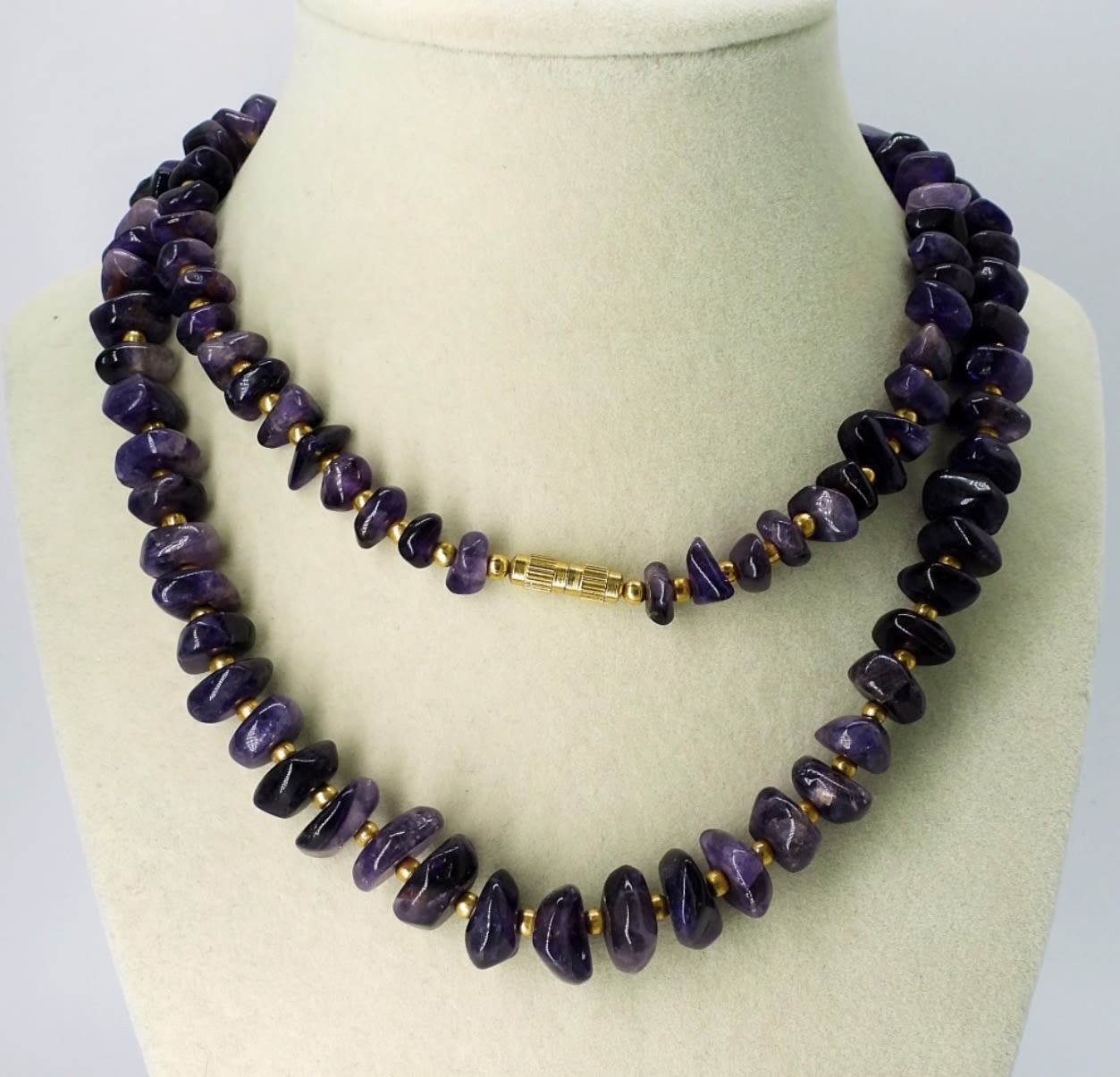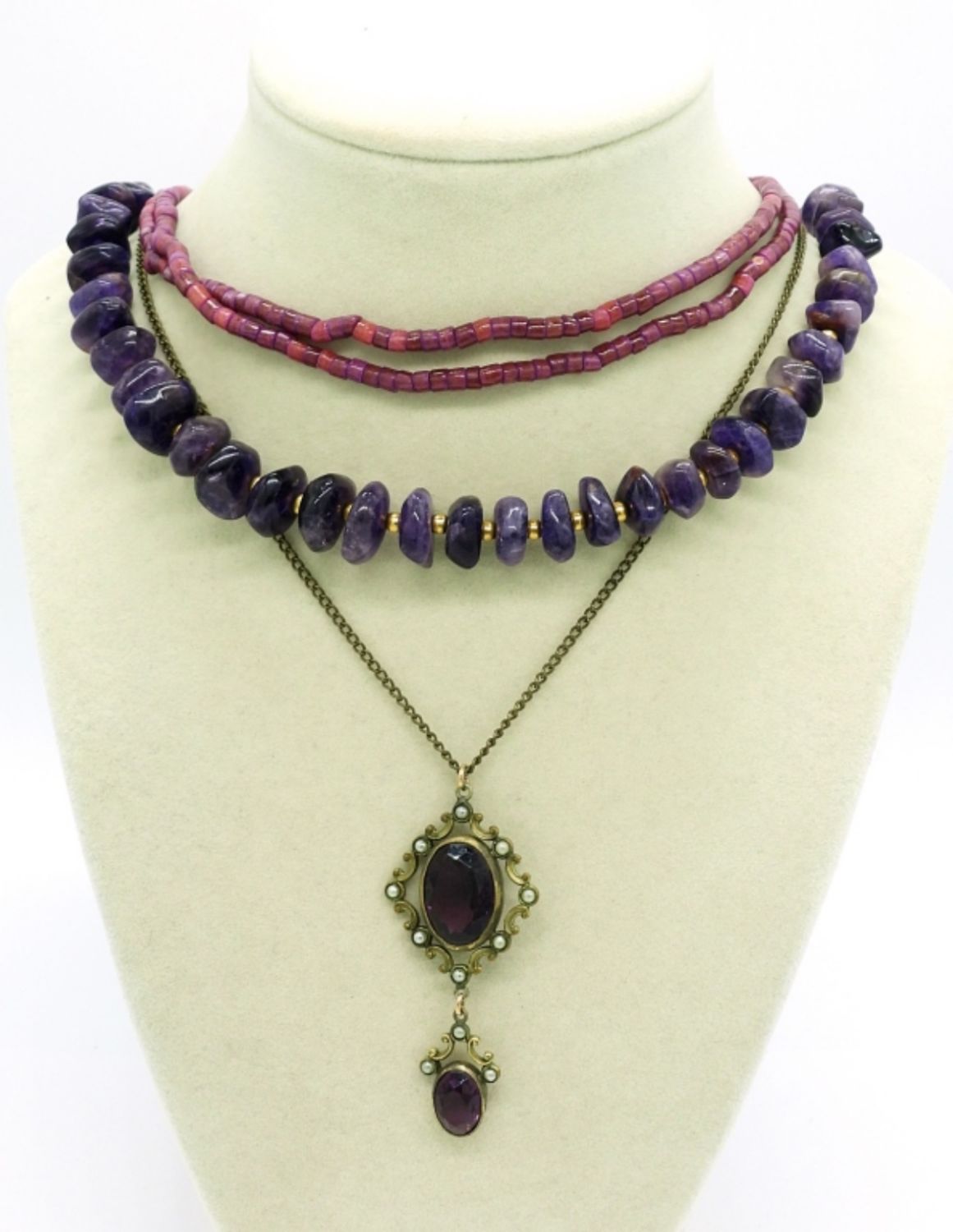 Large Amethyst Gemstone Beads with gold tone beads, 30″. Absolutely Stunning! Purple Beaded Necklace 30″. Fun antique looking bronze colored necklace with a purple gemstone, 18″ adjustable.
